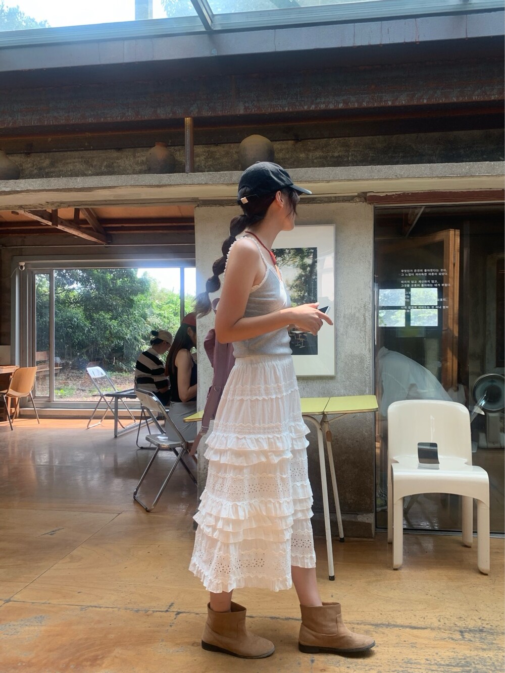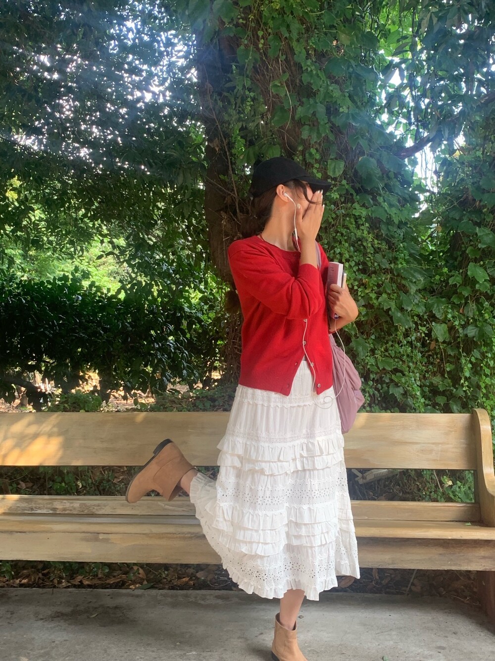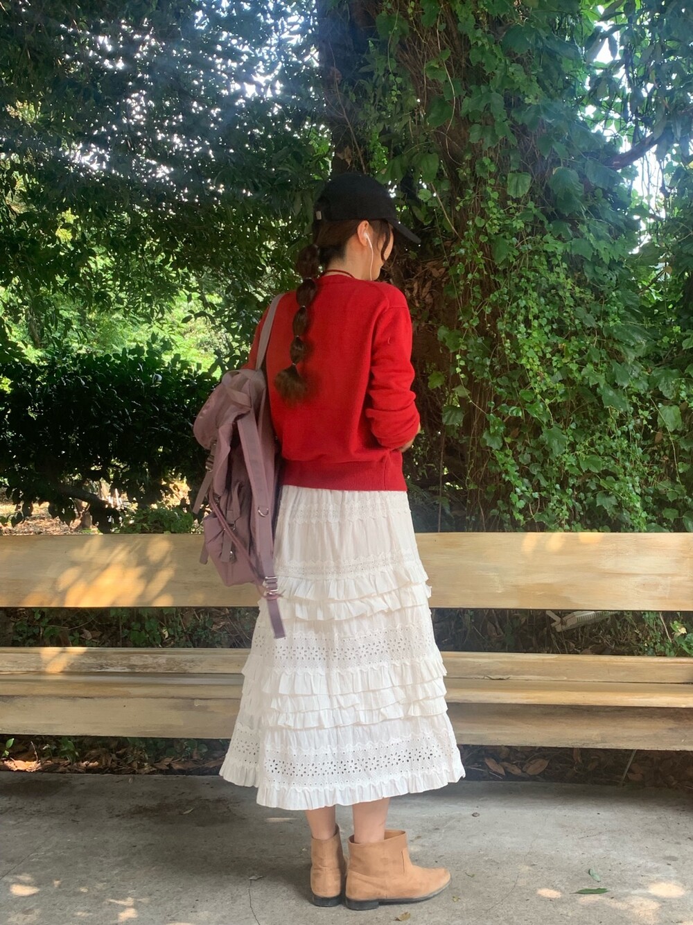 스커트만으로 드레스업! 되는 제품이라 가디건, 블라우스 등 심플한 아이템과 매치했을때