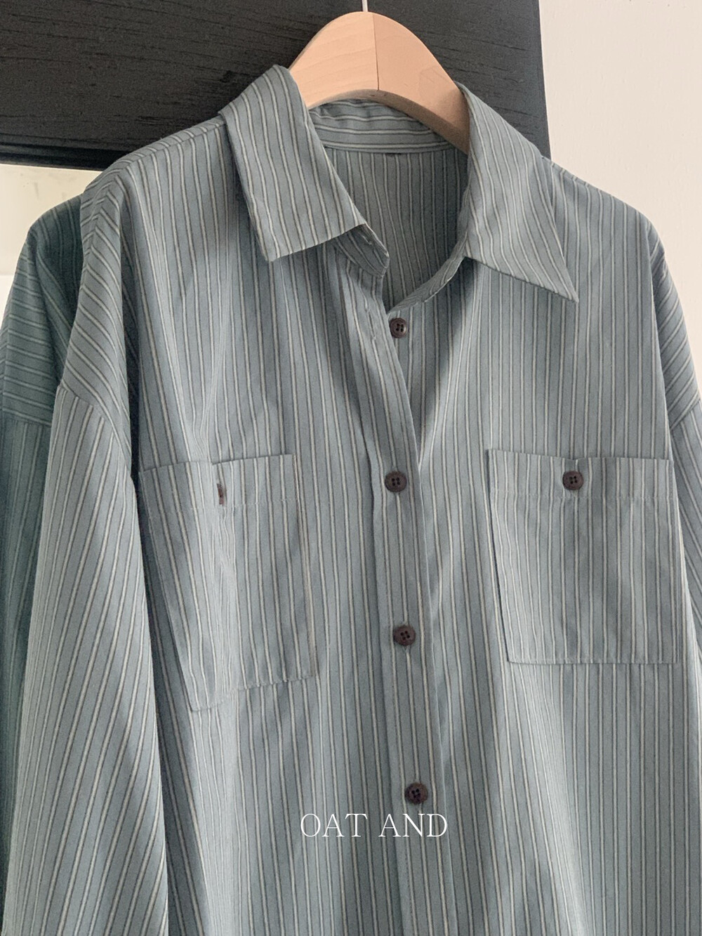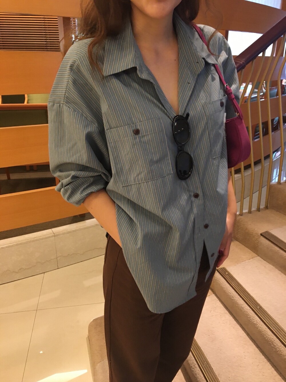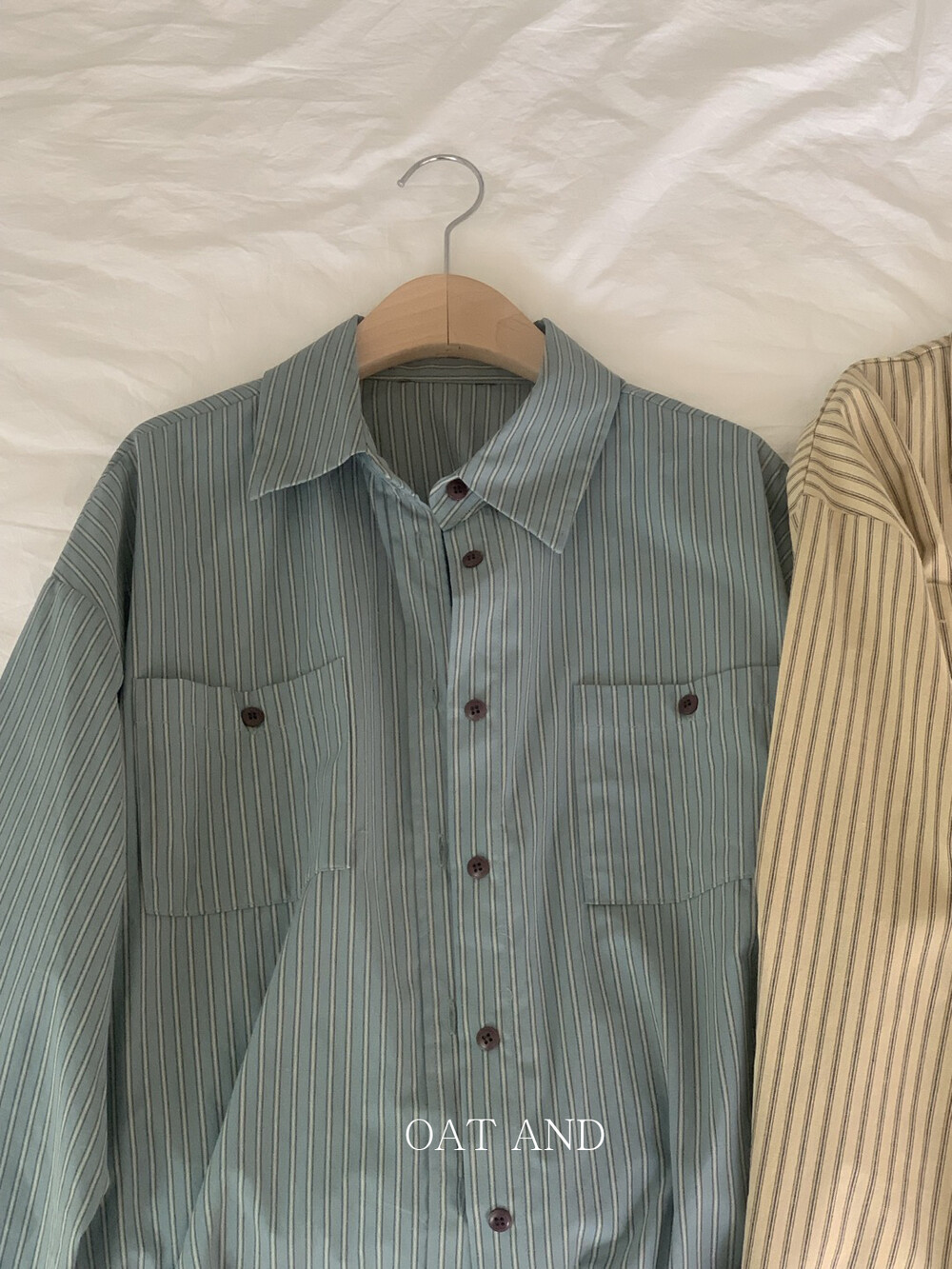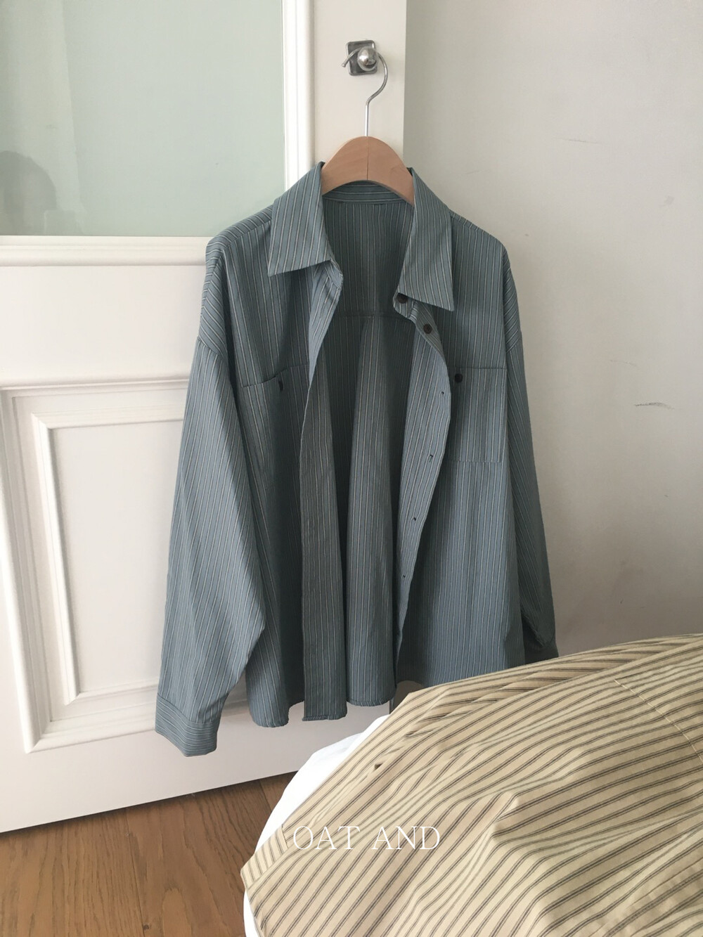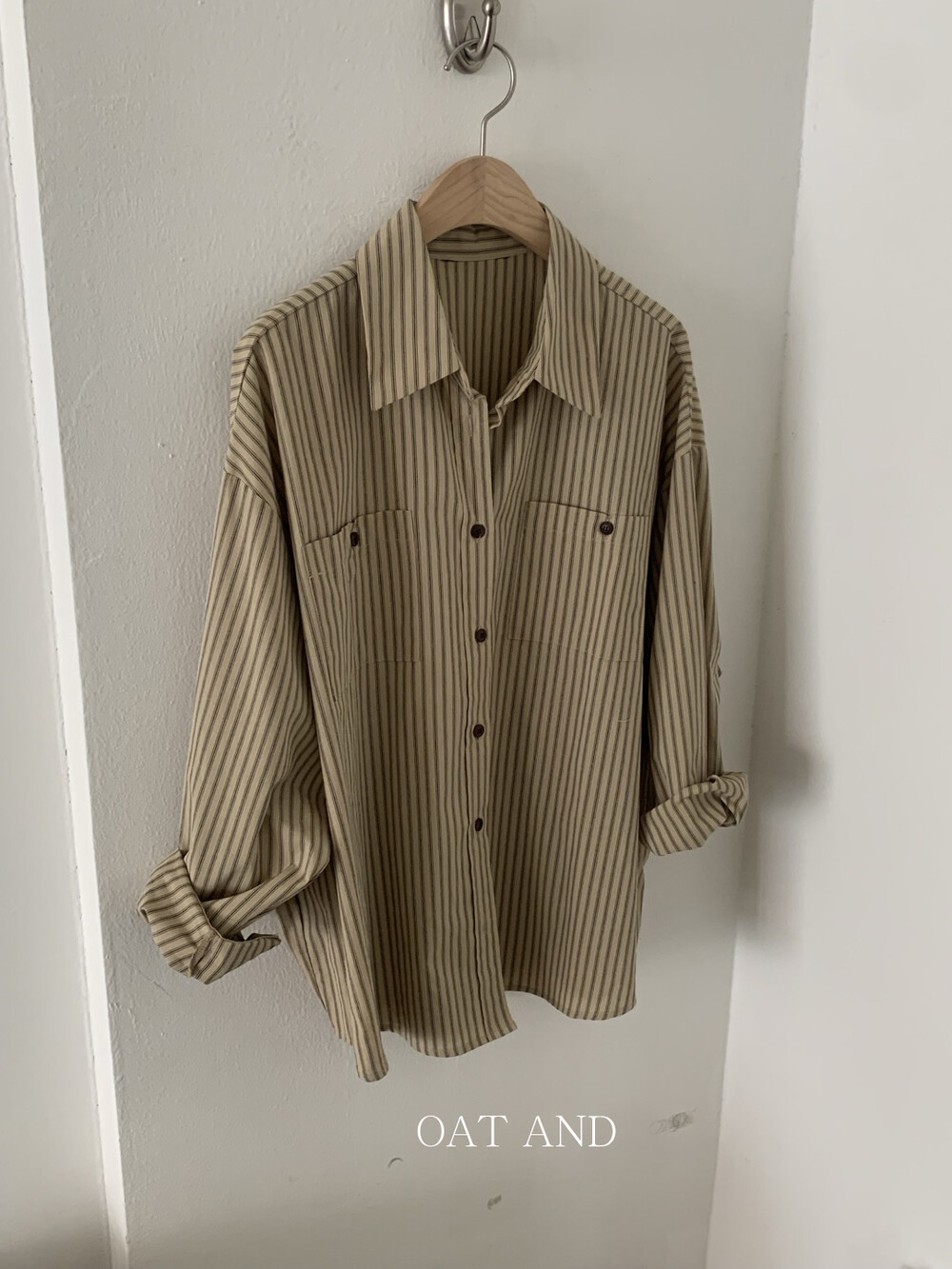 세련된 스트라이프 패턴과 여유 있는 루즈핏 실루엣이 매력적인 셔츠입니다.