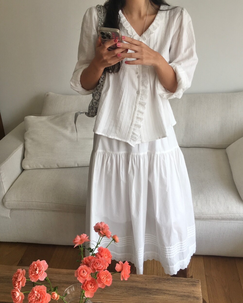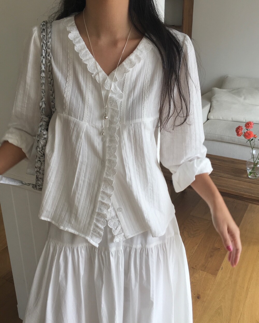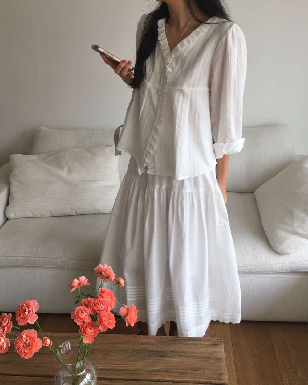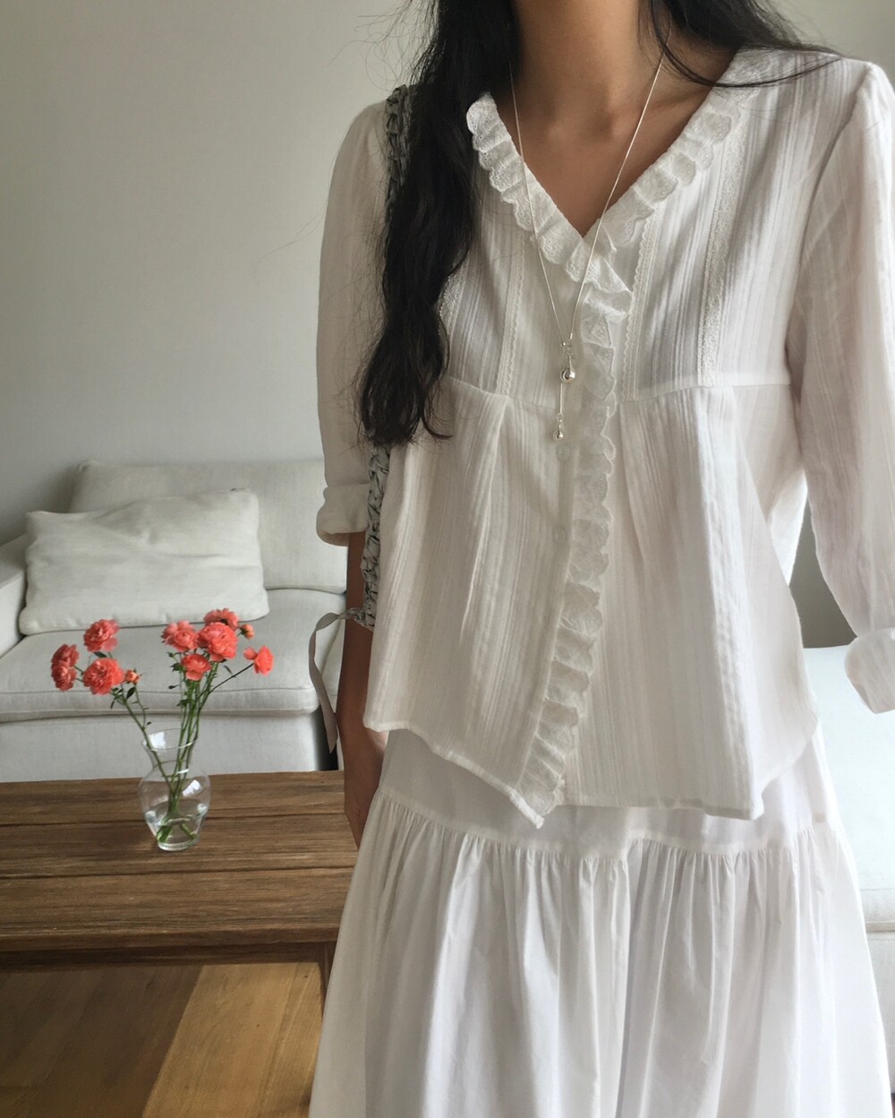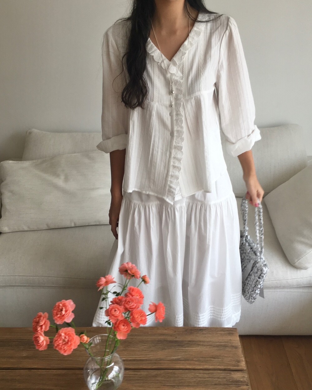 넥라인을 따라 흐르는 섬세한 펀칭 레이스와 프릴 디테일이 얼굴을 한층 더 작고 화사하게 만들어준답니다.