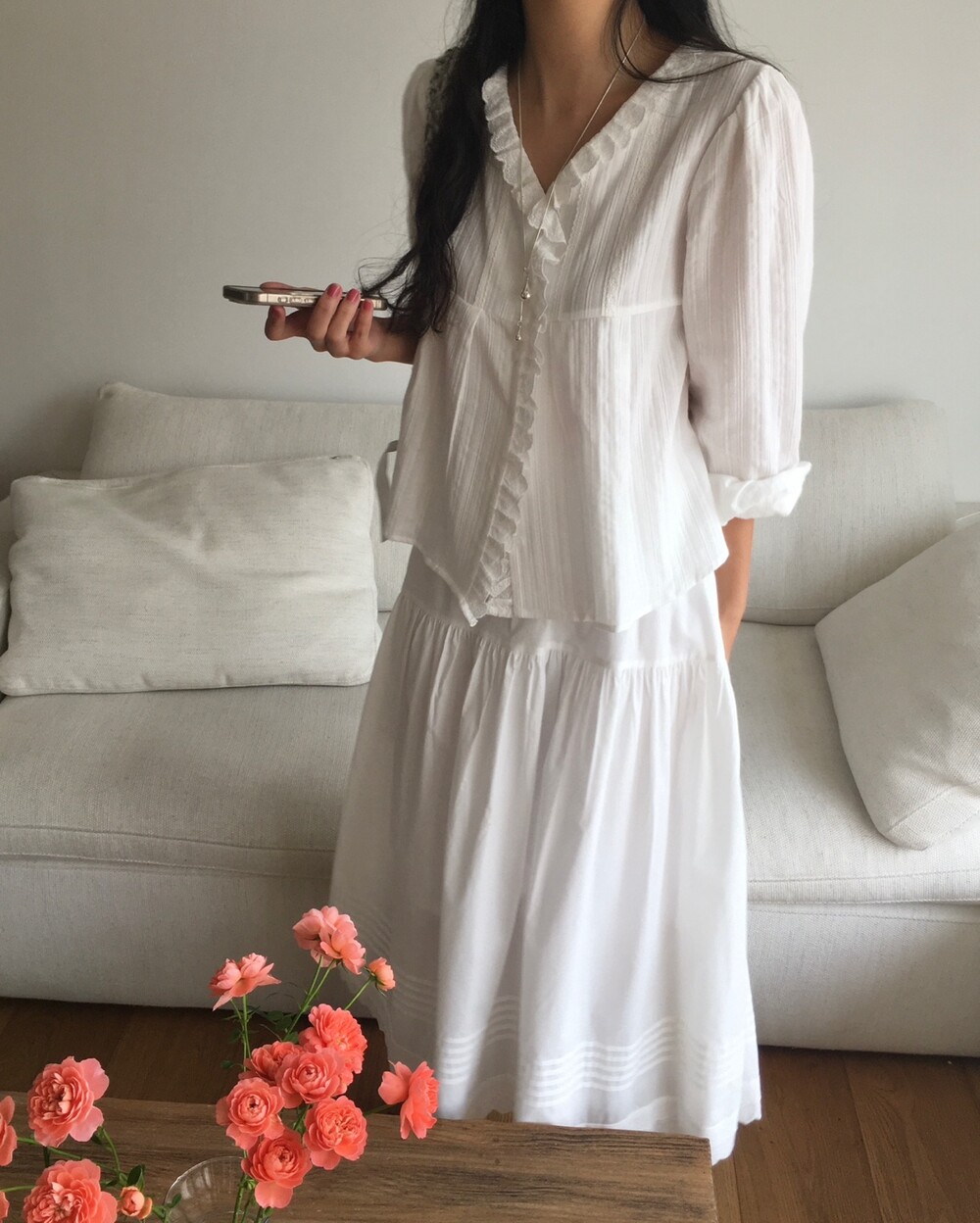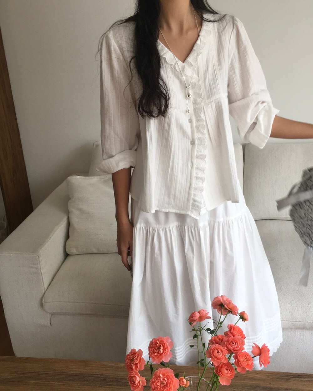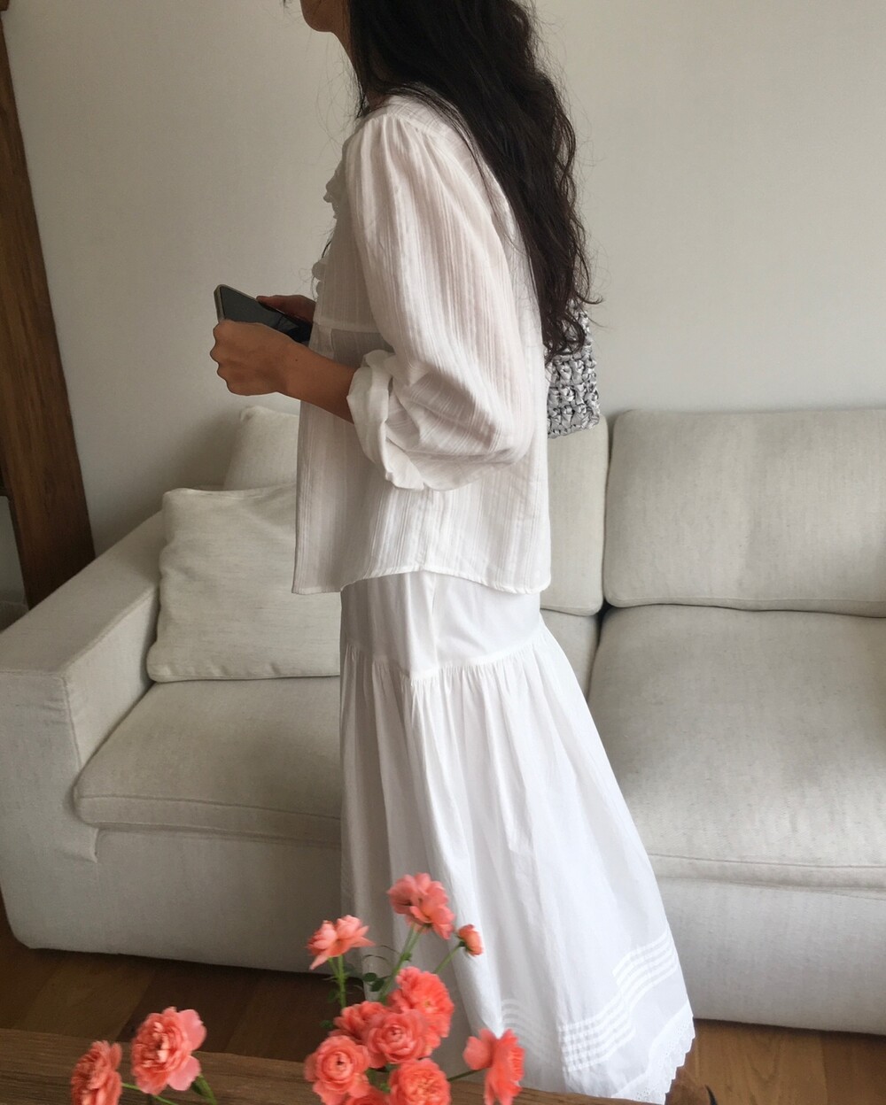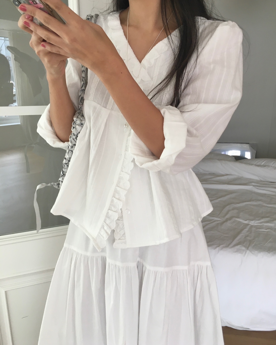 넥라인을 따라 흐르는 섬세한 펀칭 레이스와 프릴 디테일이 얼굴을 한층 더 작고 화사하게 만들어준답니다.