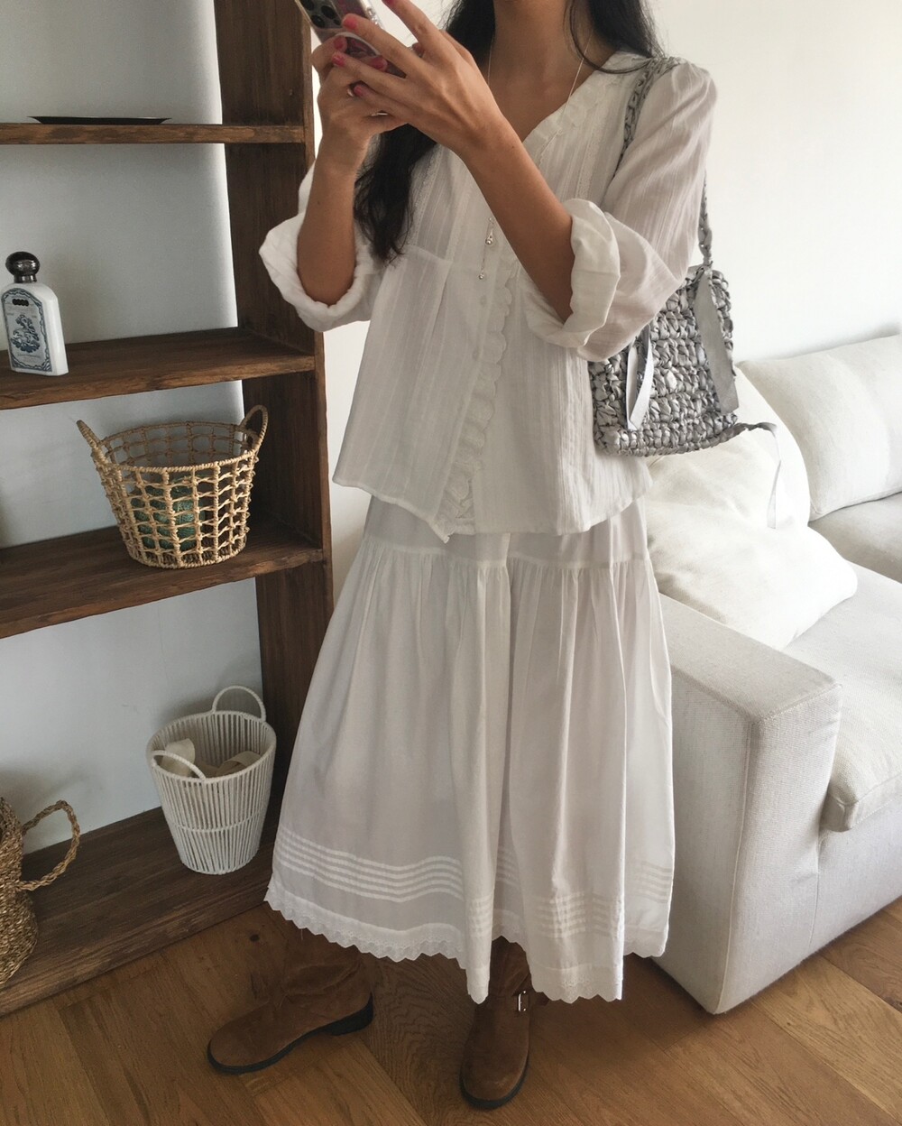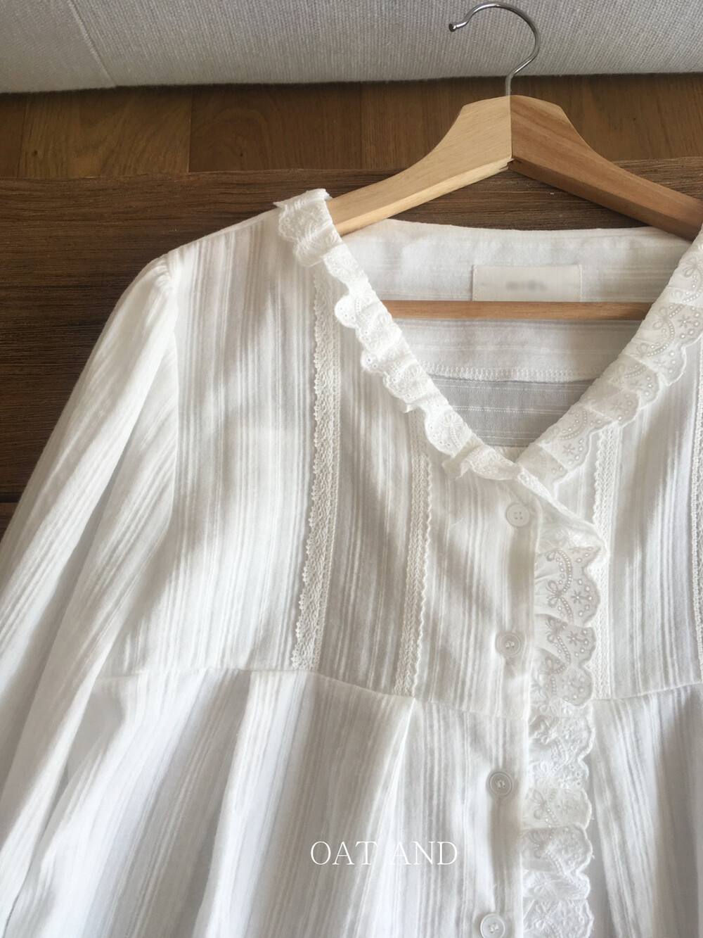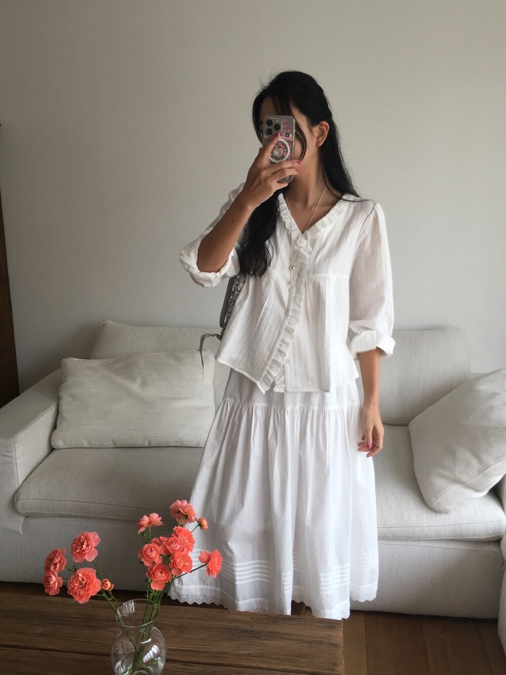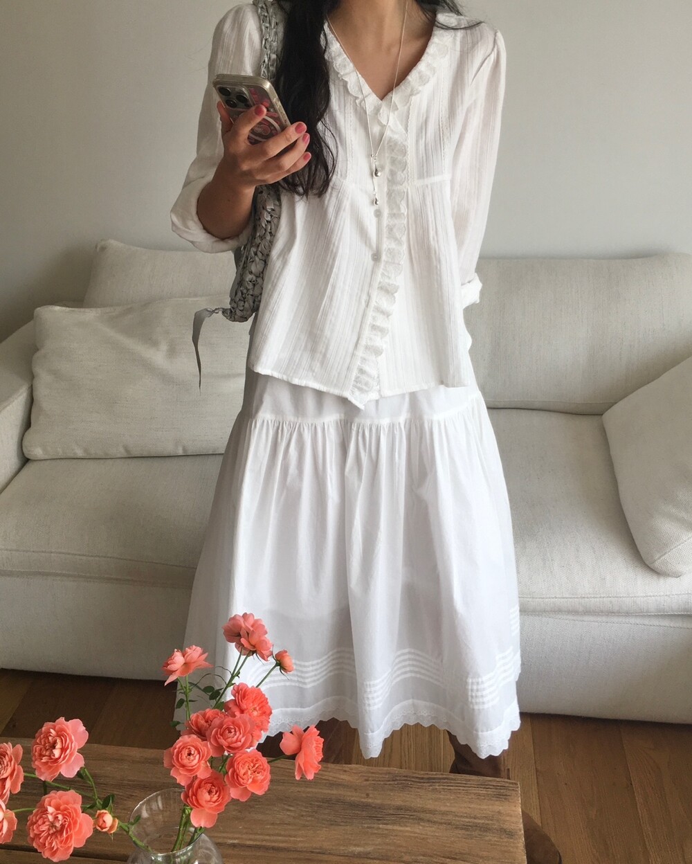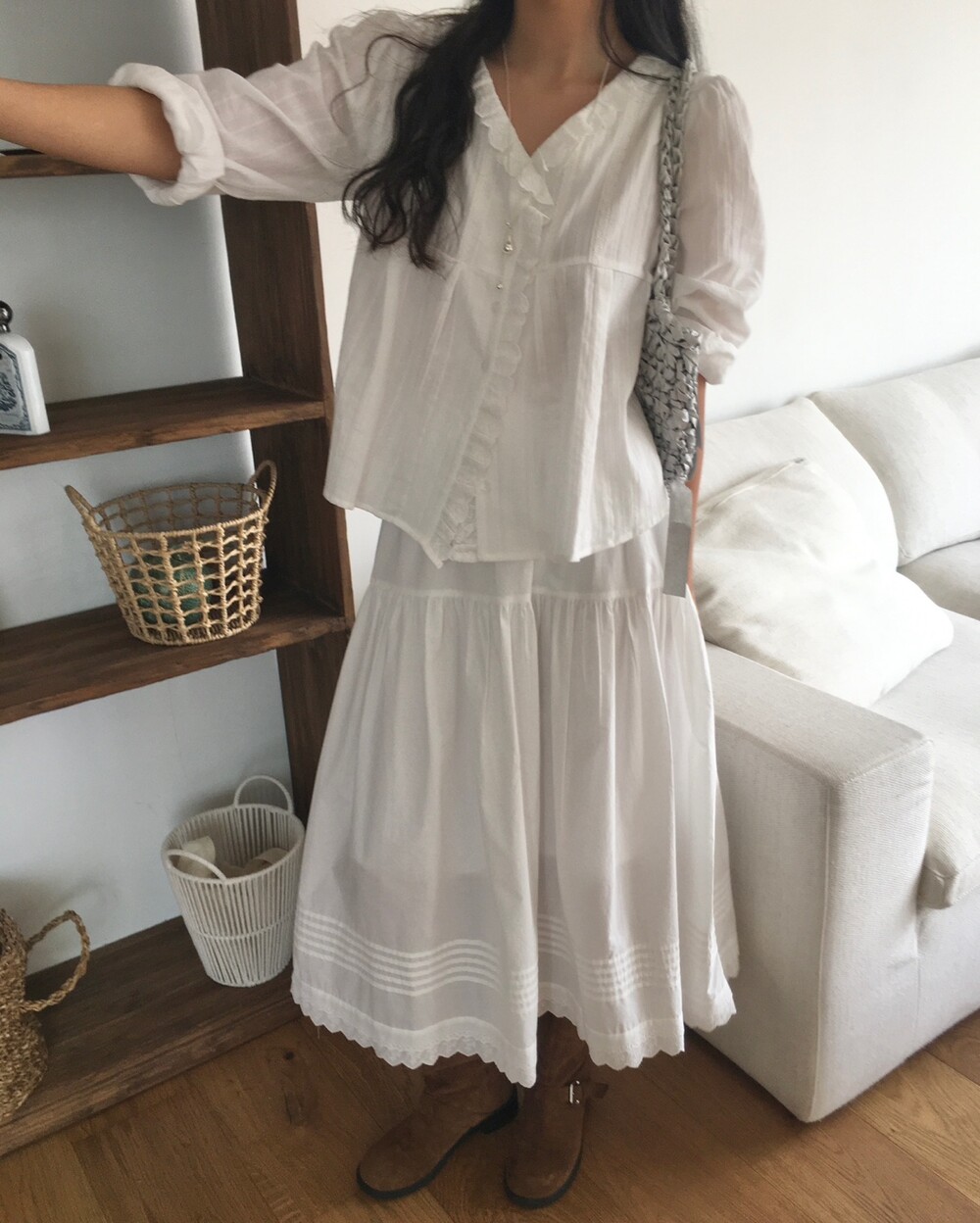 넥라인을 따라 흐르는 섬세한 펀칭 레이스와 프릴 디테일이 얼굴을 한층 더 작고 화사하게 만들어준답니다.