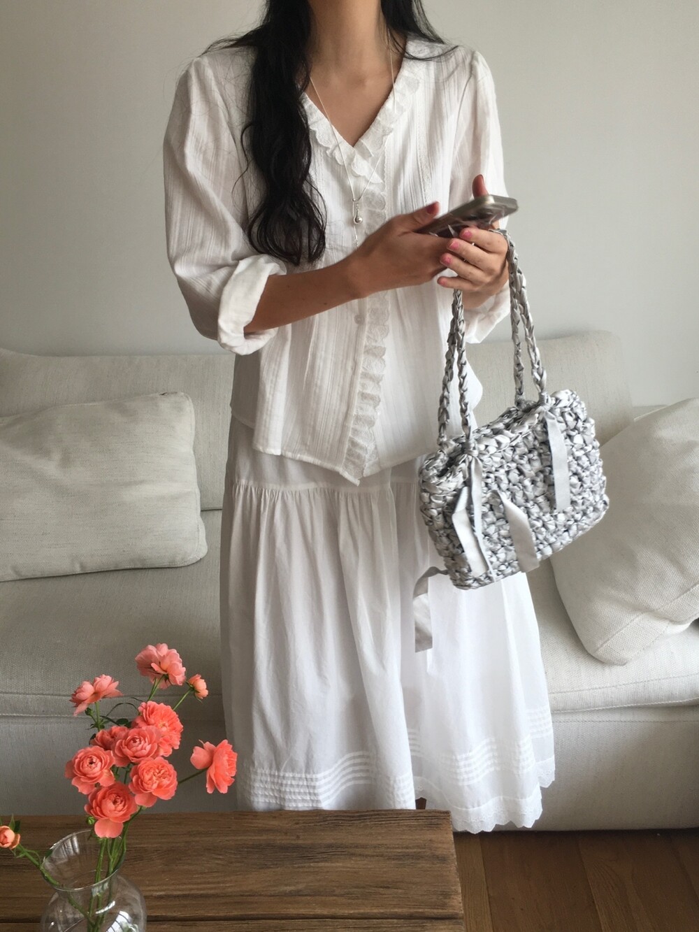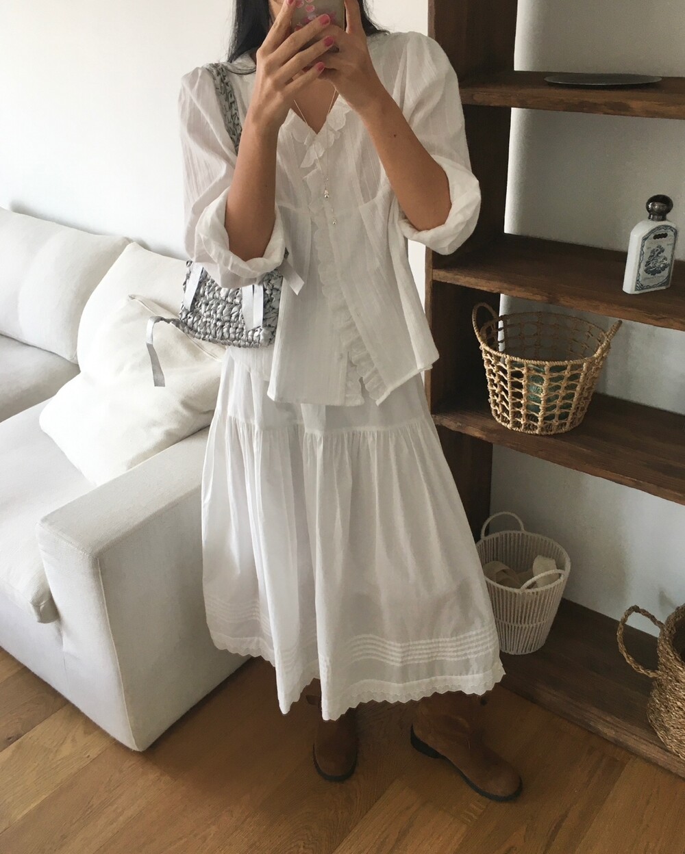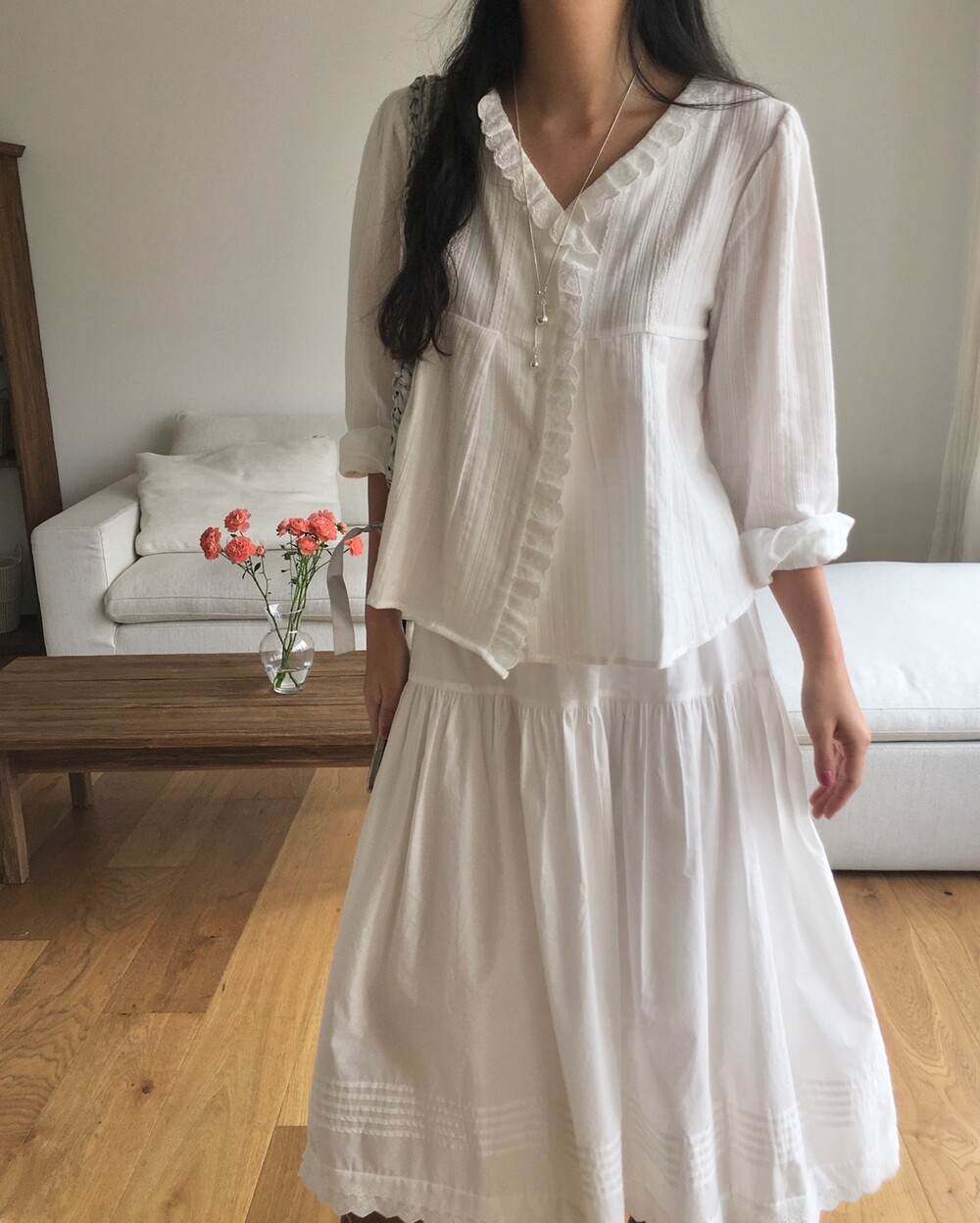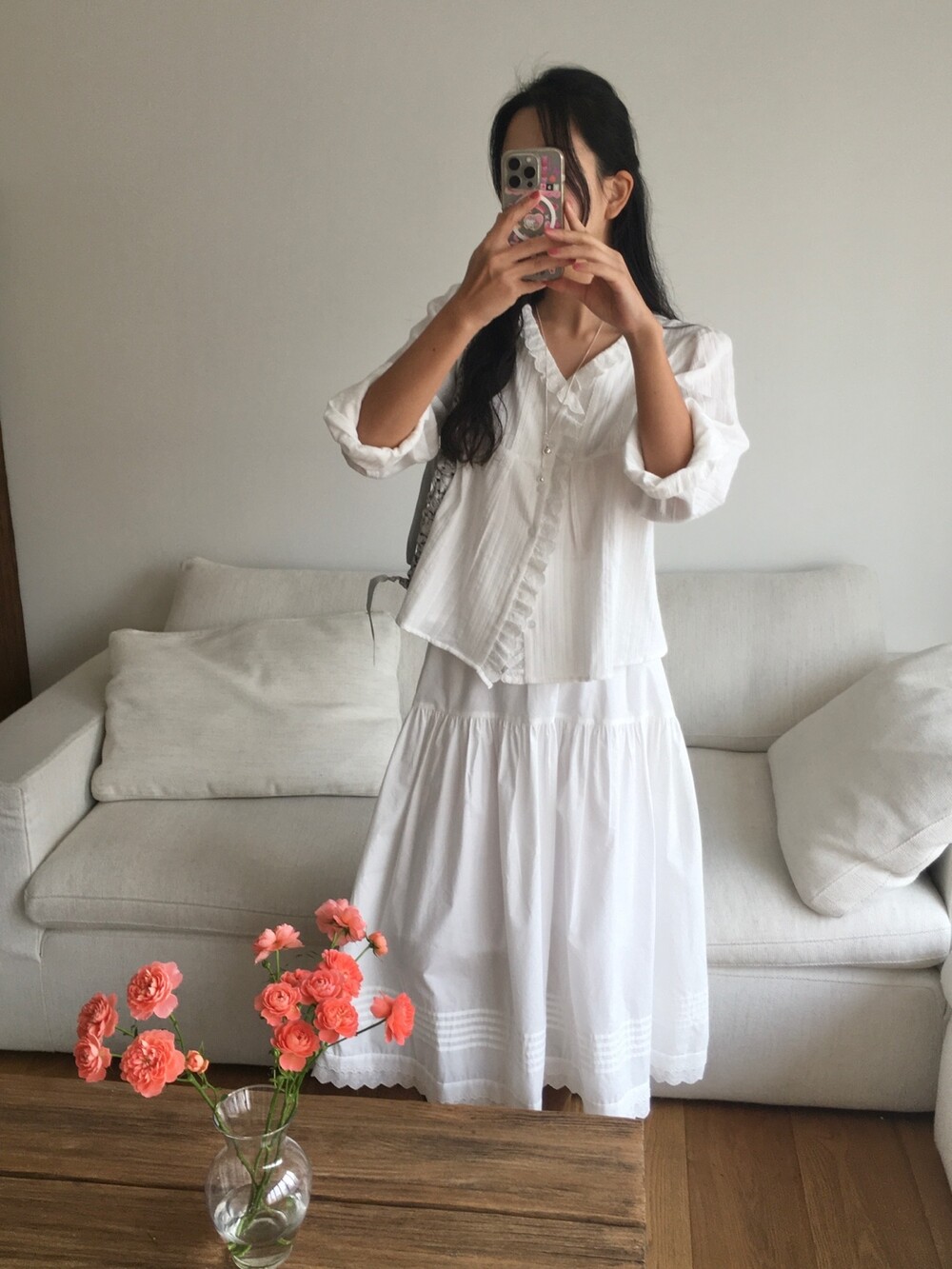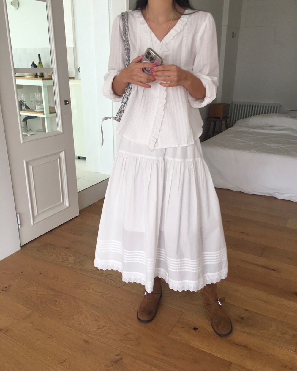 넥라인을 따라 흐르는 섬세한 펀칭 레이스와 프릴 디테일이 얼굴을 한층 더 작고 화사하게 만들어준답니다.