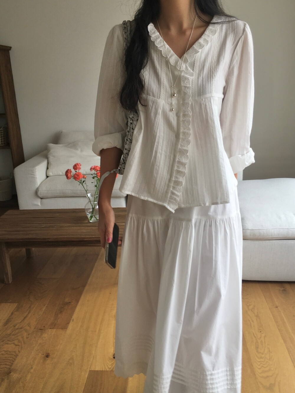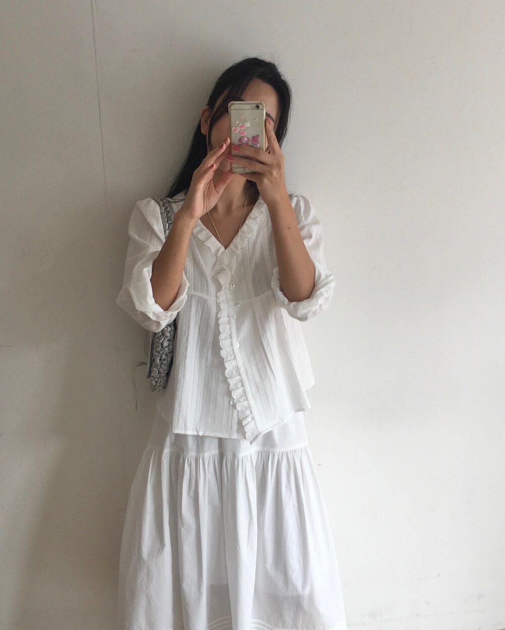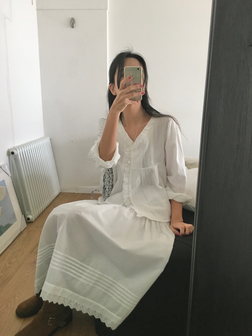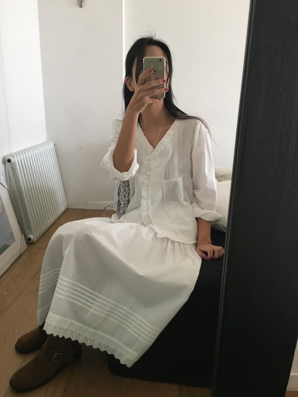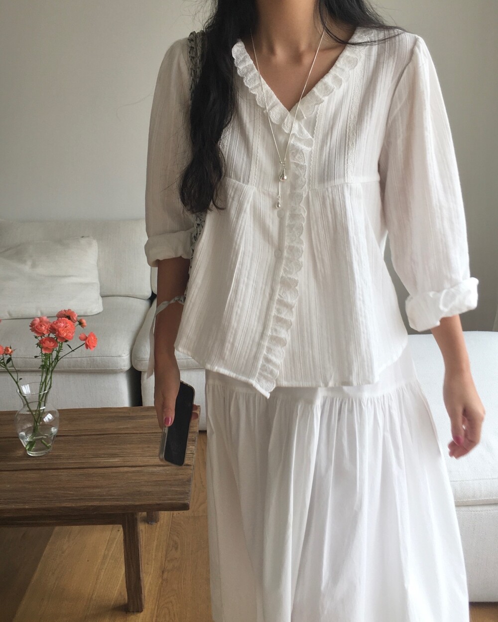넥라인을 따라 흐르는 섬세한 펀칭 레이스와 프릴 디테일이 얼굴을 한층 더 작고 화사하게 만들어준답니다.