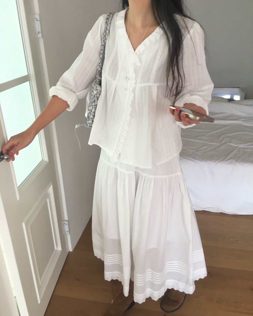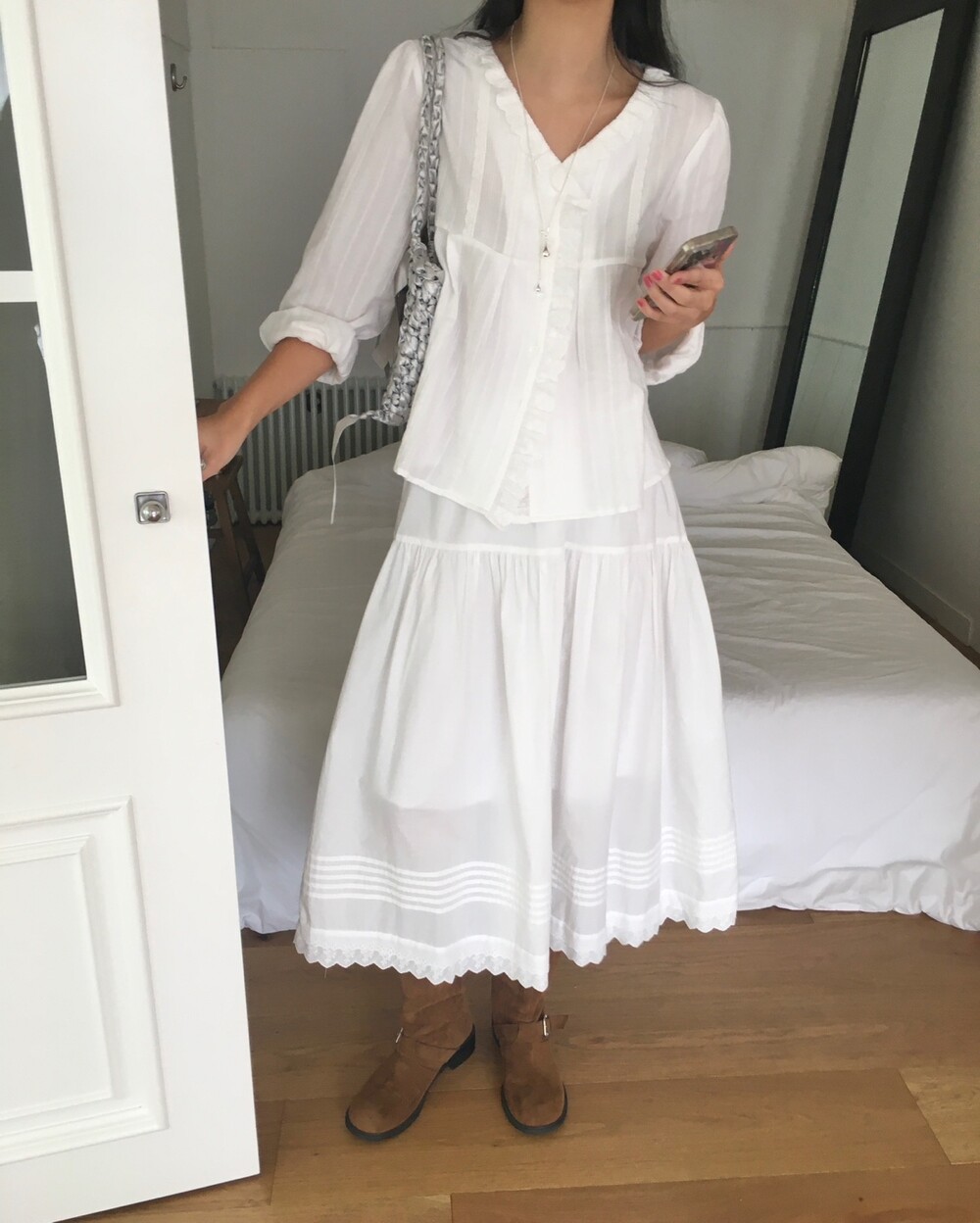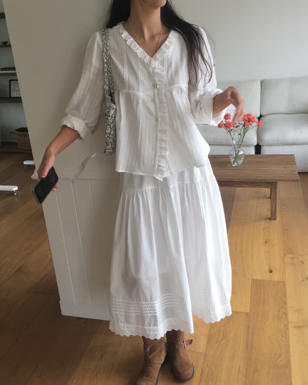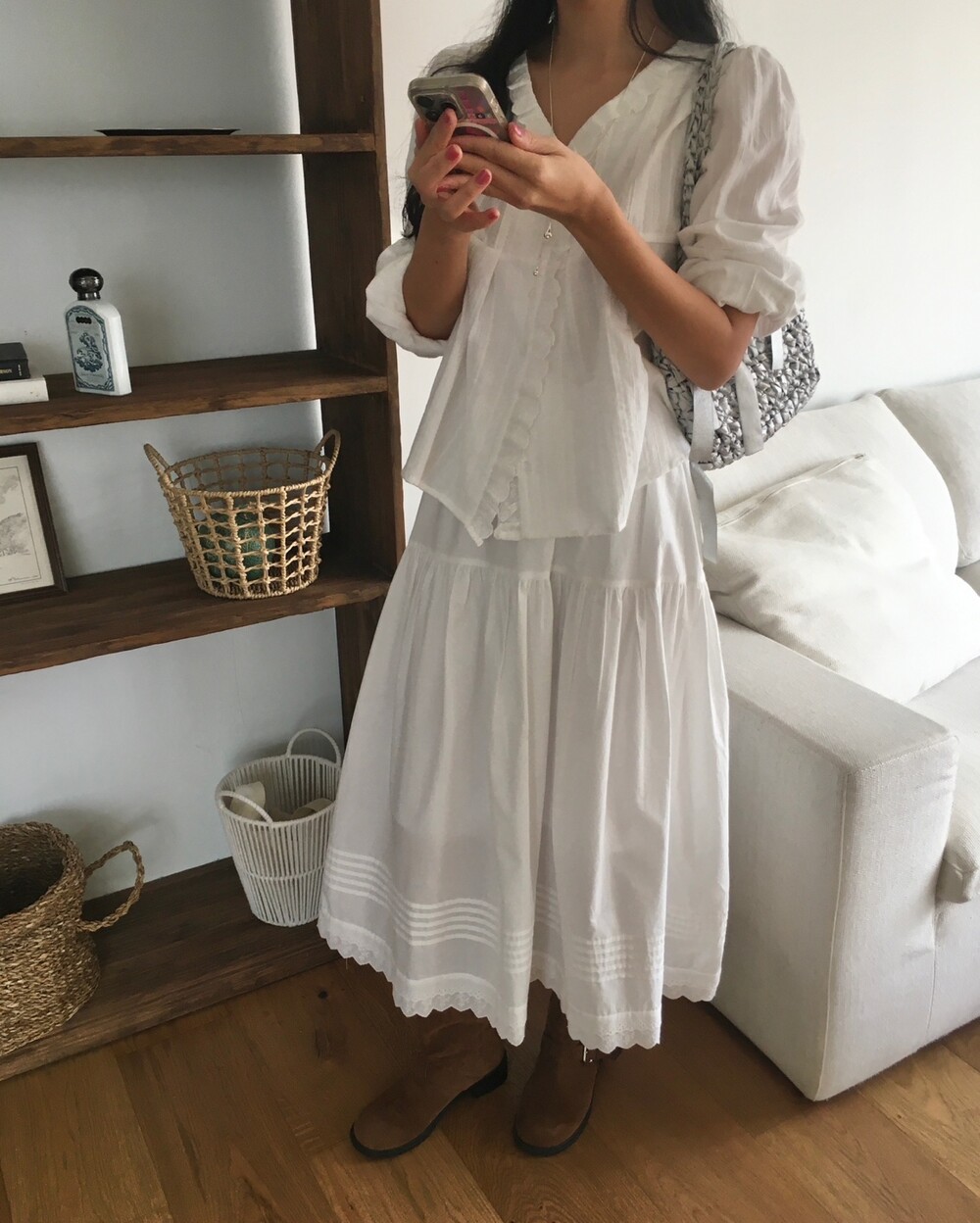 넥라인을 따라 흐르는 섬세한 펀칭 레이스와 프릴 디테일이 얼굴을 한층 더 작고 화사하게 만들어준답니다.