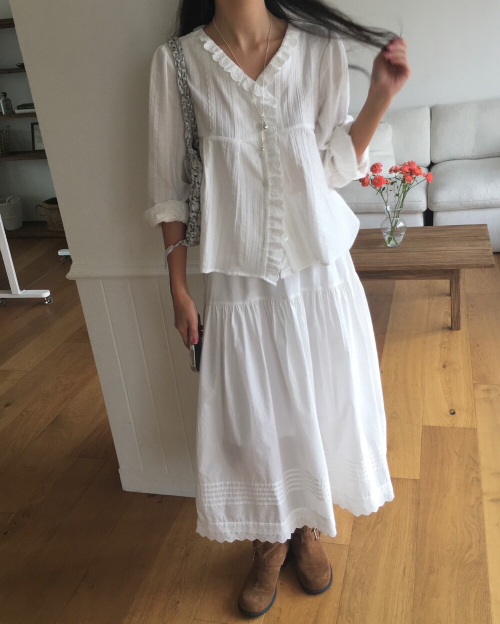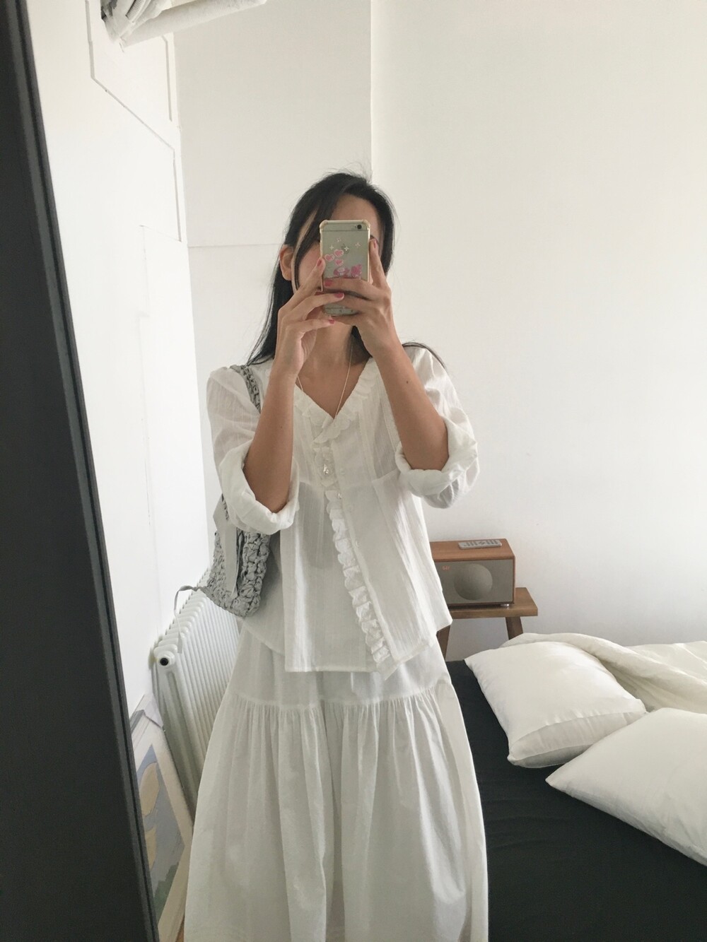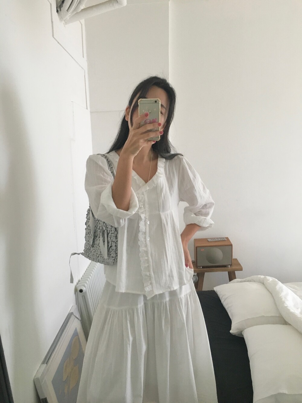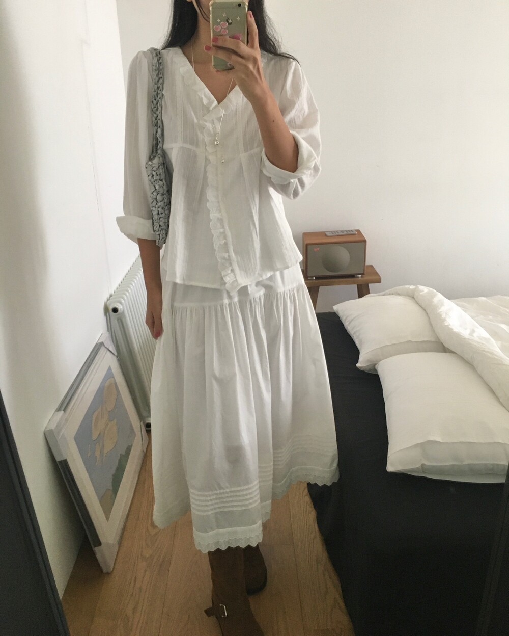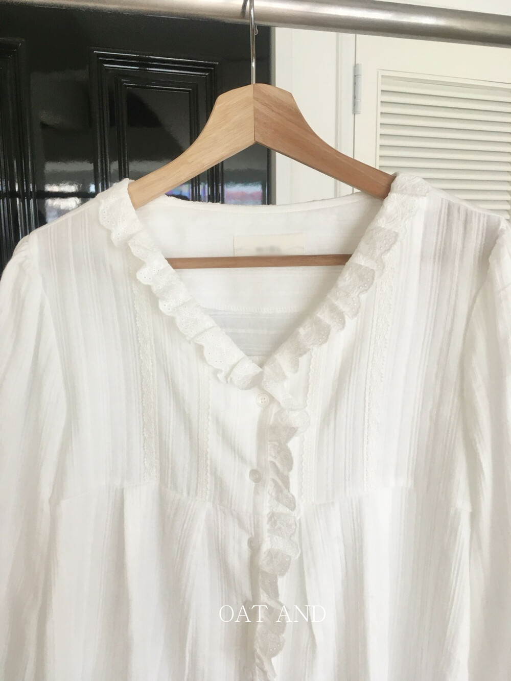 넥라인을 따라 흐르는 섬세한 펀칭 레이스와 프릴 디테일이 얼굴을 한층 더 작고 화사하게 만들어준답니다.