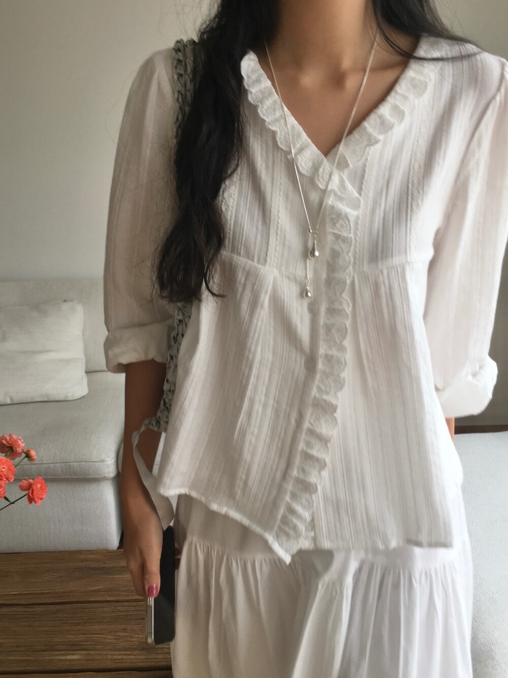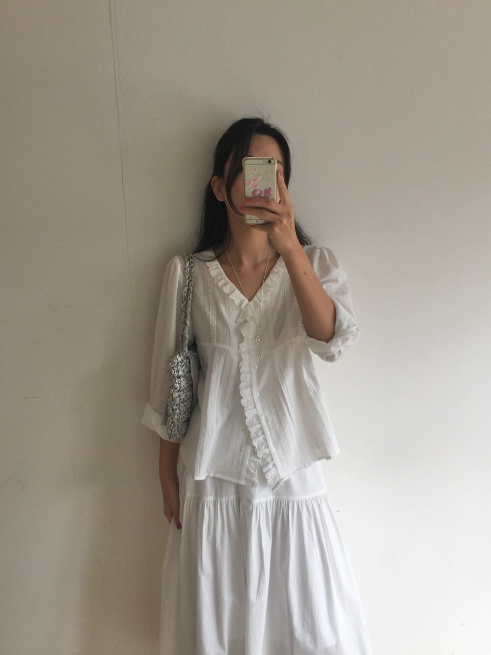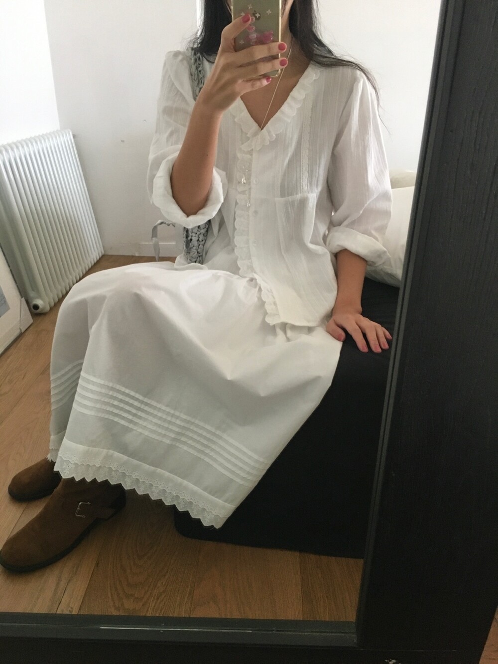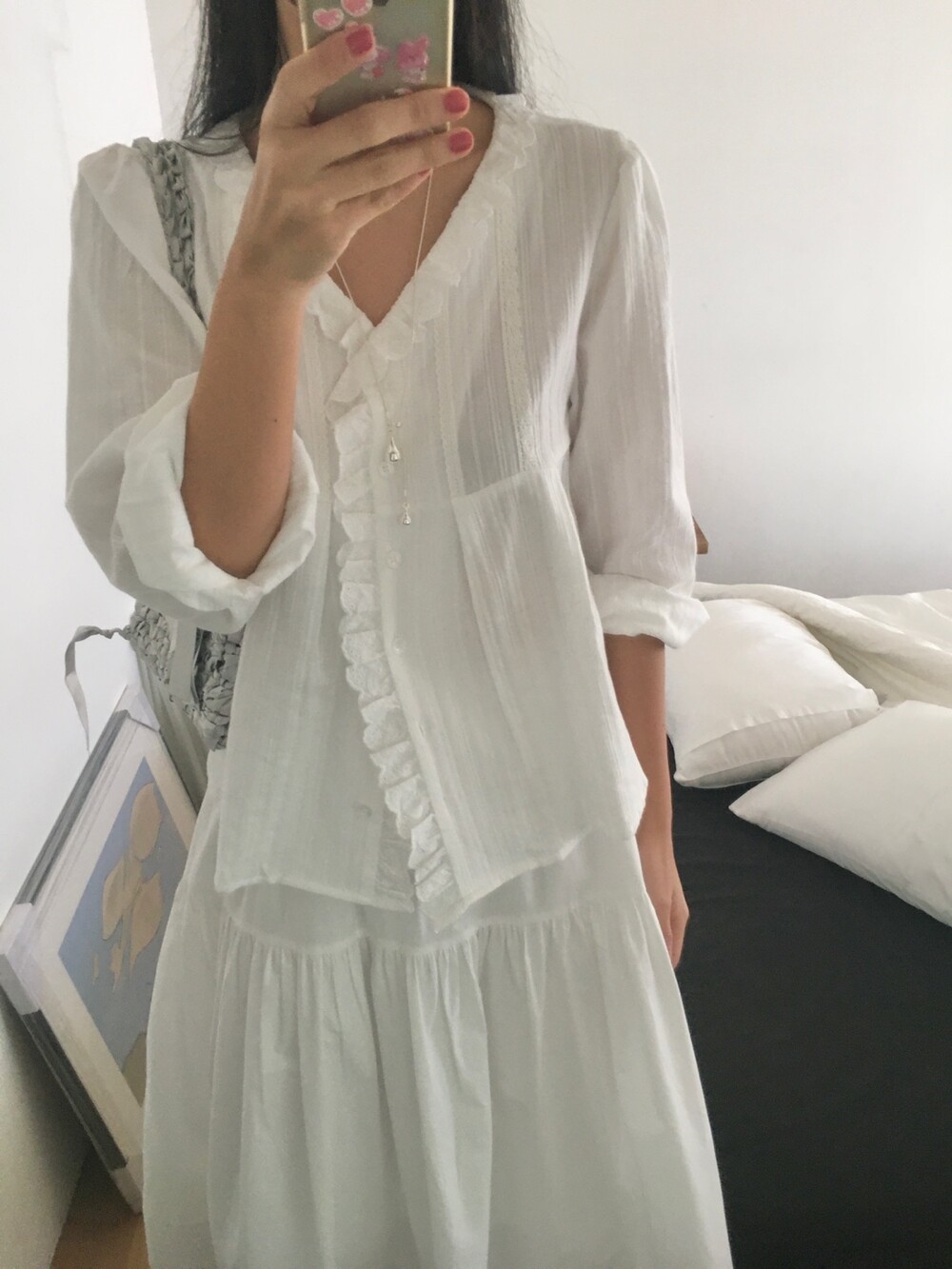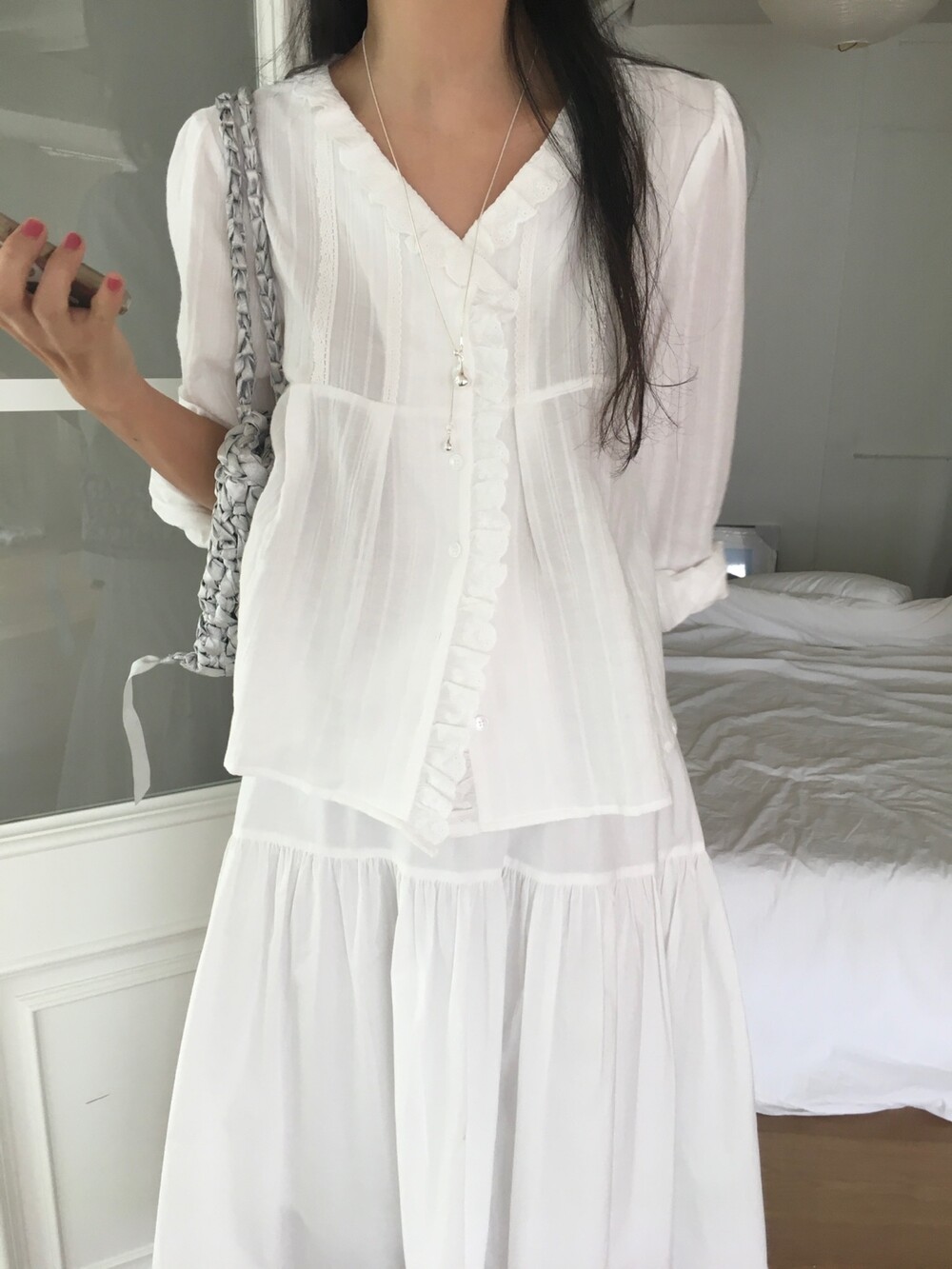 넥라인을 따라 흐르는 섬세한 펀칭 레이스와 프릴 디테일이 얼굴을 한층 더 작고 화사하게 만들어준답니다.