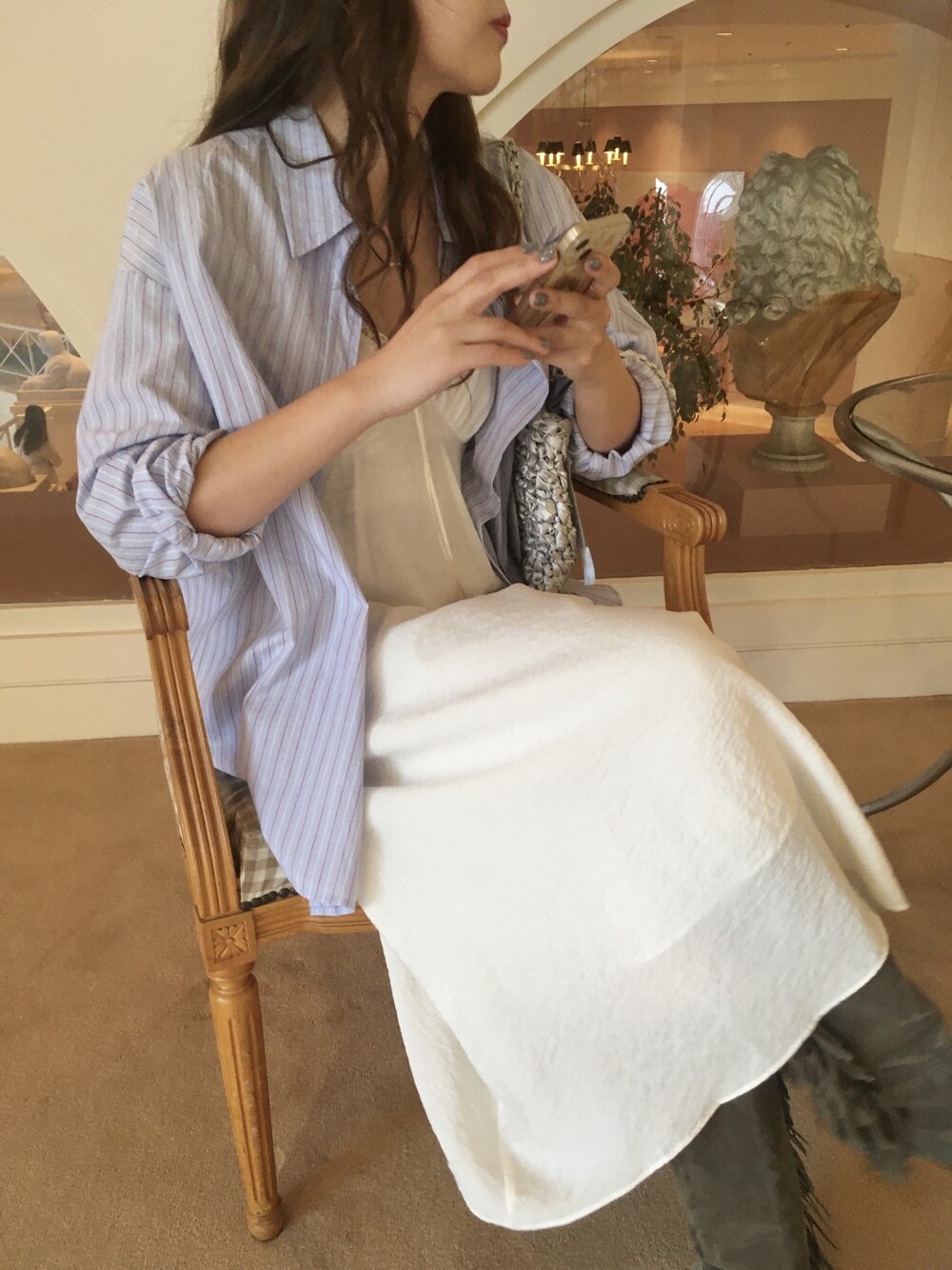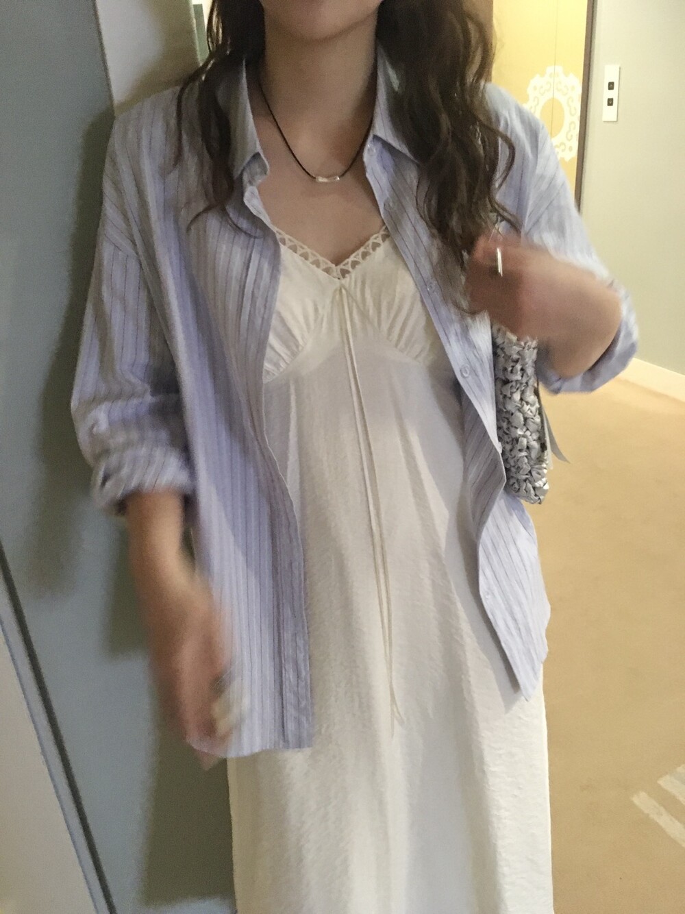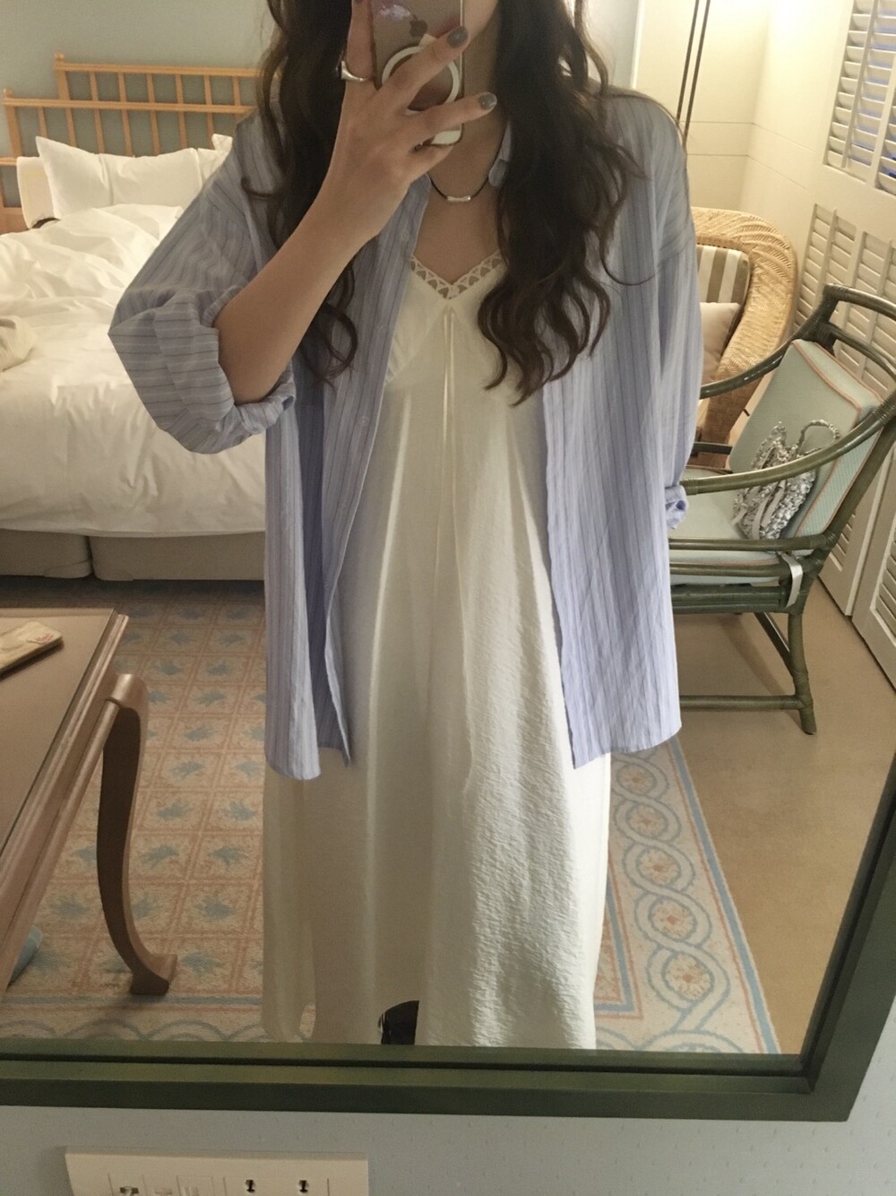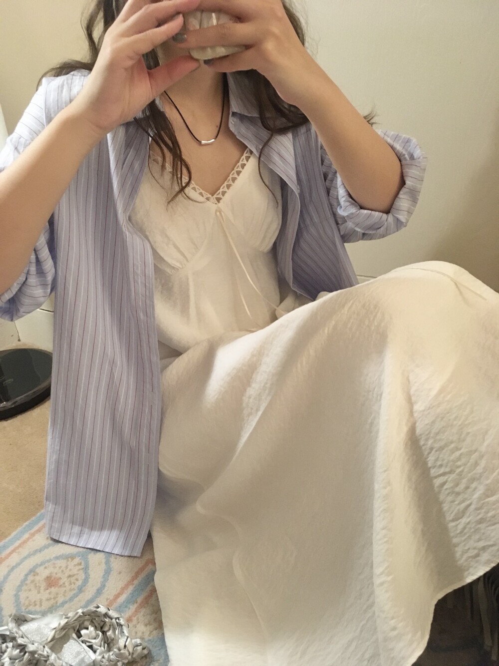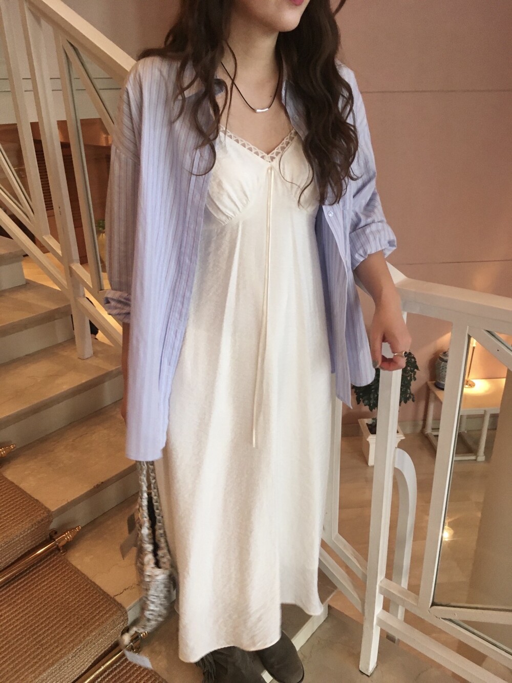 자연스럽게 흘러내리는 느낌으로, 움직일 때마다 살짝 퍼지며 여성스러운 분위기가 느껴지고, 레이스와 리본 디테일이 어우러져 빈티지한 무드까지 느껴진답니다.