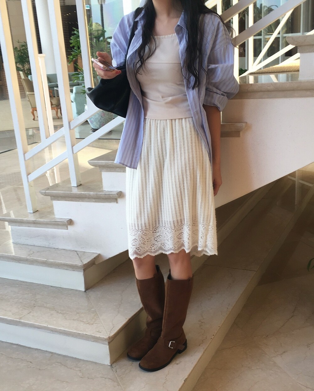 맑은 소라색 바탕 위에 화이트와 레드 컬러의 스트라이프가 섞여 있어서 시각적인 포인트를 잡아주고,