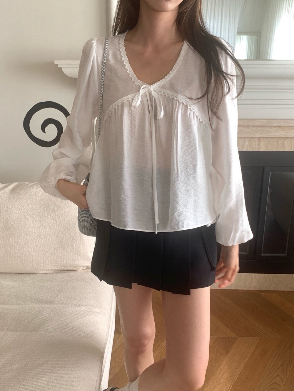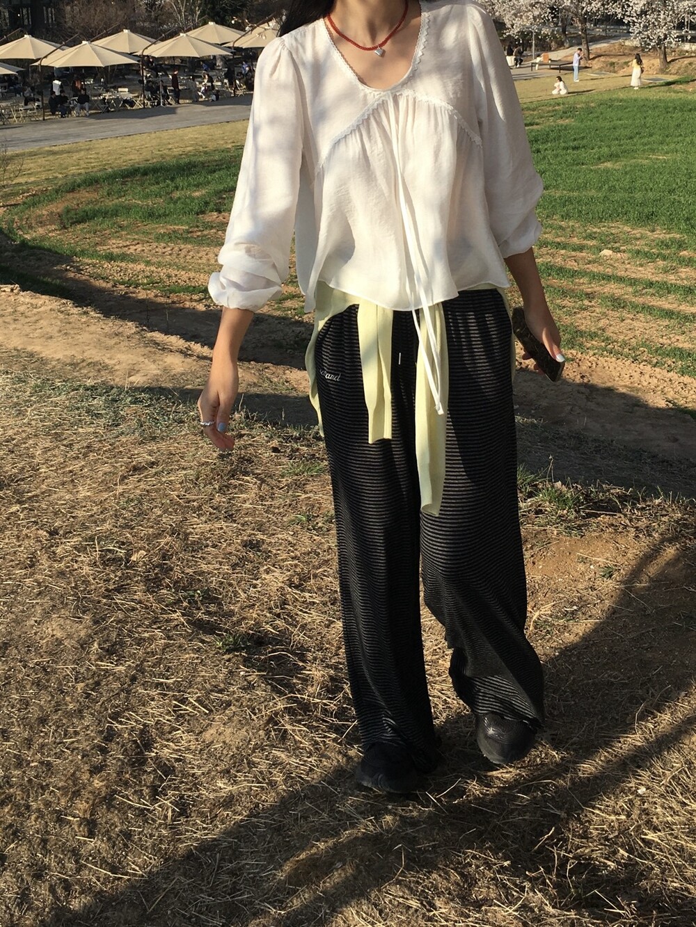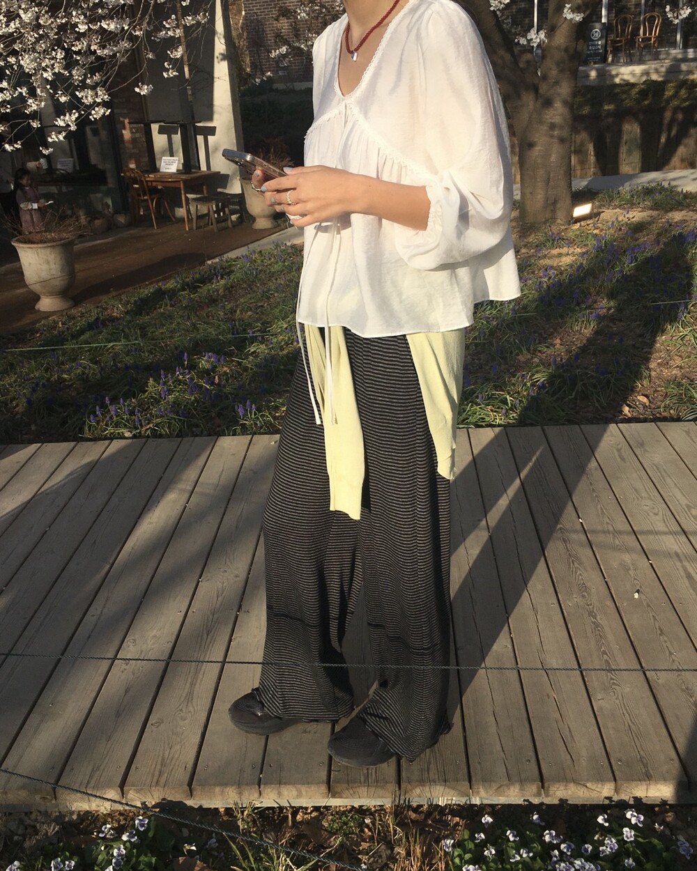 넥라인과 바스트 라인을 따라 더해진 섬세한 레이스 디테일이 포인트가 되어과하지 않으면서도 은은한 포인트를 더해줘요.