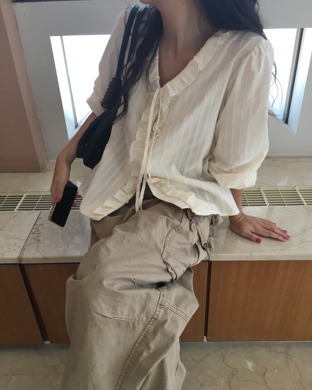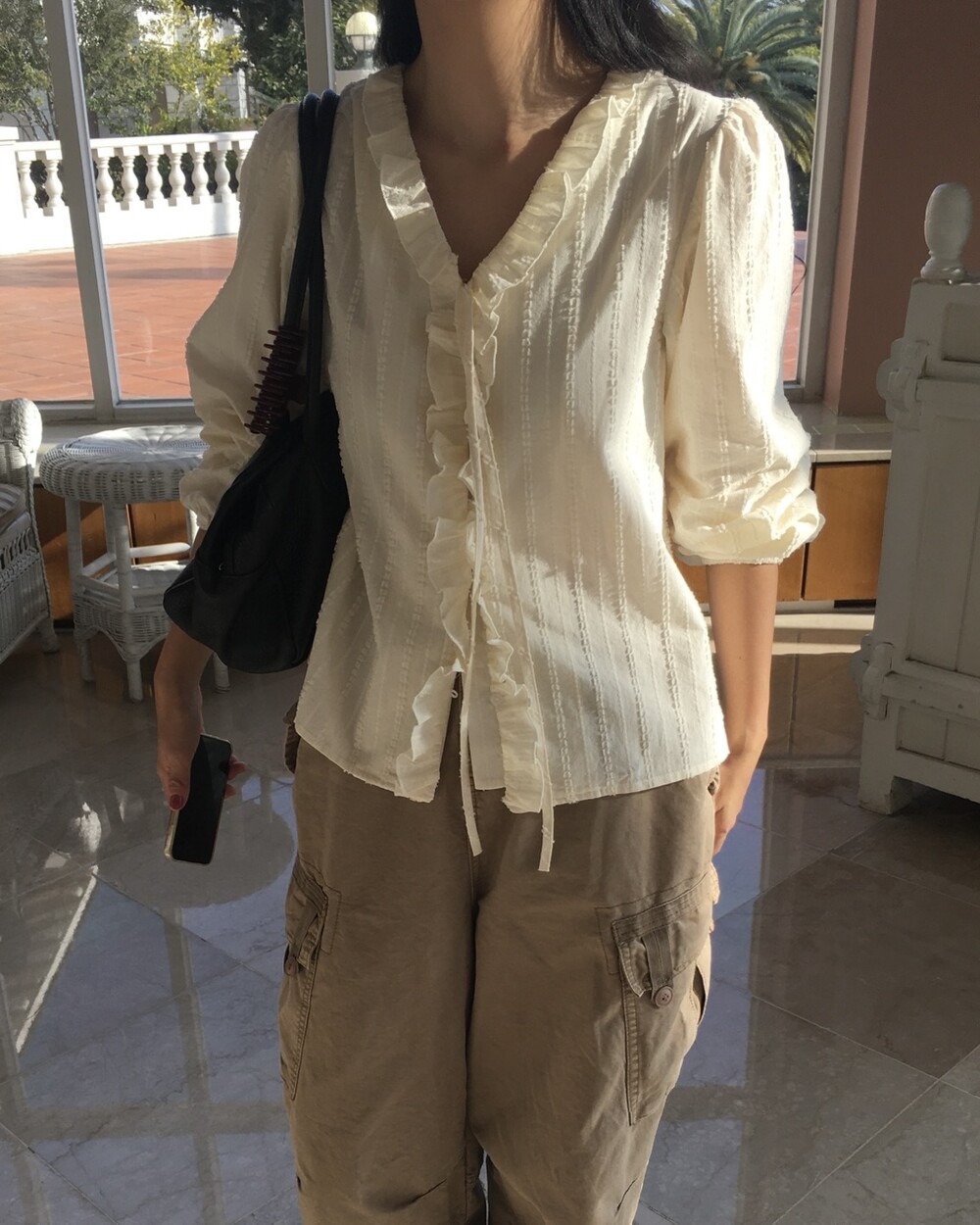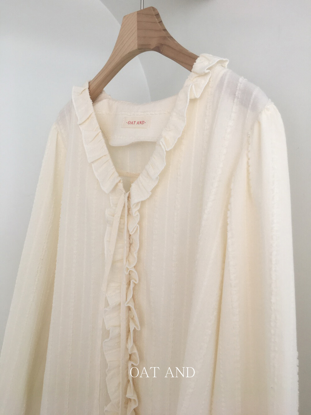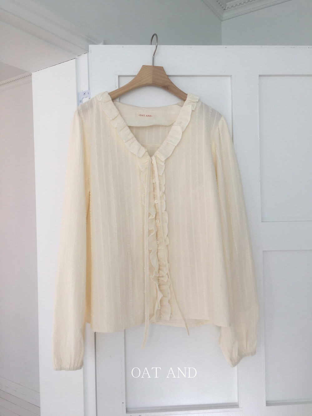 가볍게 내려오는 브이넥 라인과 자연스럽게 이어지는 프릴 디테일이 얼굴선을 여리여리해보이게 만들어주며,