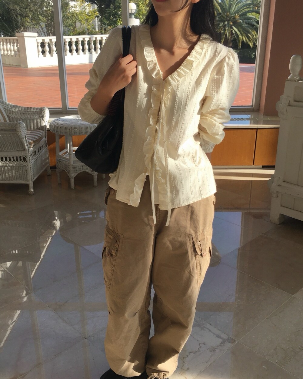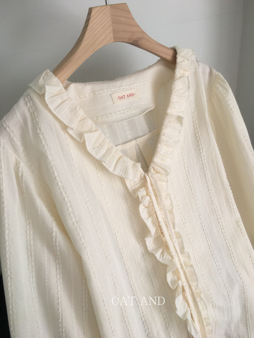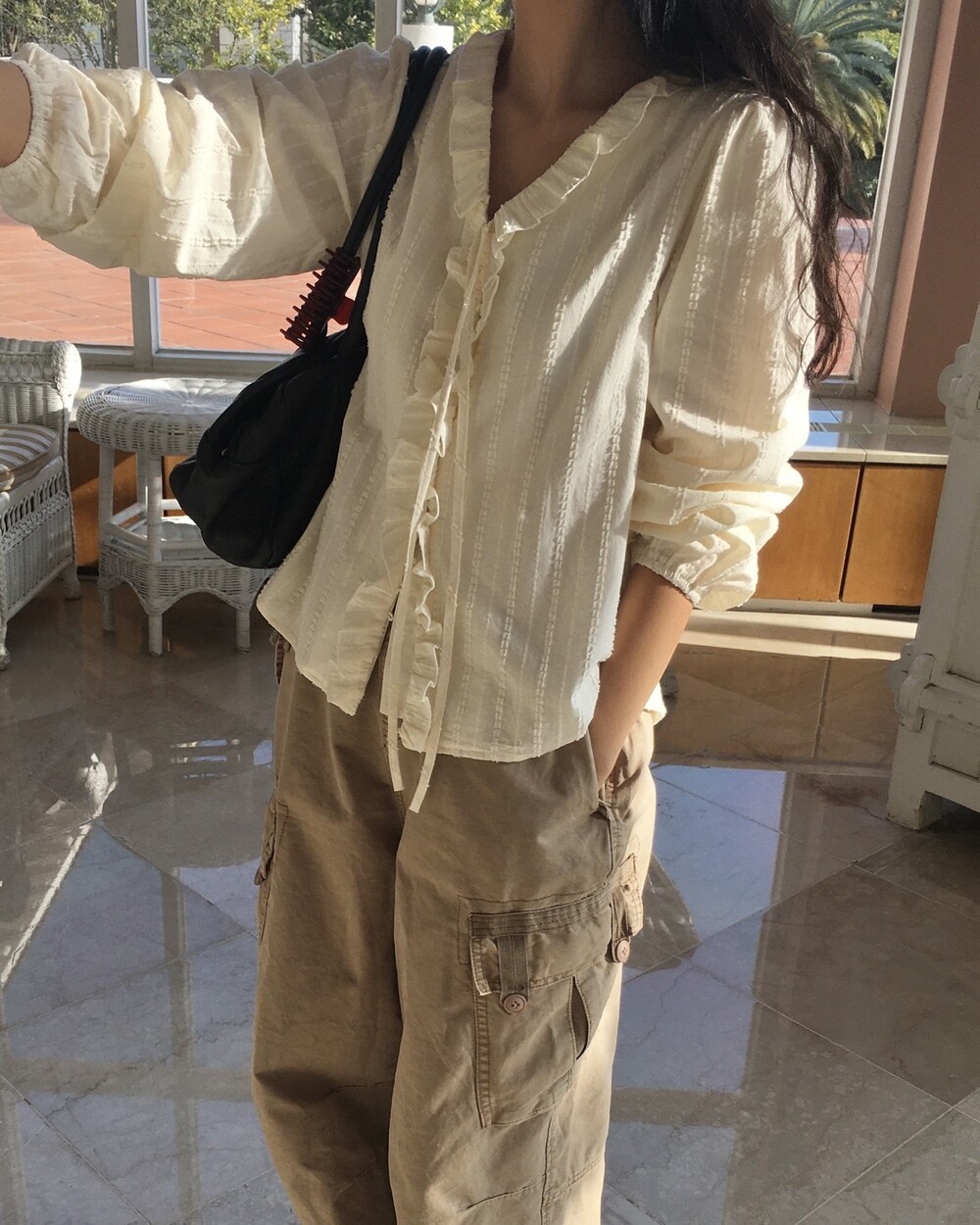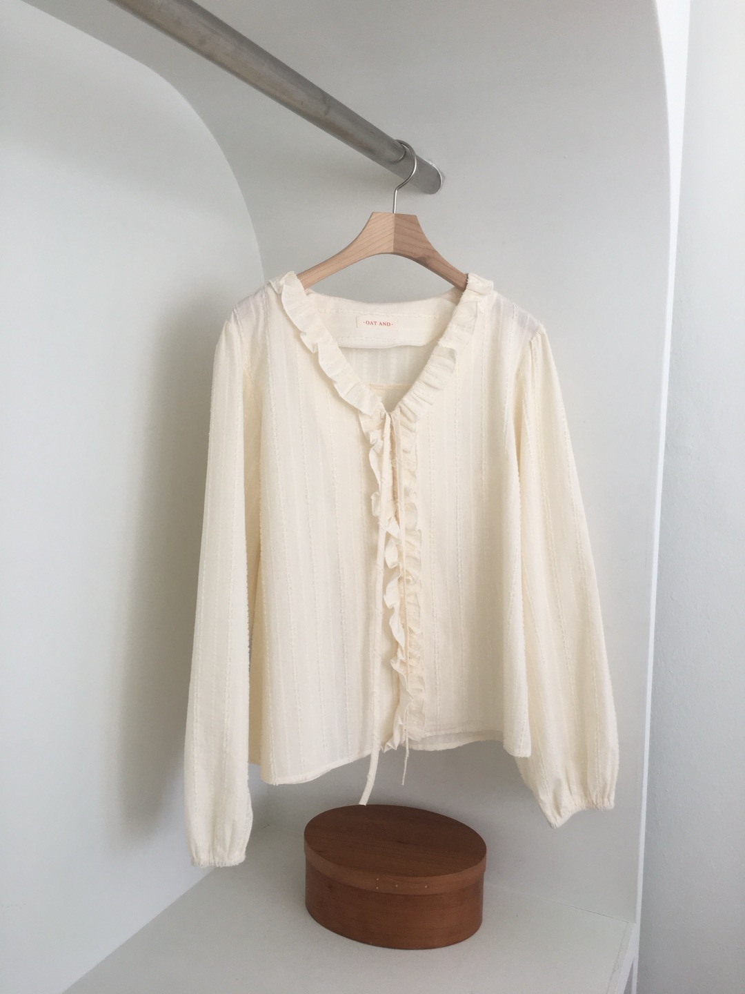 가볍게 내려오는 브이넥 라인과 자연스럽게 이어지는 프릴 디테일이 얼굴선을 여리여리해보이게 만들어주며,