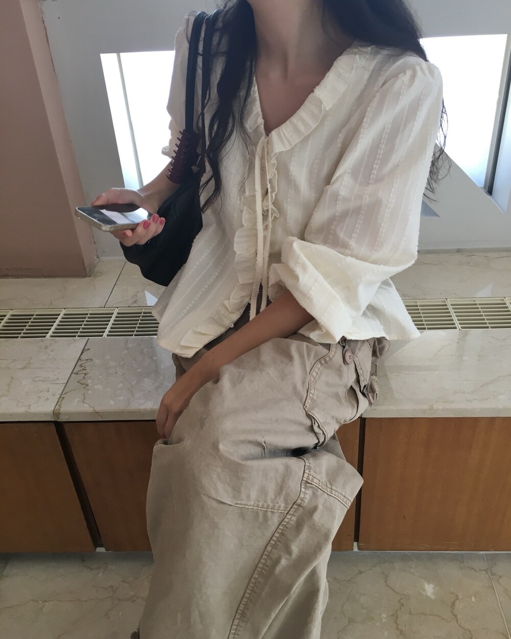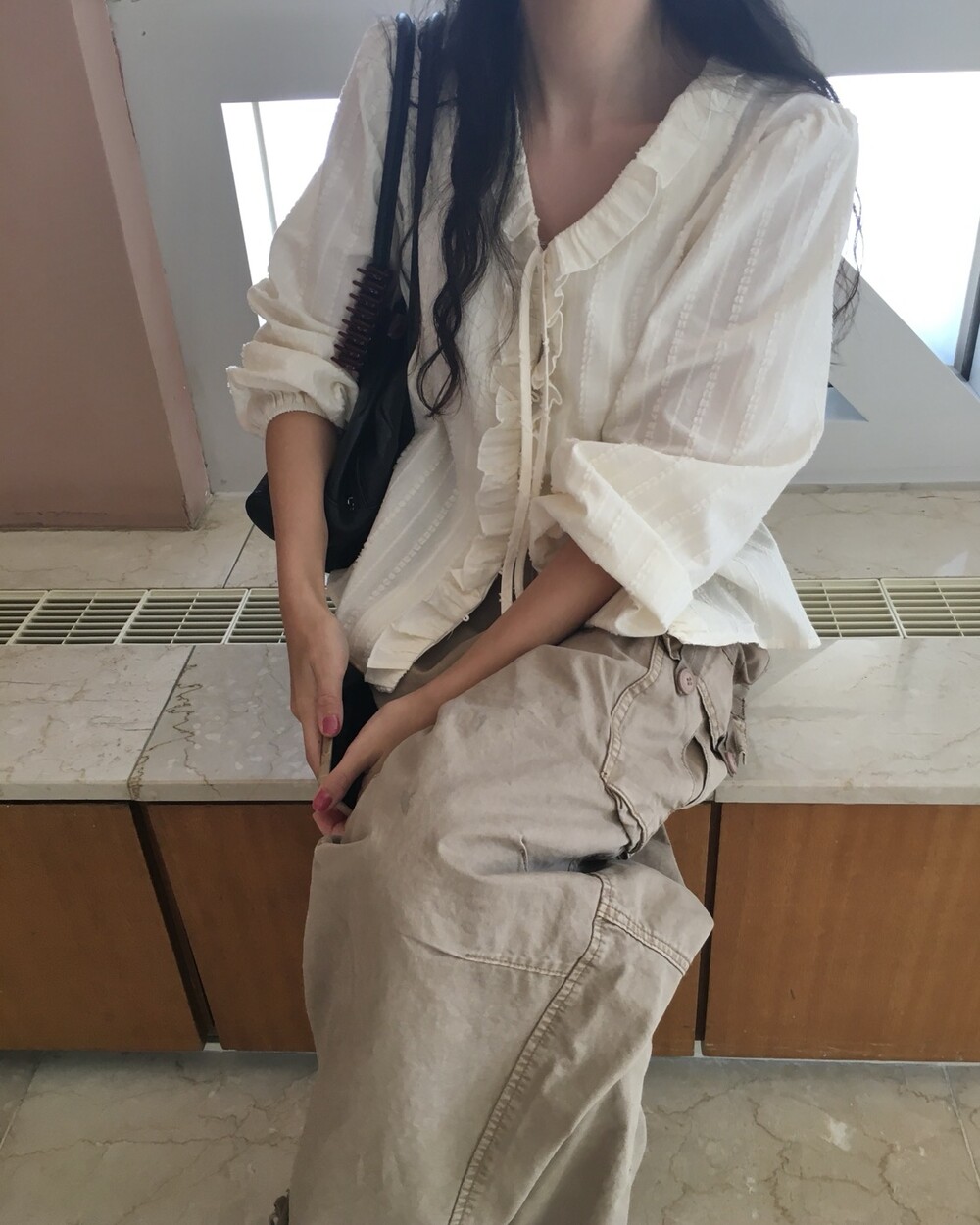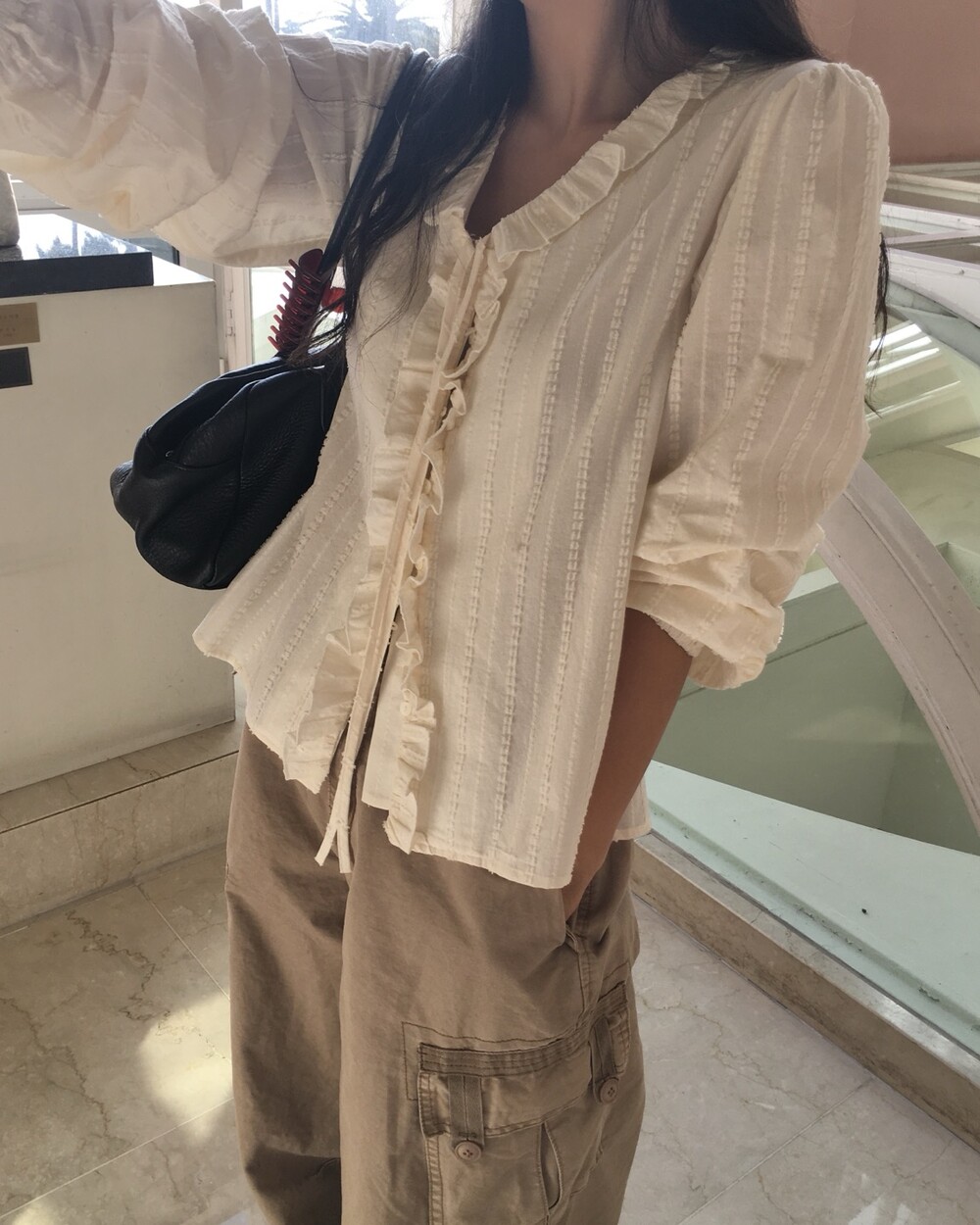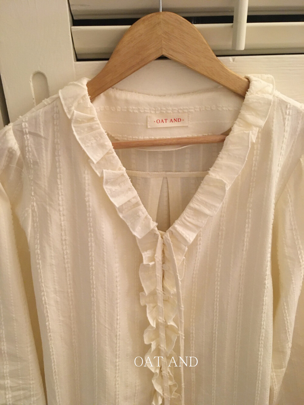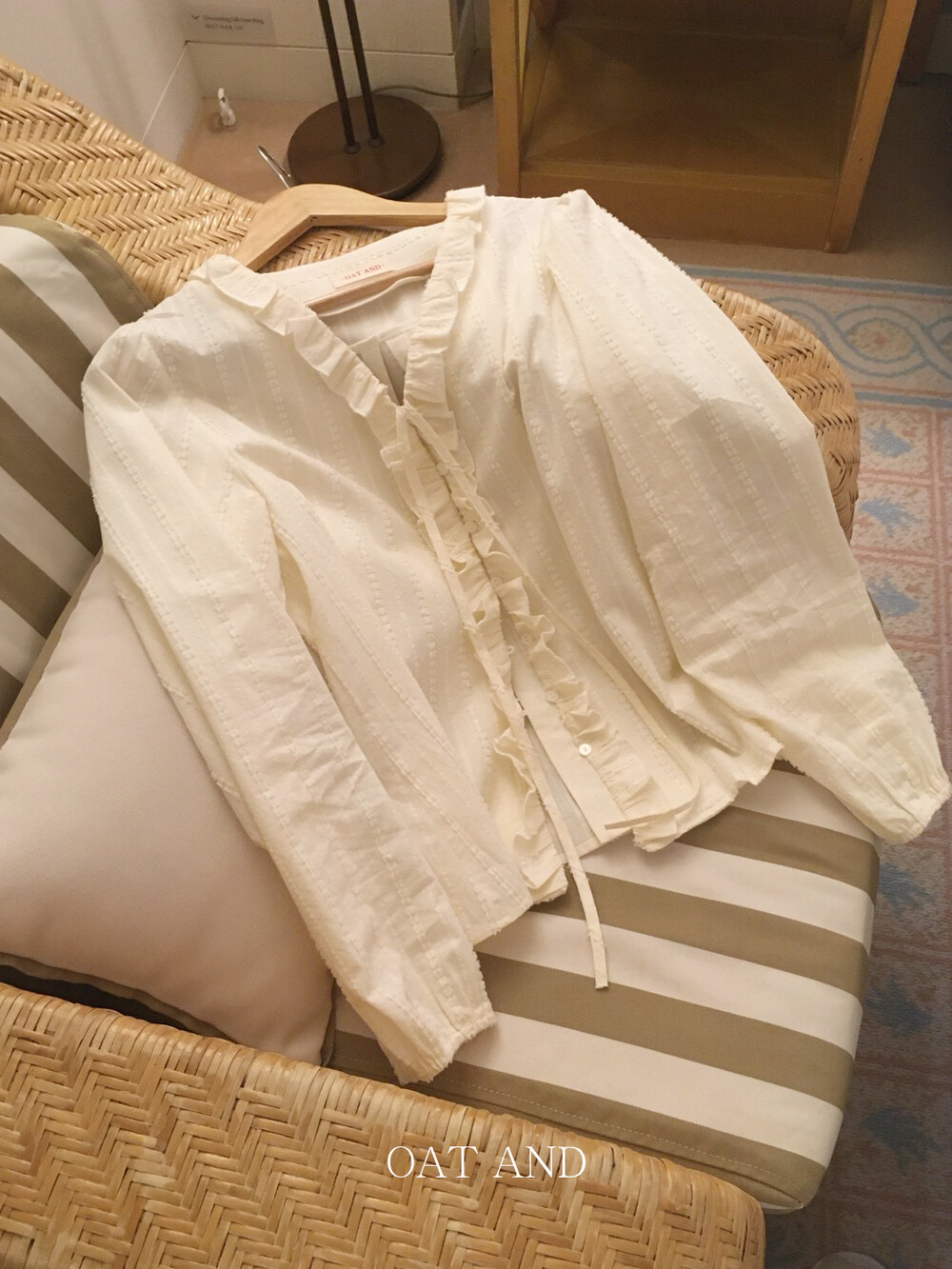 가볍게 내려오는 브이넥 라인과 자연스럽게 이어지는 프릴 디테일이 얼굴선을 여리여리해보이게 만들어주며,