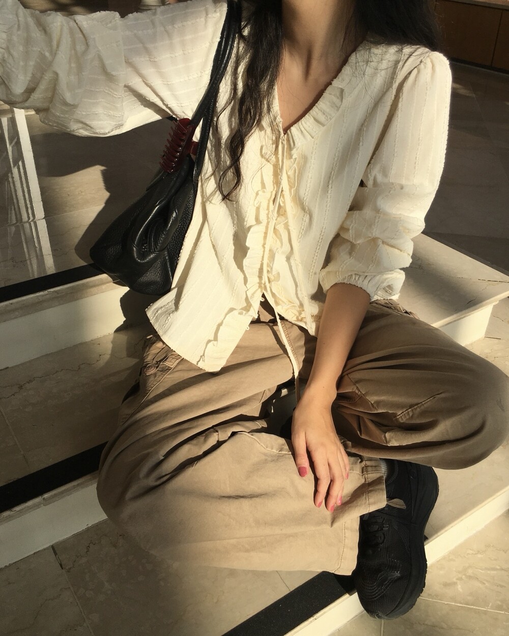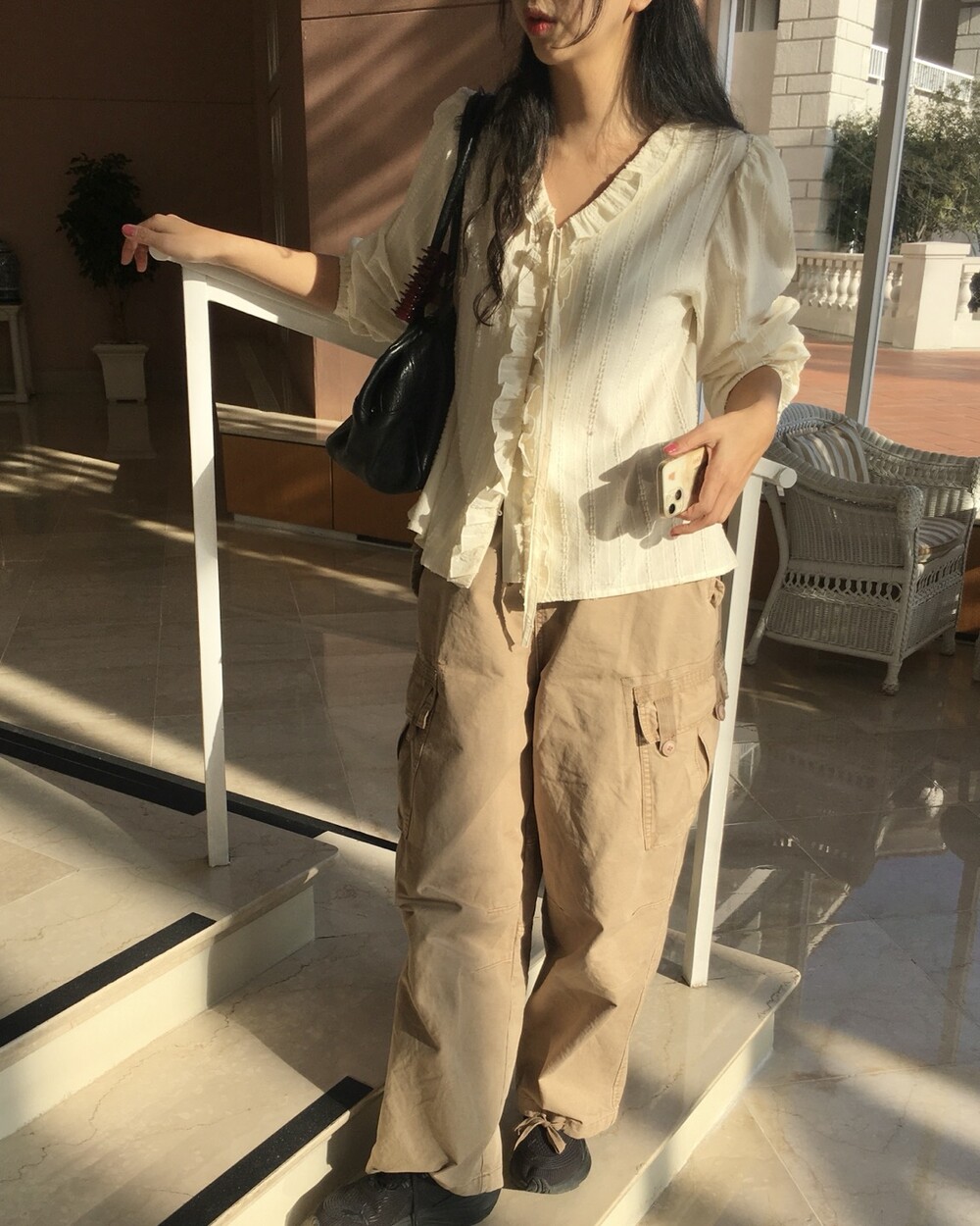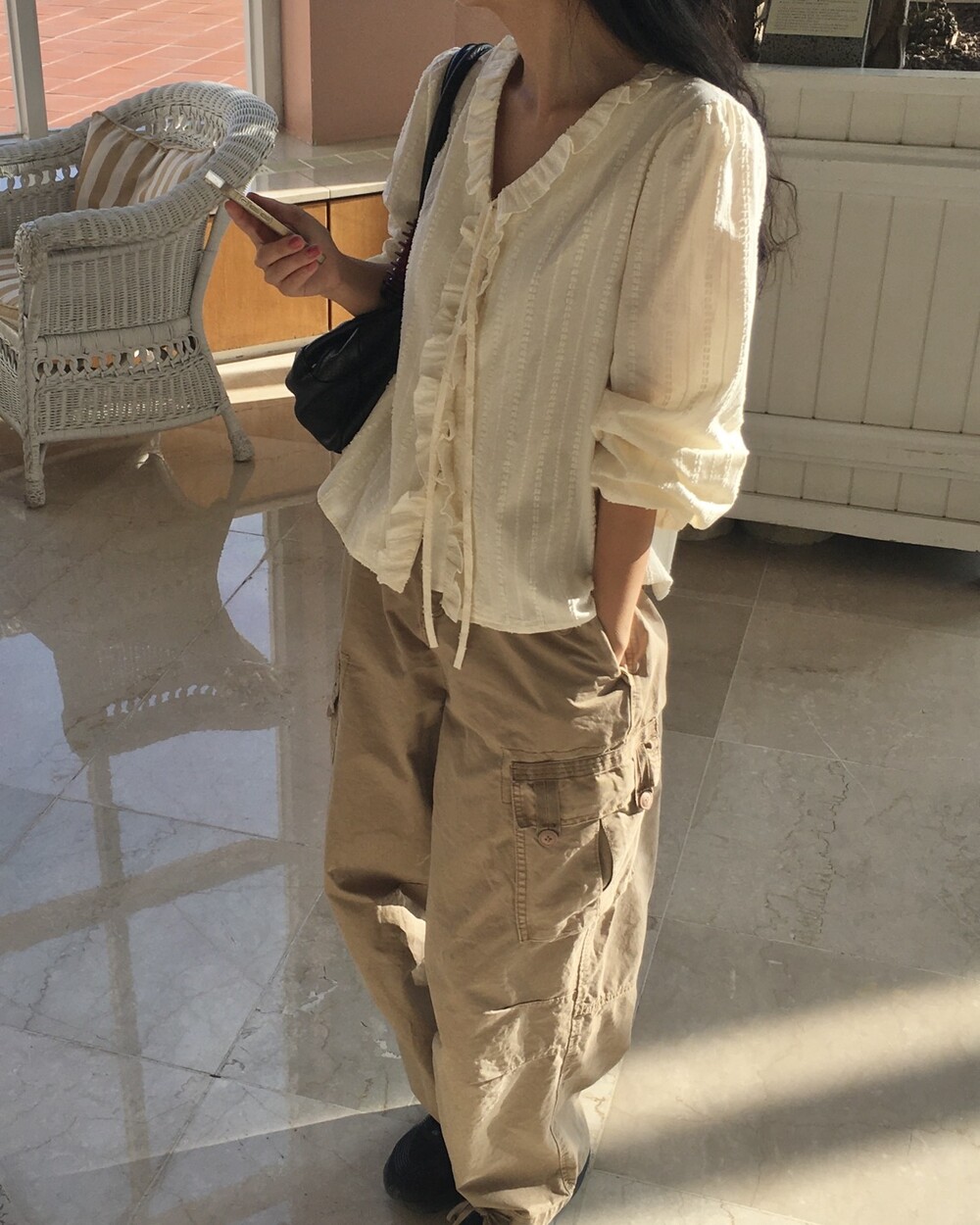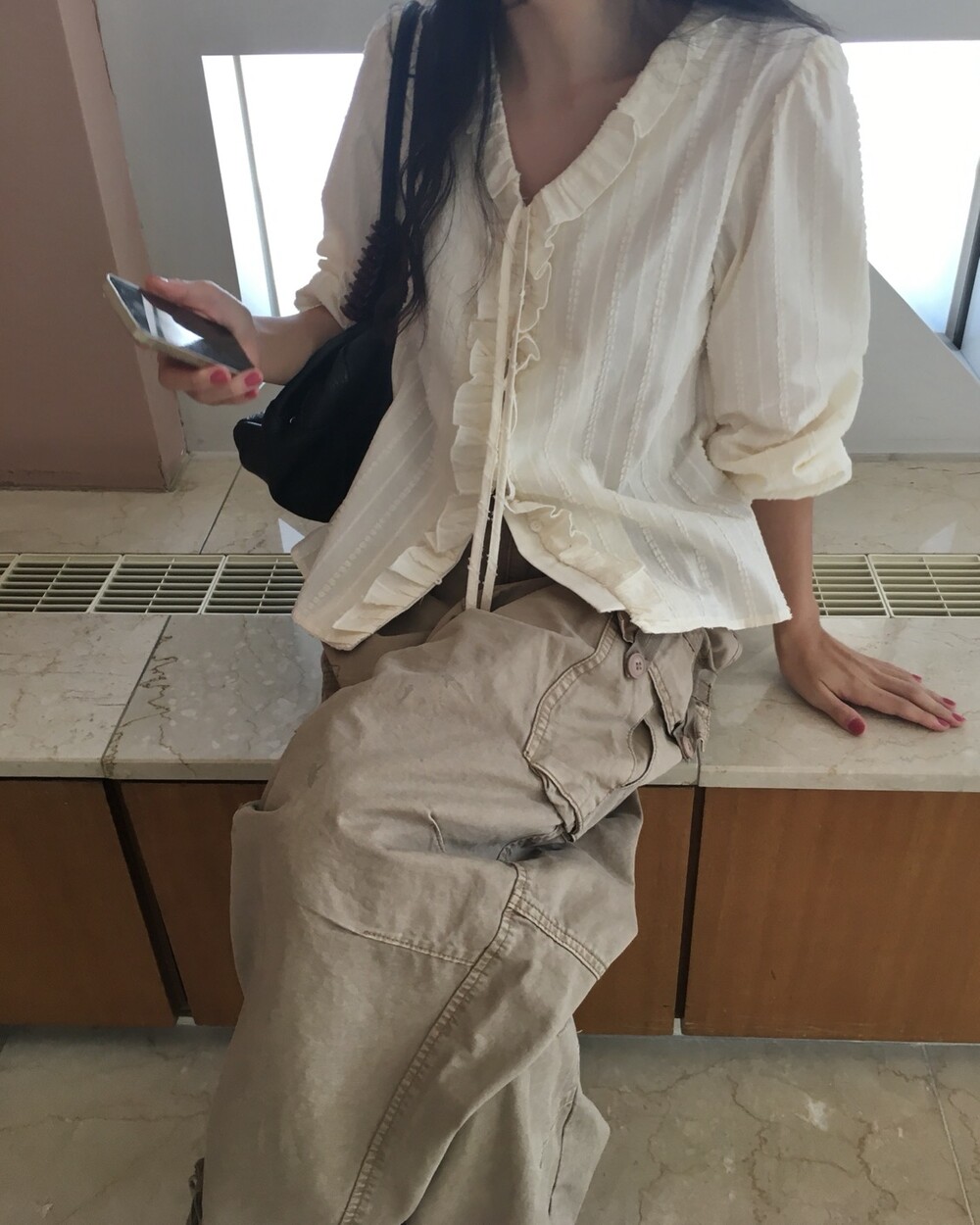가볍게 내려오는 브이넥 라인과 자연스럽게 이어지는 프릴 디테일이 얼굴선을 여리여리해보이게 만들어주며,