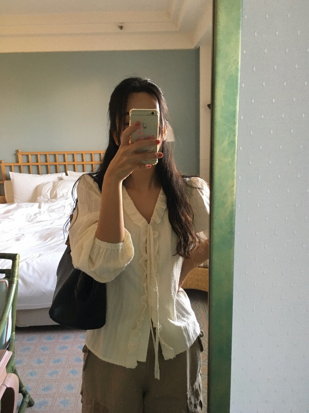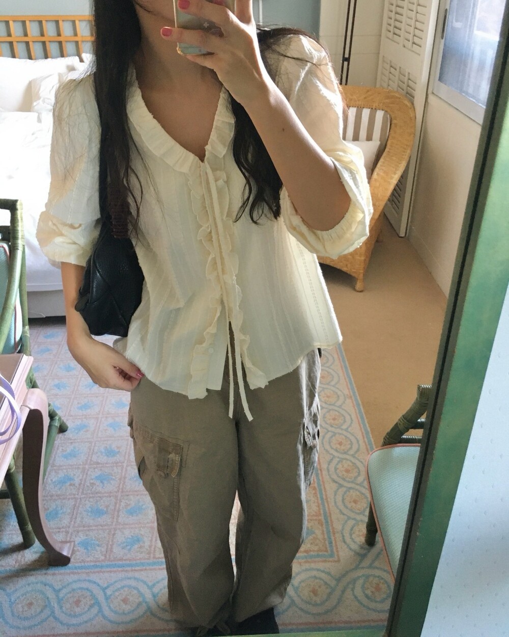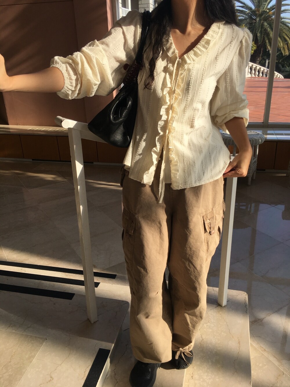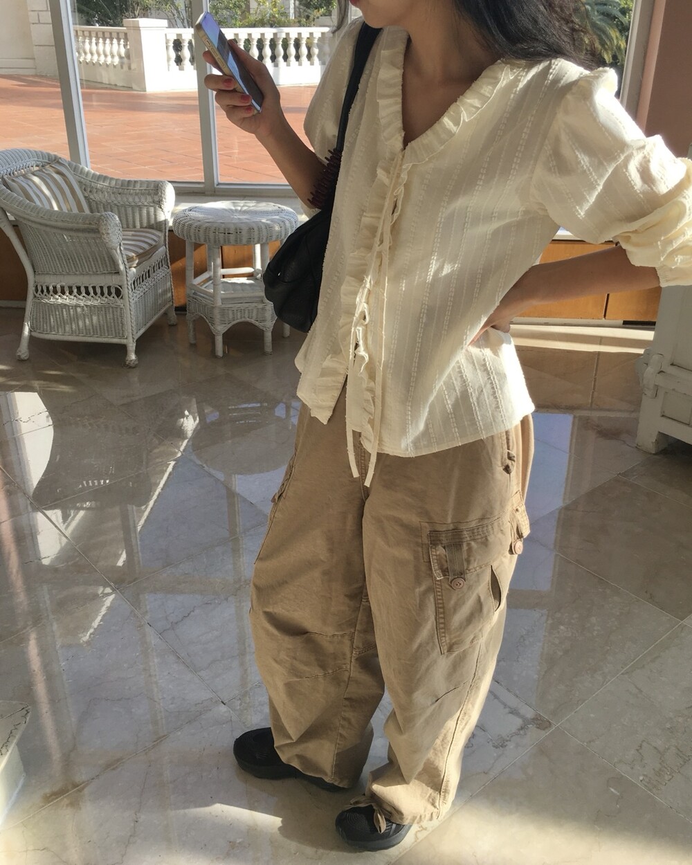 가볍게 내려오는 브이넥 라인과 자연스럽게 이어지는 프릴 디테일이 얼굴선을 여리여리해보이게 만들어주며,