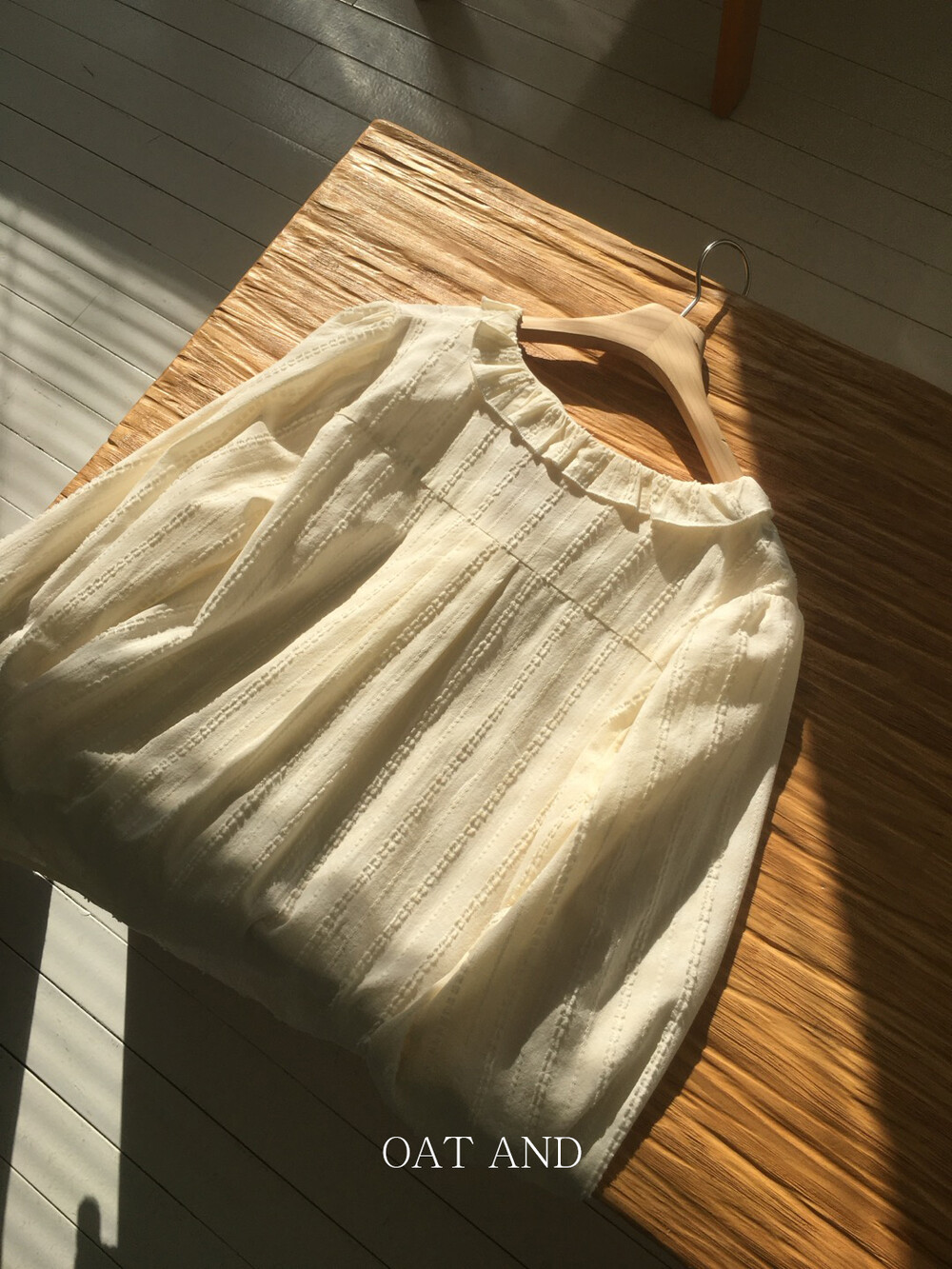 자연스러운 셔링 소매와 잔잔하게 들어간 세로 텍스처 원단은 단독 착용만으로도 충분한 존재감을 주면서