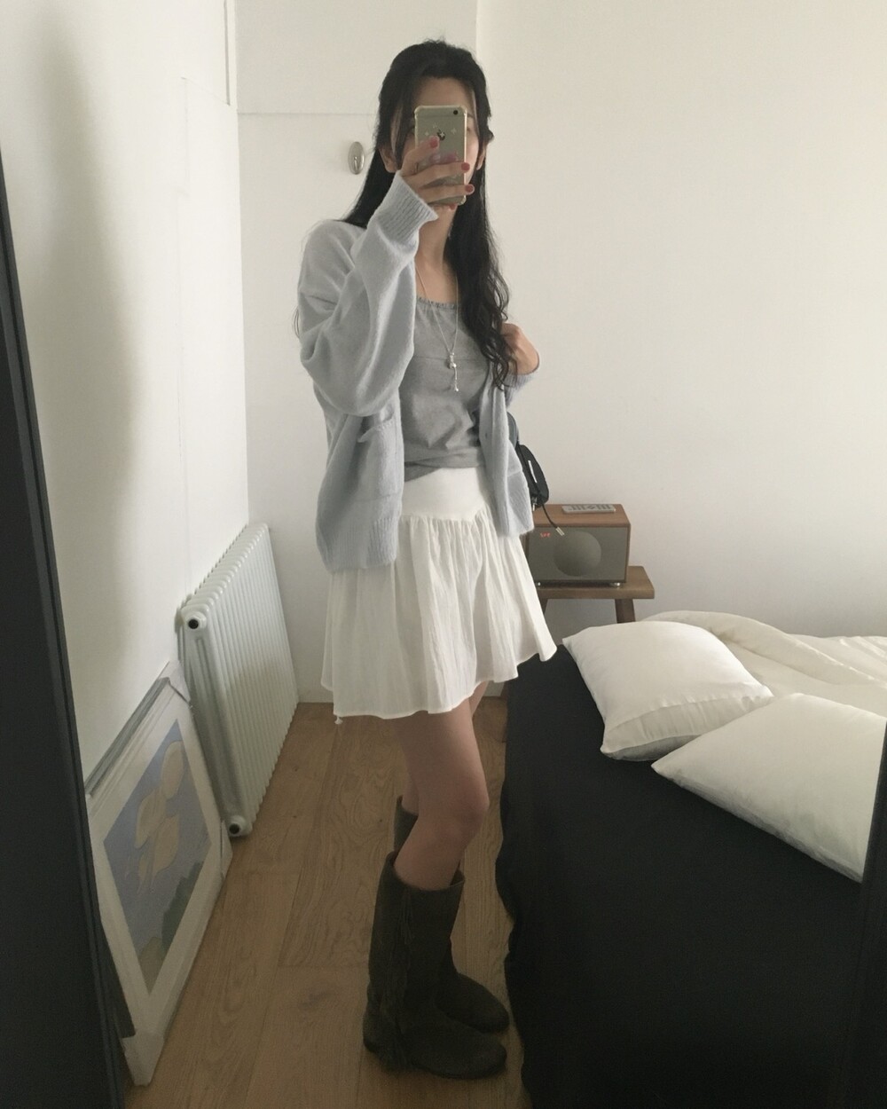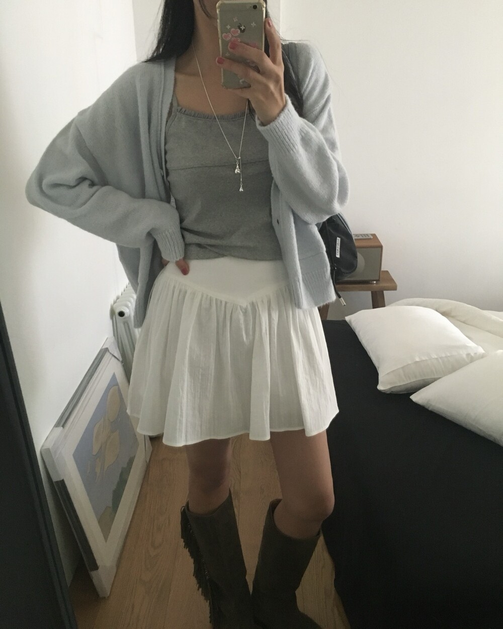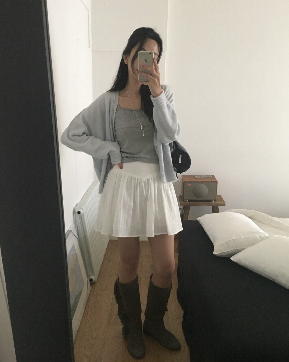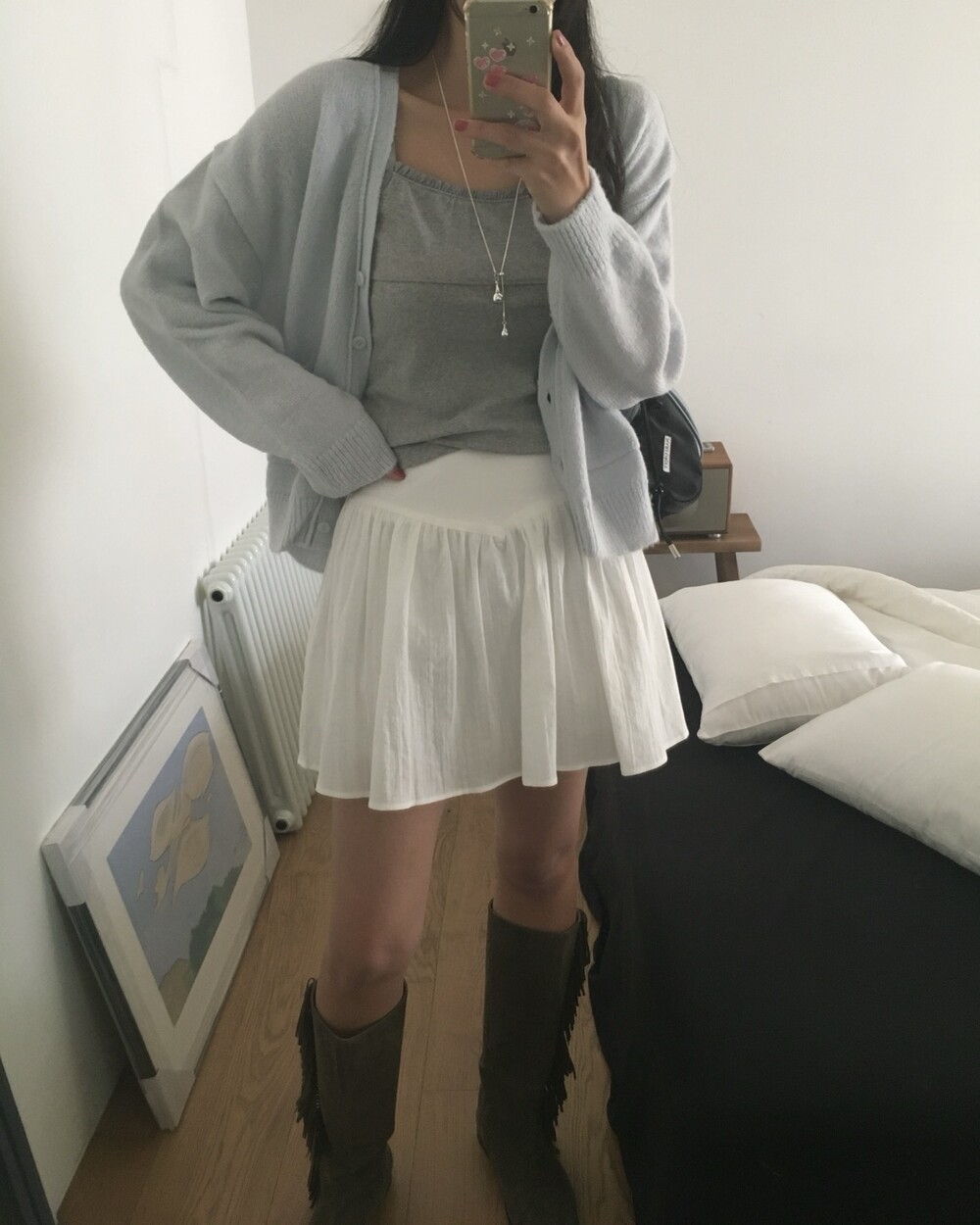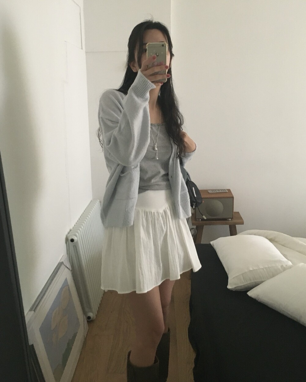 V자 절개선 아래로 촘촘하게 잡힌 셔링 스커트로 하단이 자연스럽게 퍼지는 볼륨감 있는 실루엣을 완성하고, 체형 보완은 물론, 걸을 때마다 살랑거리는 느낌이 매력적인 여리여리한 무드를 연출합니다.