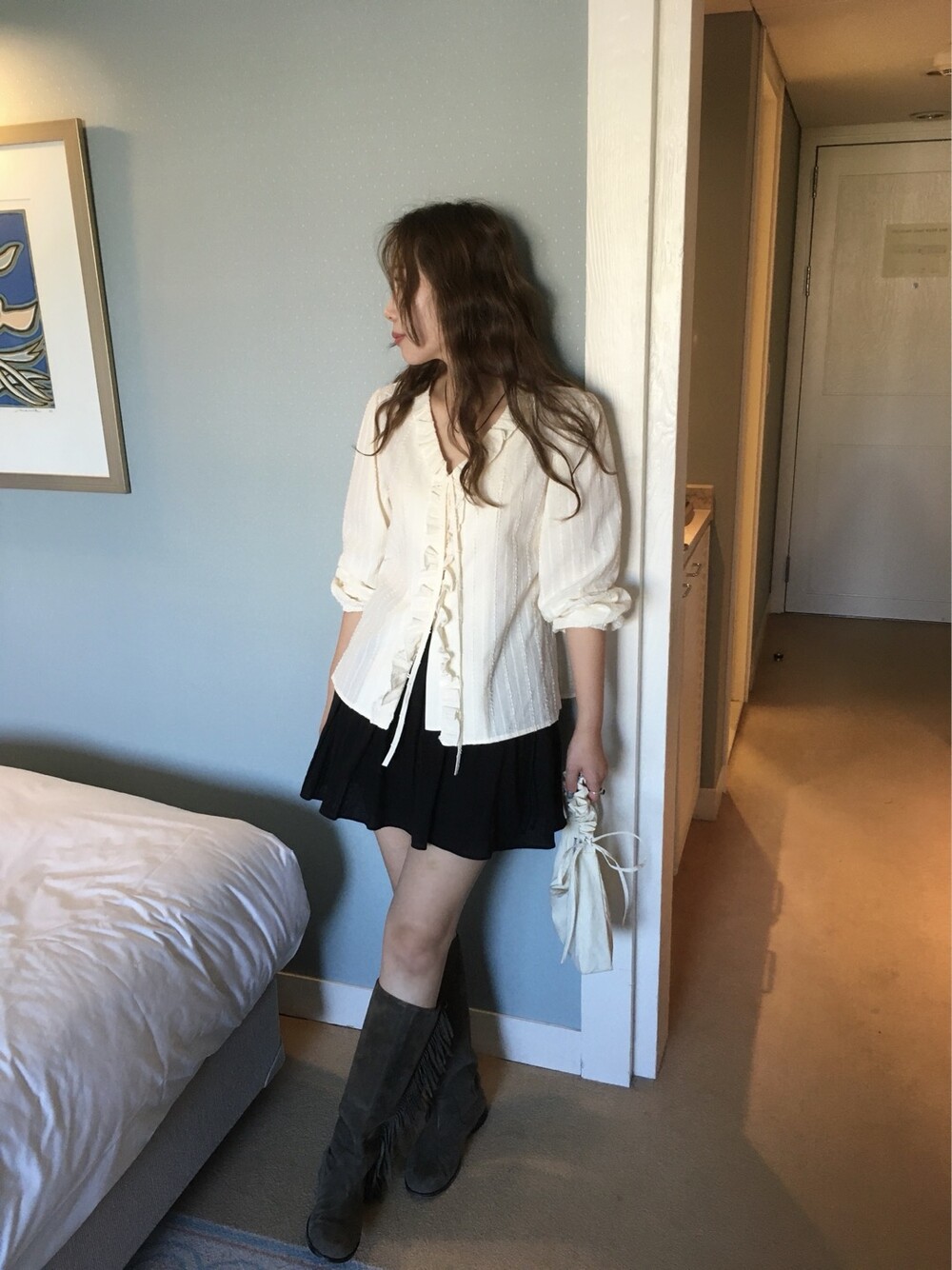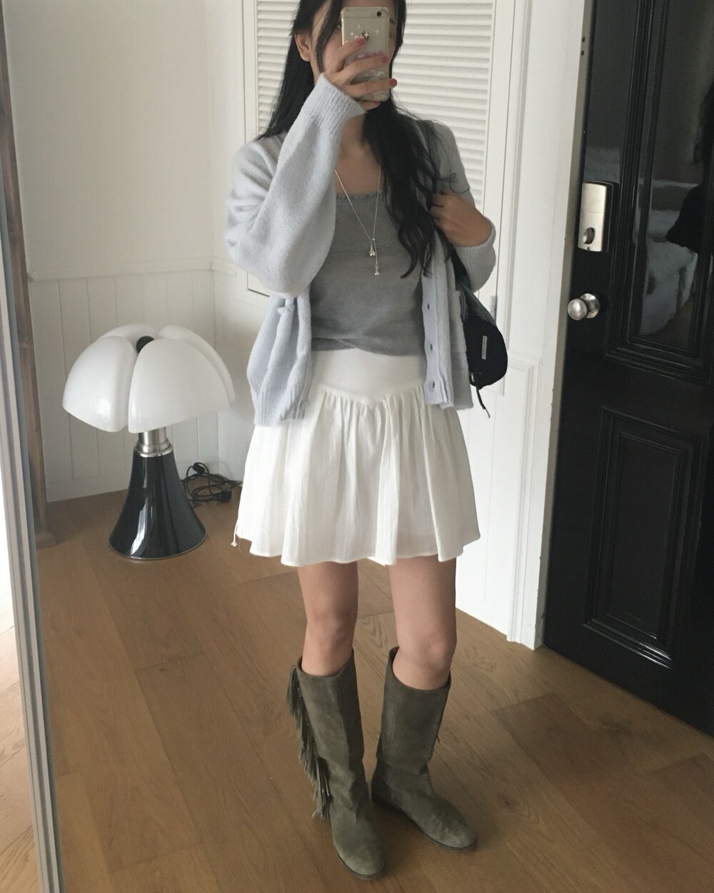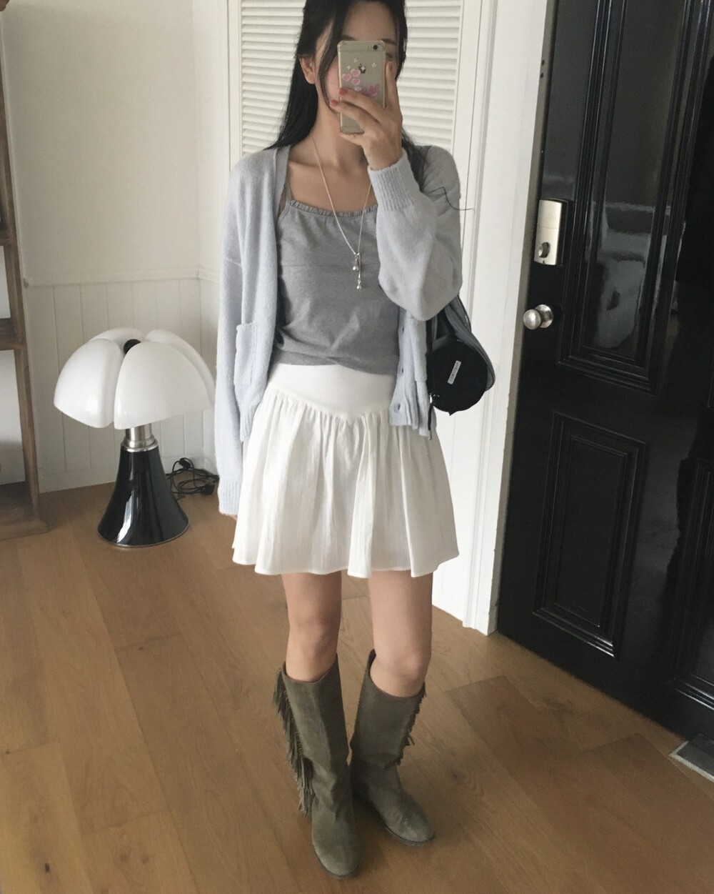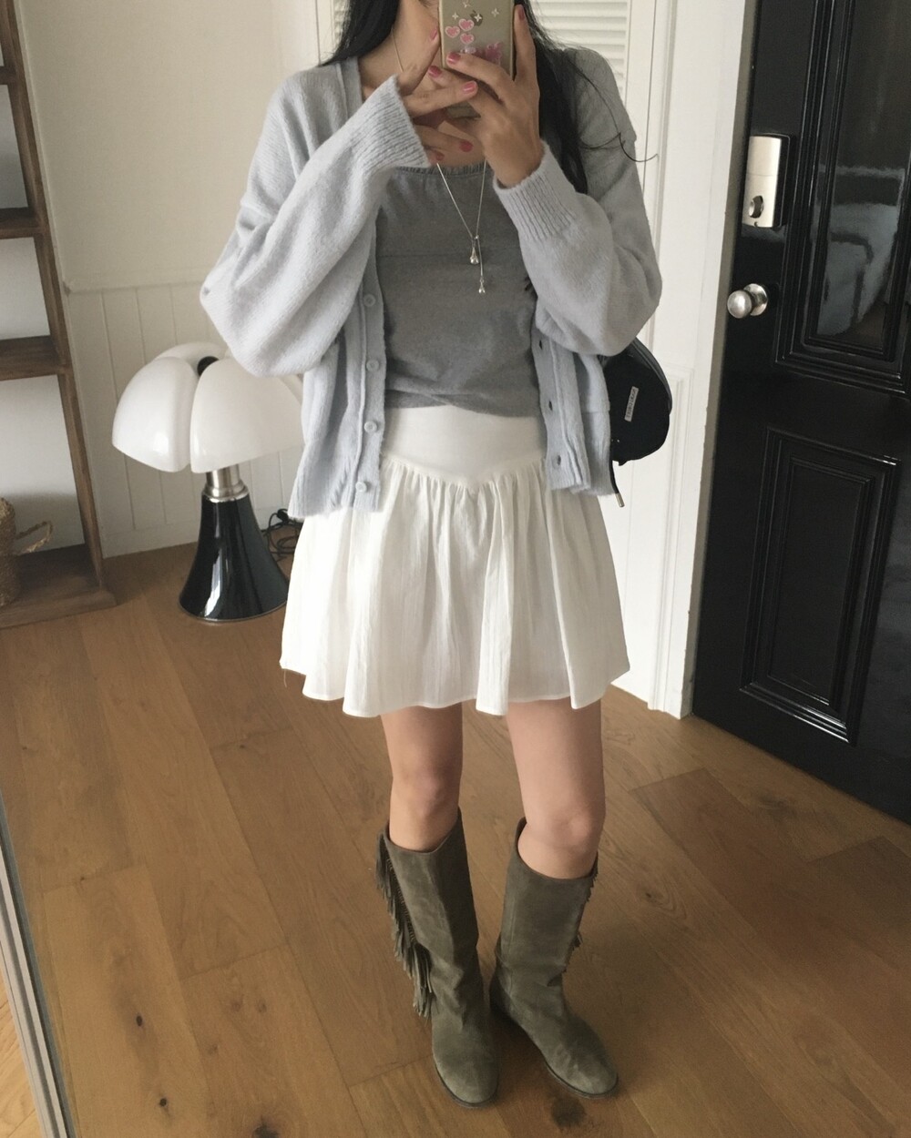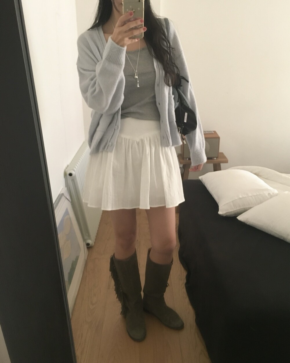 V자 절개선 아래로 촘촘하게 잡힌 셔링 스커트로 하단이 자연스럽게 퍼지는 볼륨감 있는 실루엣을 완성하고, 체형 보완은 물론, 걸을 때마다 살랑거리는 느낌이 매력적인 여리여리한 무드를 연출합니다.