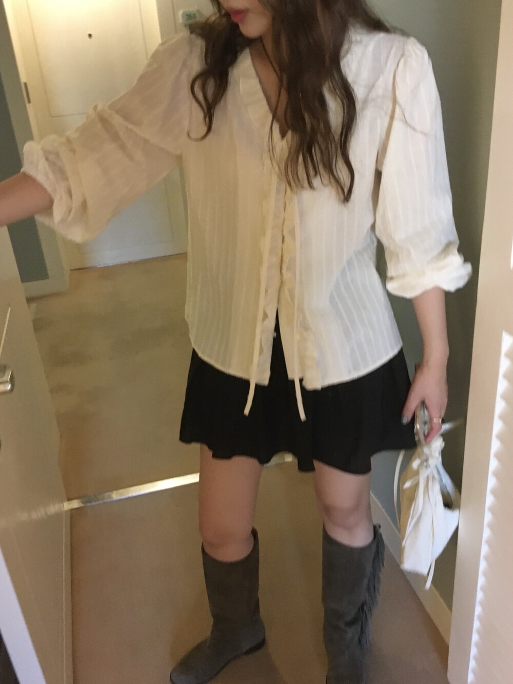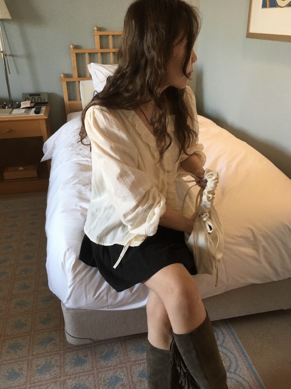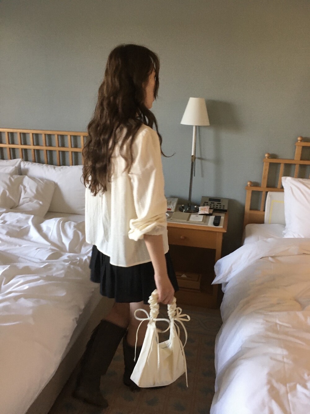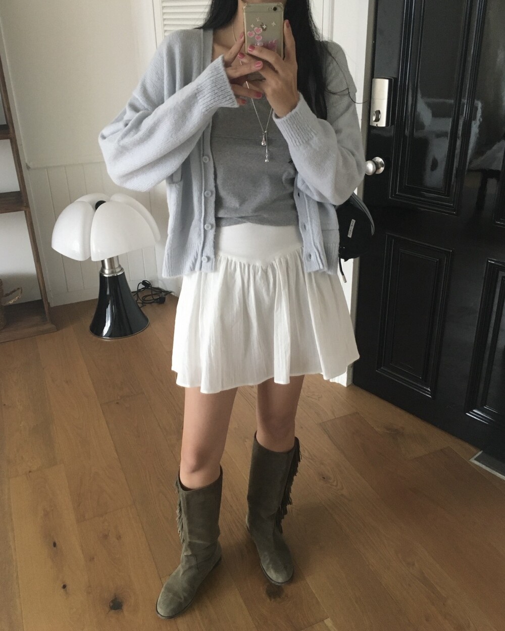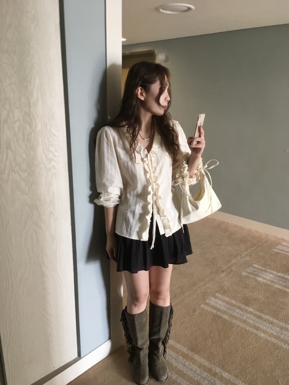 V자 절개선 아래로 촘촘하게 잡힌 셔링 스커트로 하단이 자연스럽게 퍼지는 볼륨감 있는 실루엣을 완성하고, 체형 보완은 물론, 걸을 때마다 살랑거리는 느낌이 매력적인 여리여리한 무드를 연출합니다.