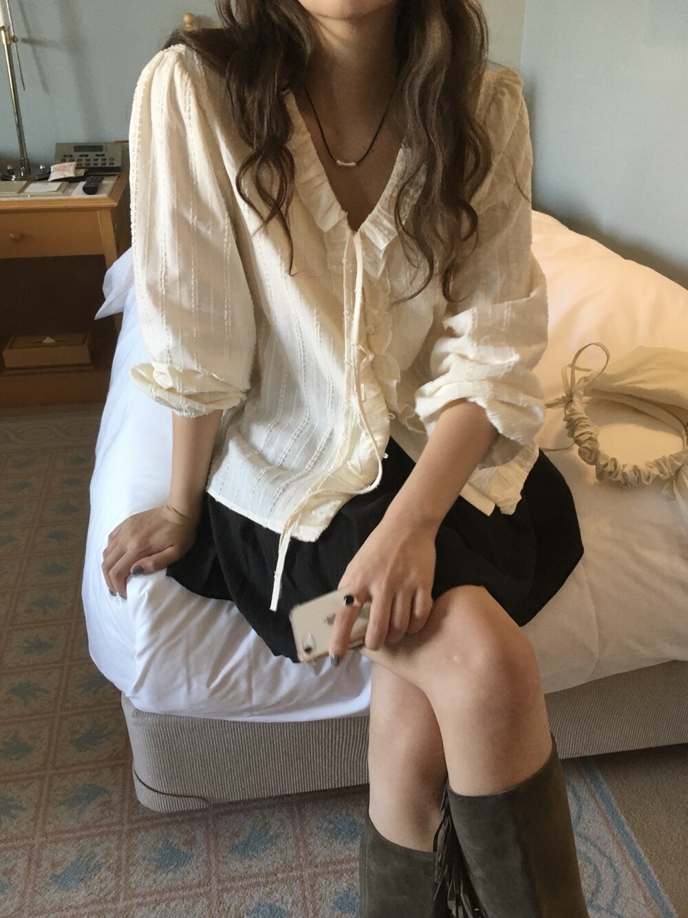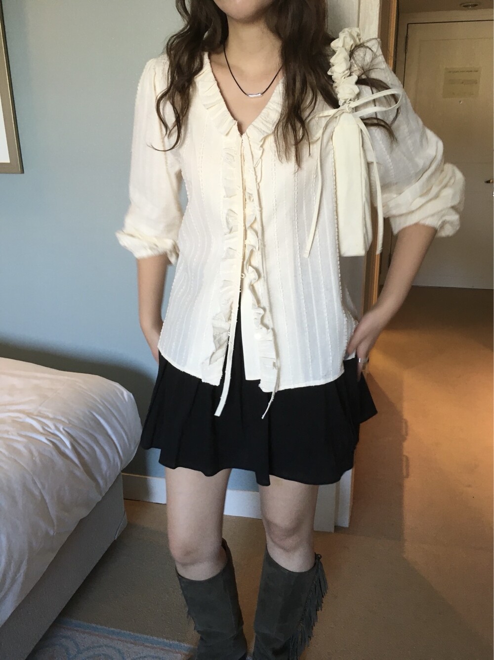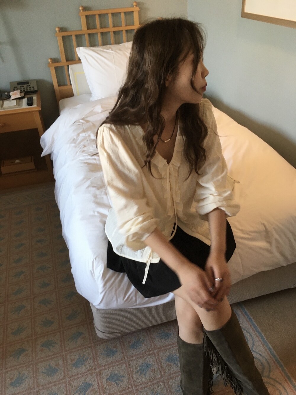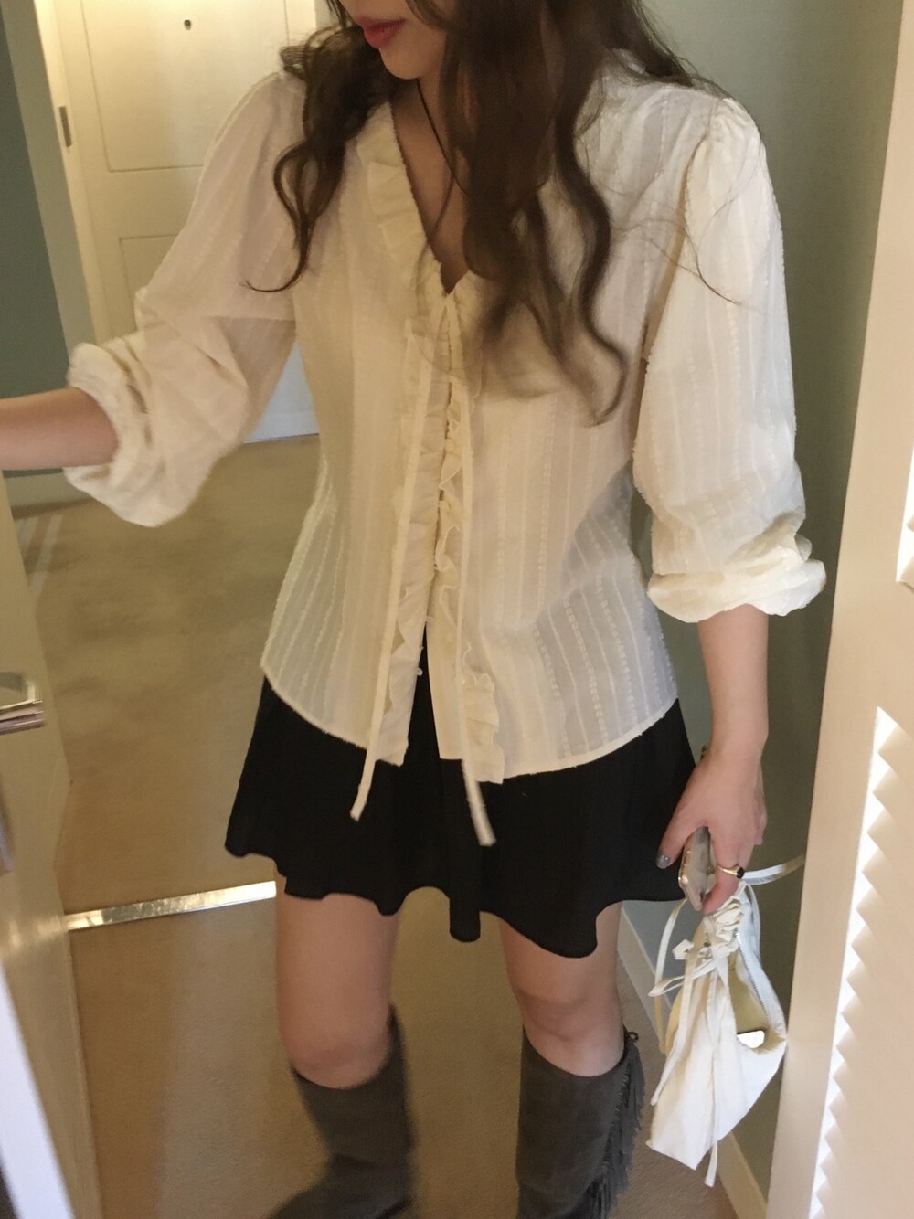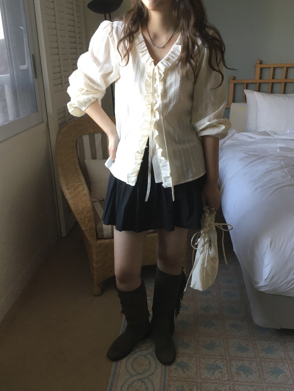 V자 절개선 아래로 촘촘하게 잡힌 셔링 스커트로 하단이 자연스럽게 퍼지는 볼륨감 있는 실루엣을 완성하고, 체형 보완은 물론, 걸을 때마다 살랑거리는 느낌이 매력적인 여리여리한 무드를 연출합니다.
