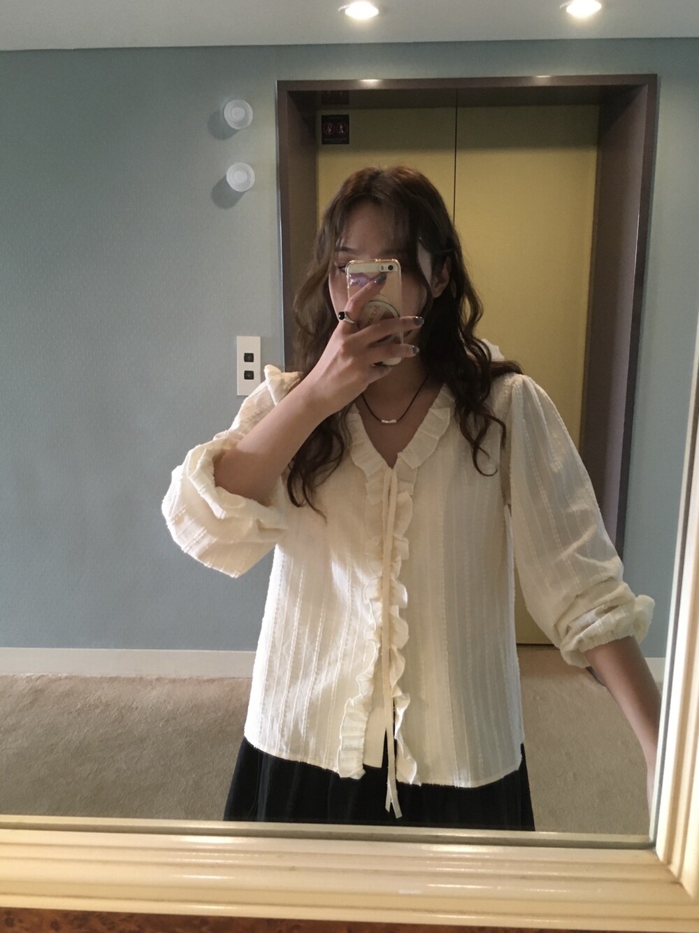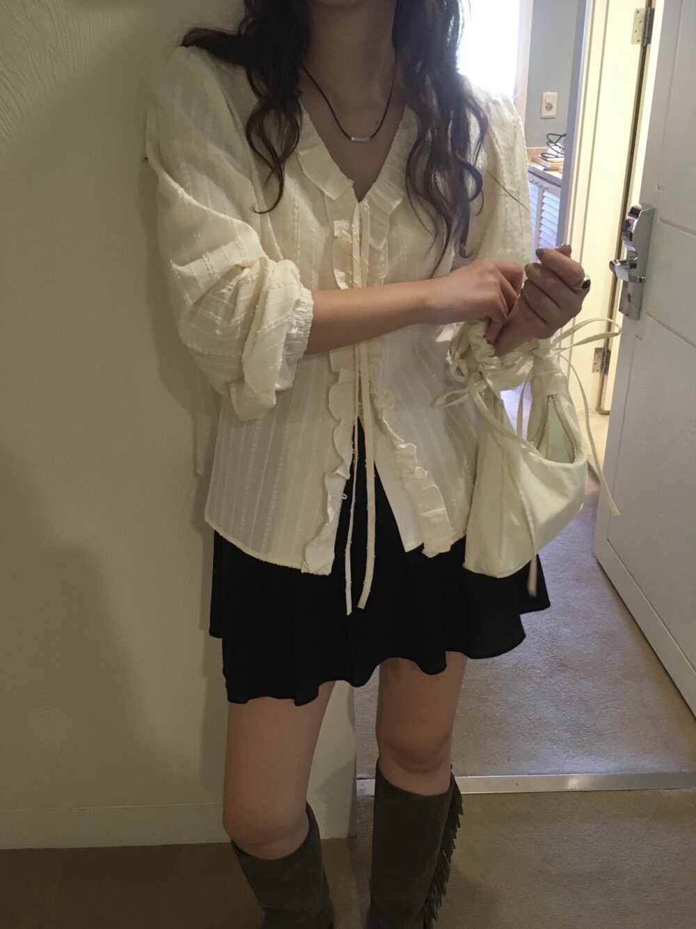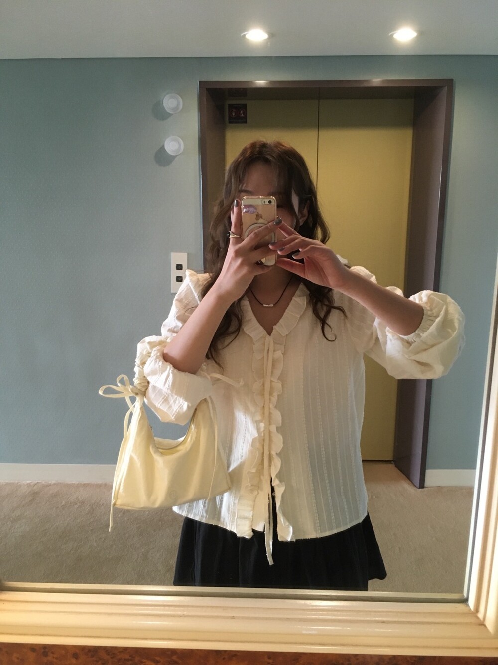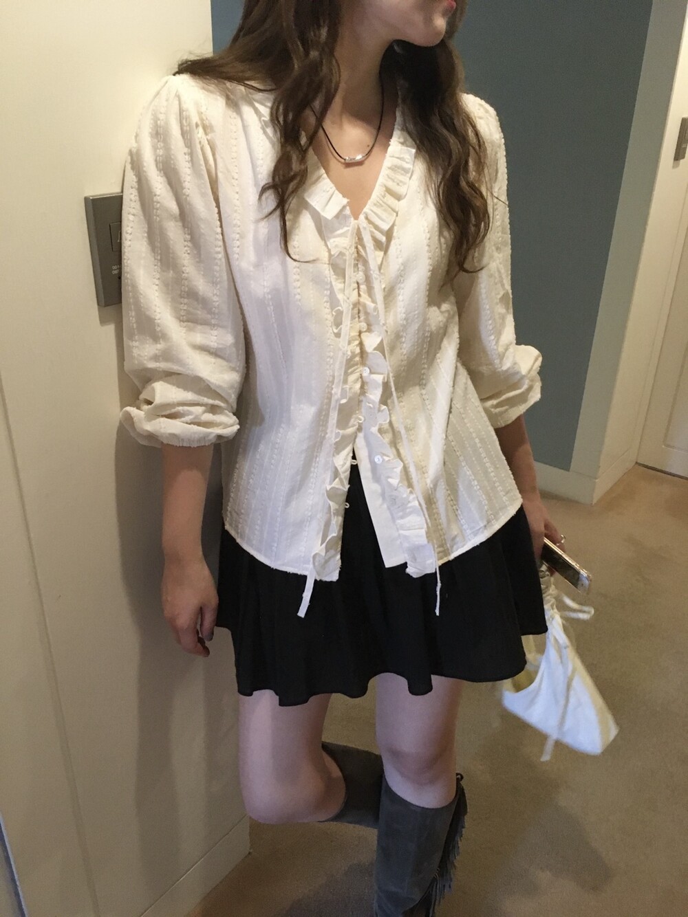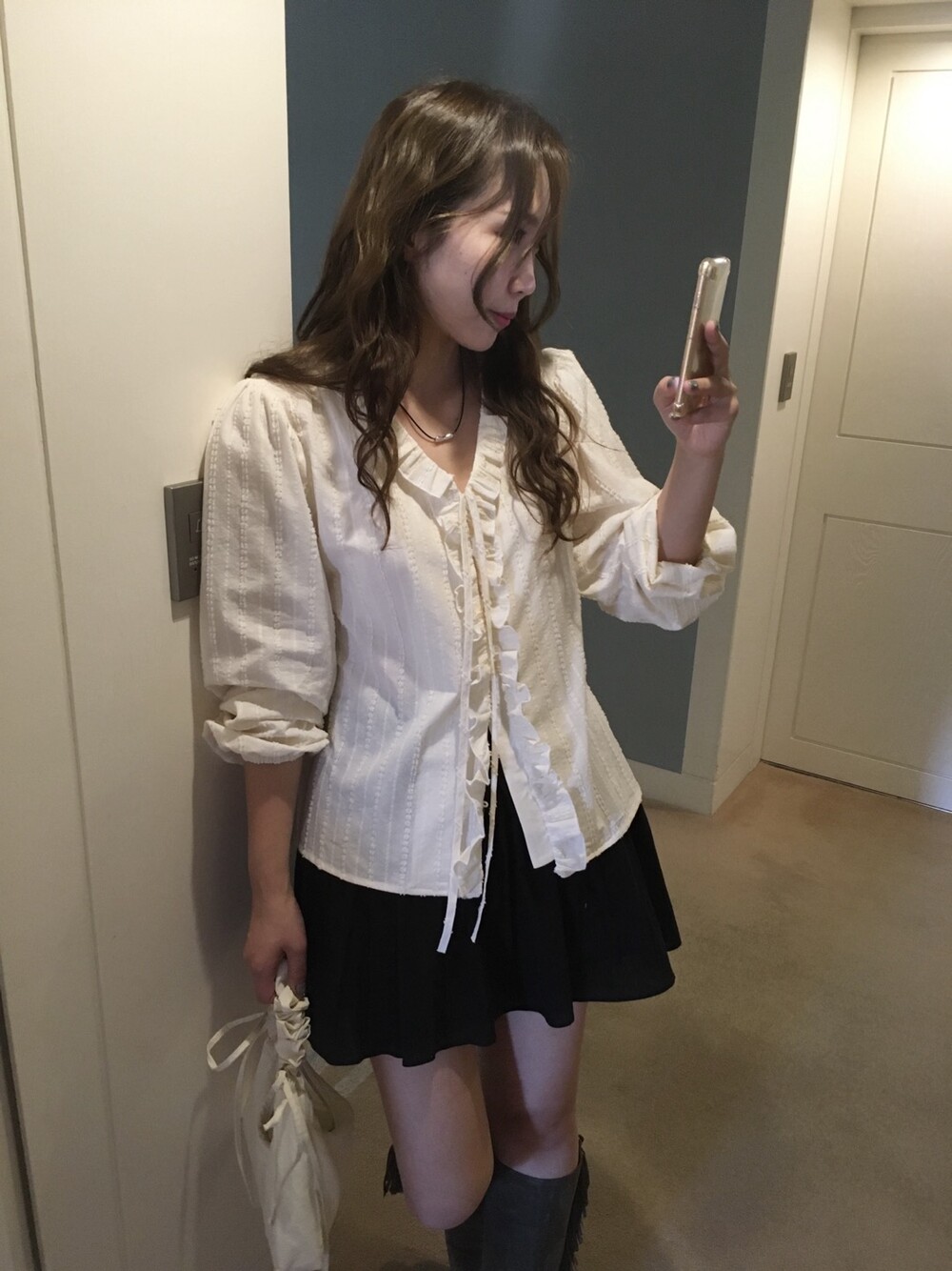 V자 절개선 아래로 촘촘하게 잡힌 셔링 스커트로 하단이 자연스럽게 퍼지는 볼륨감 있는 실루엣을 완성하고, 체형 보완은 물론, 걸을 때마다 살랑거리는 느낌이 매력적인 여리여리한 무드를 연출합니다.