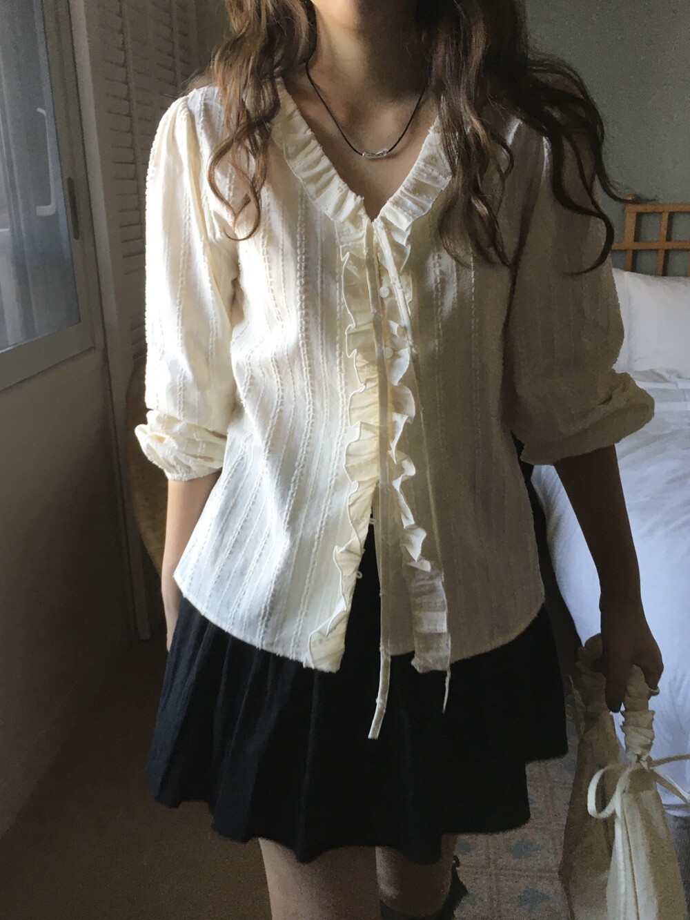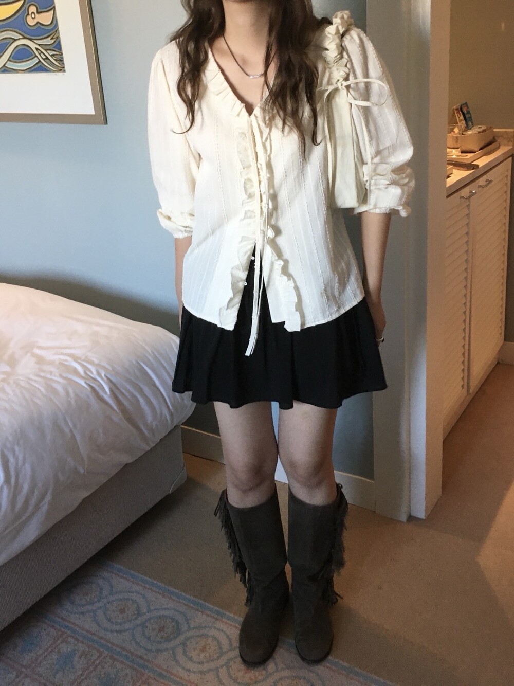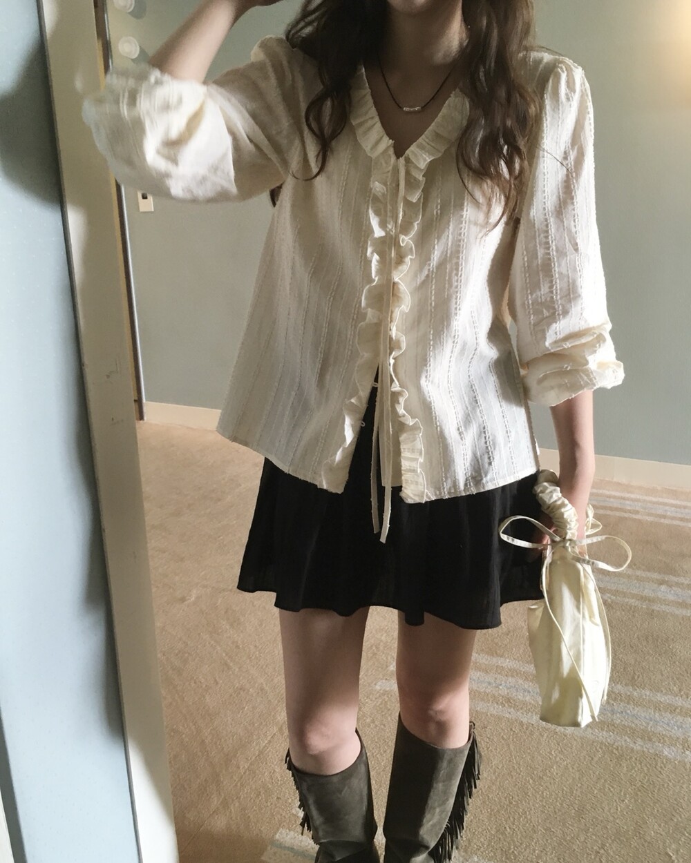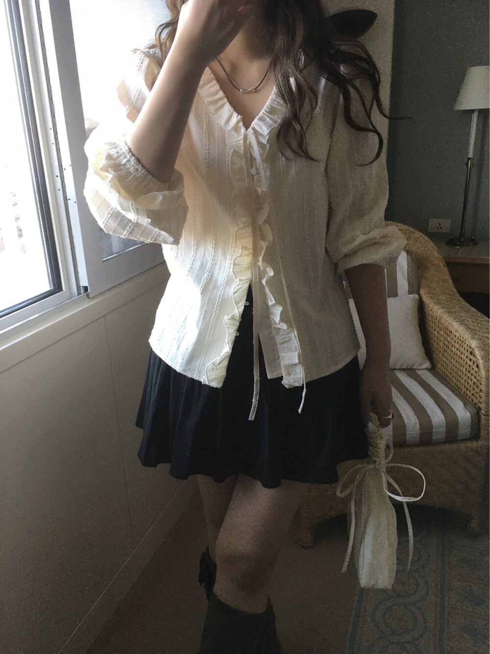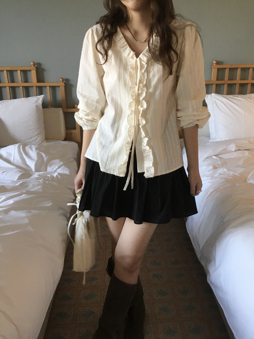 V자 절개선 아래로 촘촘하게 잡힌 셔링 스커트로 하단이 자연스럽게 퍼지는 볼륨감 있는 실루엣을 완성하고, 체형 보완은 물론, 걸을 때마다 살랑거리는 느낌이 매력적인 여리여리한 무드를 연출합니다.