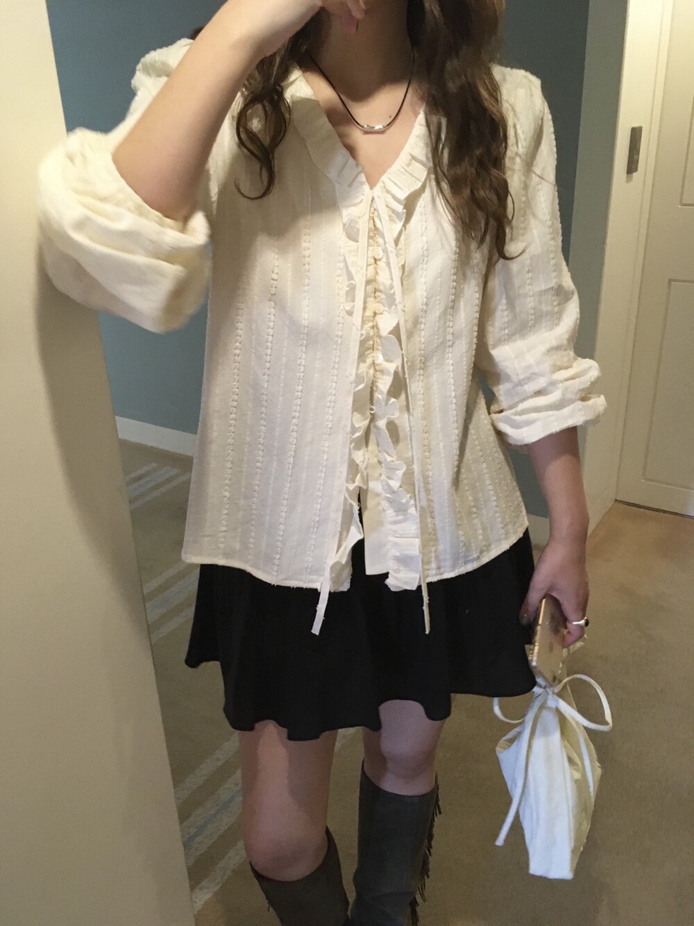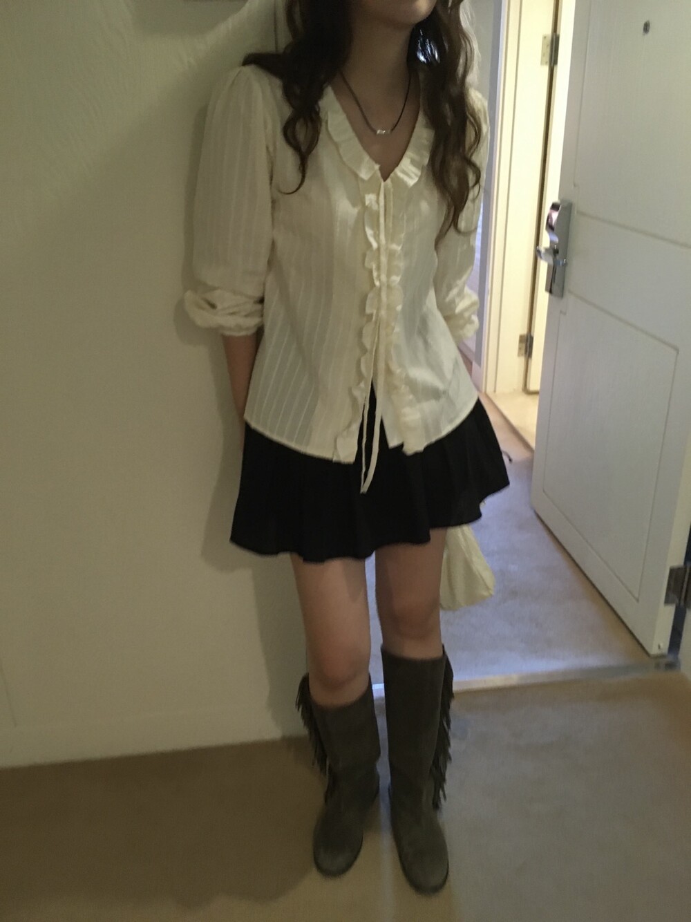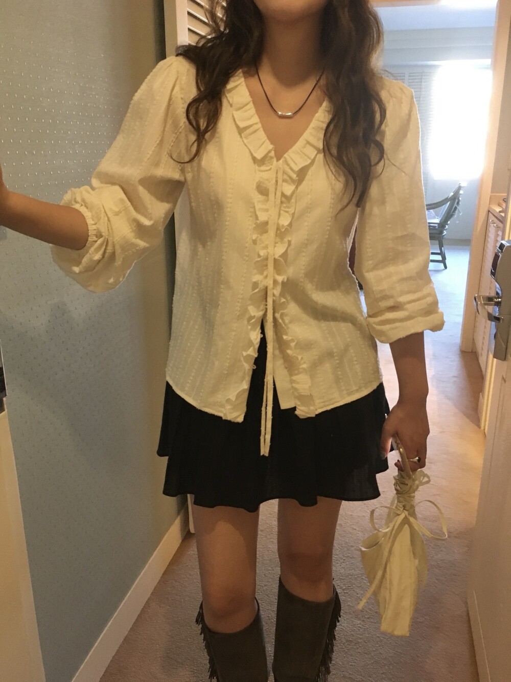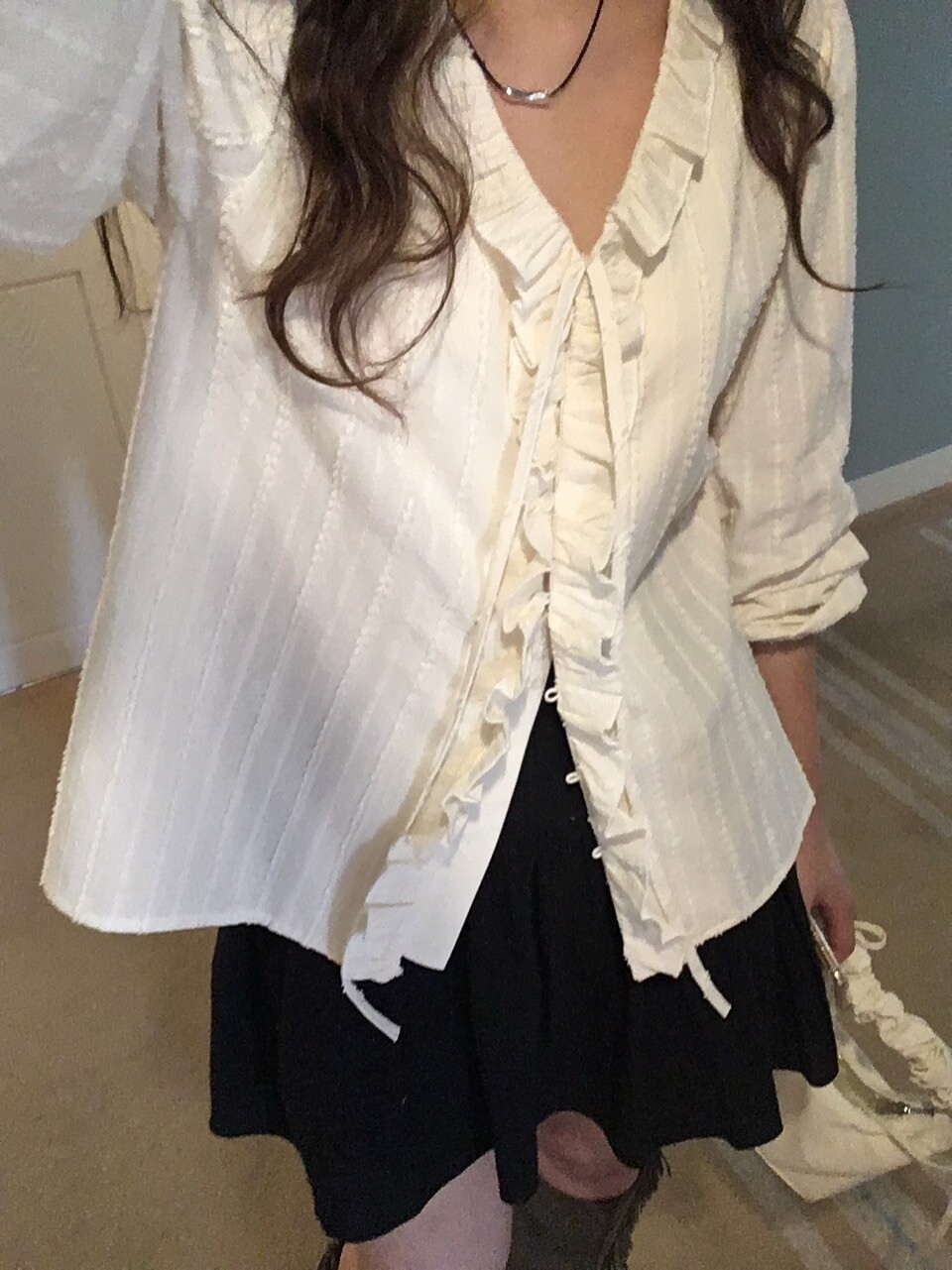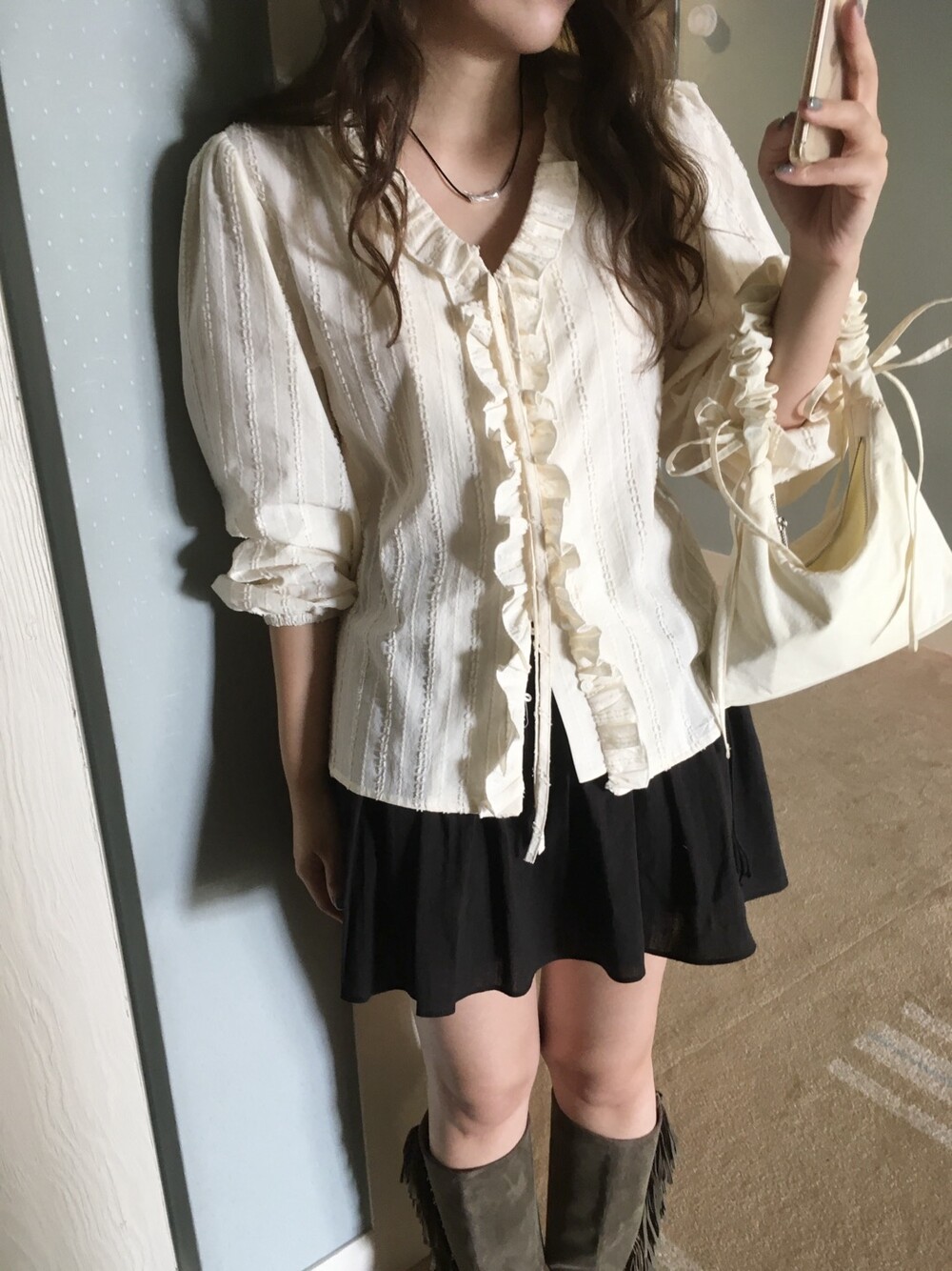 V자 절개선 아래로 촘촘하게 잡힌 셔링 스커트로 하단이 자연스럽게 퍼지는 볼륨감 있는 실루엣을 완성하고, 체형 보완은 물론, 걸을 때마다 살랑거리는 느낌이 매력적인 여리여리한 무드를 연출합니다.