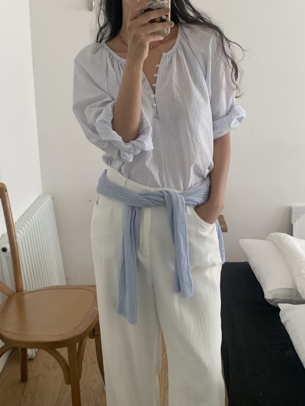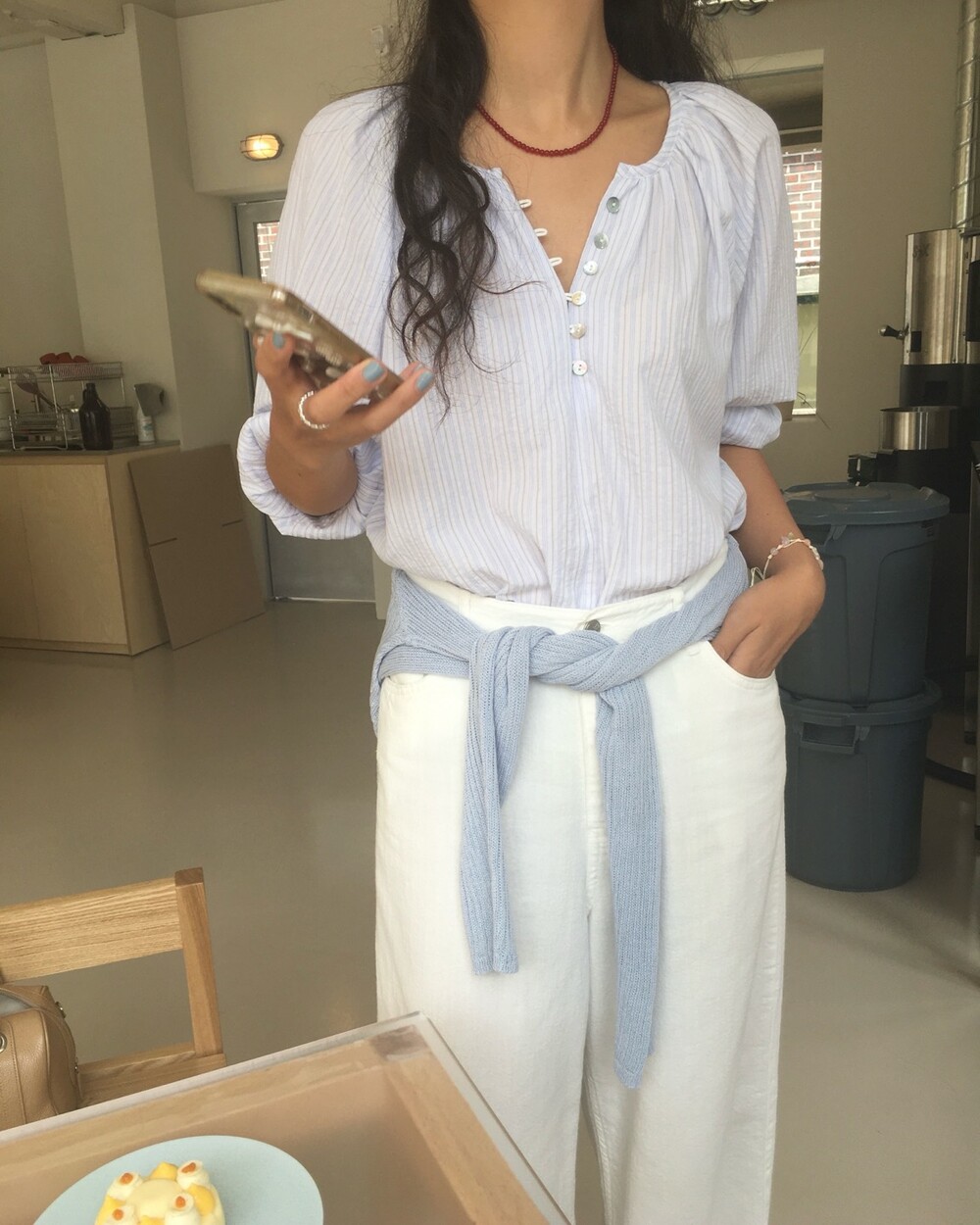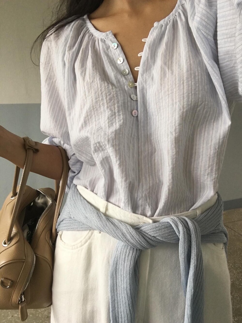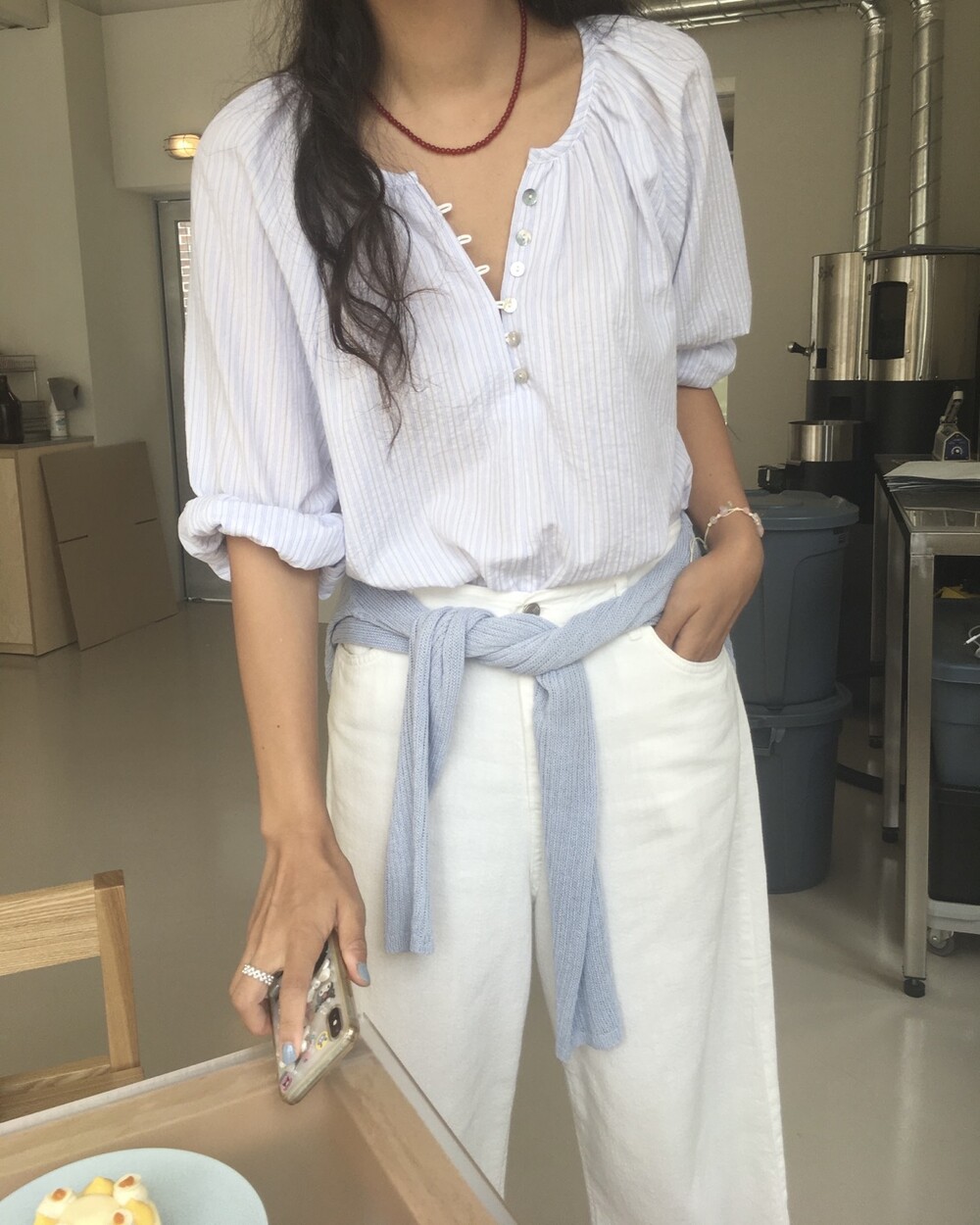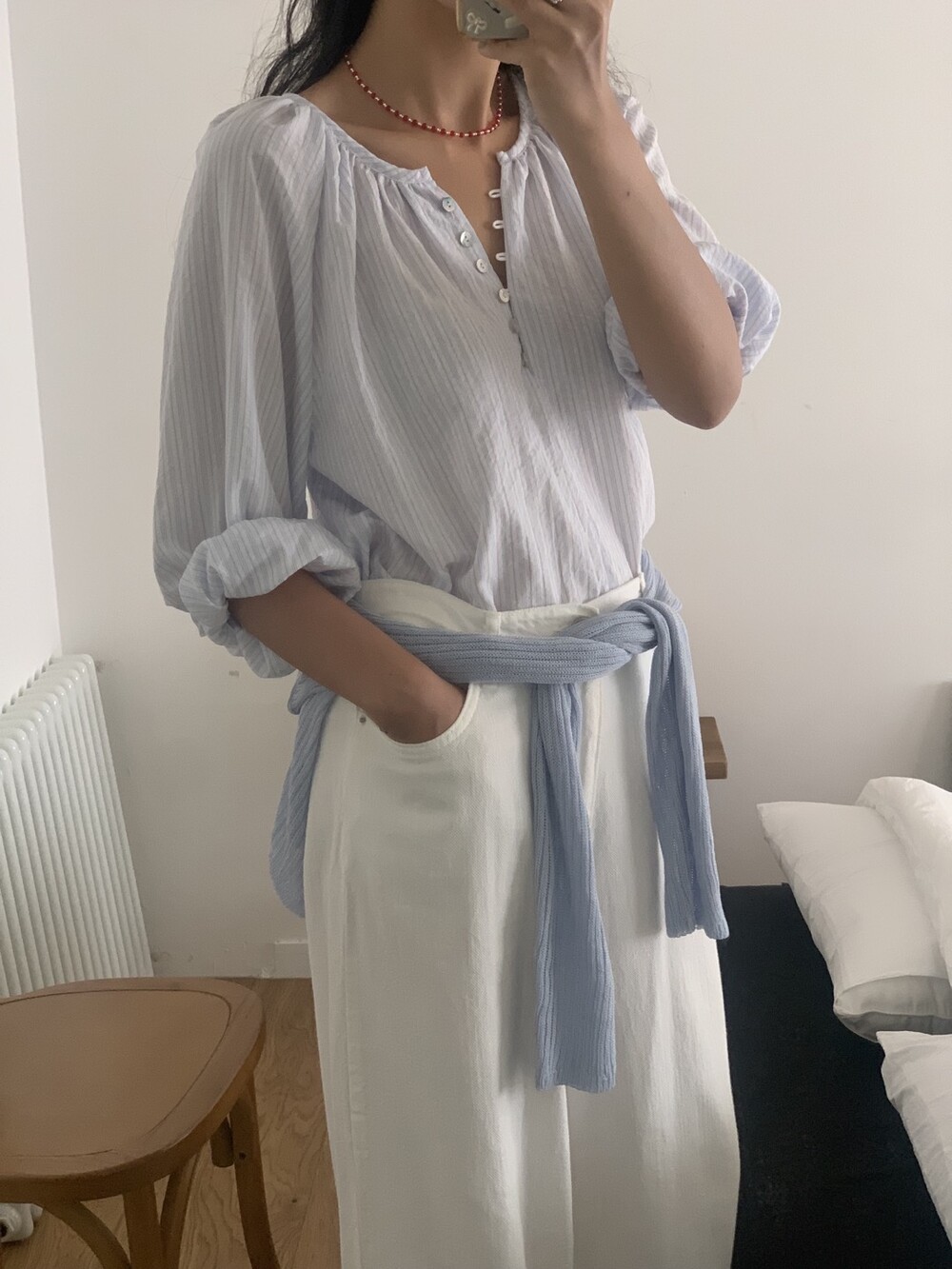 살에 닿는 순간 기분 좋은 촉감이 느껴지며, 햇빛을 막아주는 가볍고 시원한 소재로 제작되어, 봄부터 여름 내내 손이 자주 갈 블라우스랍니다.
