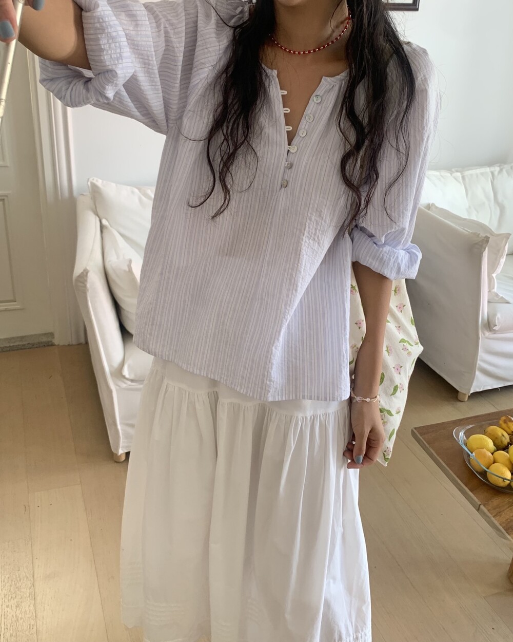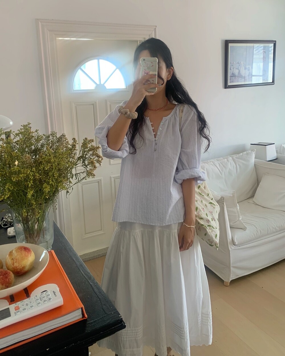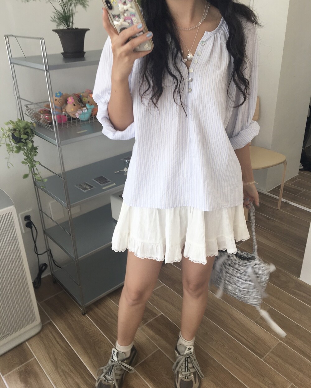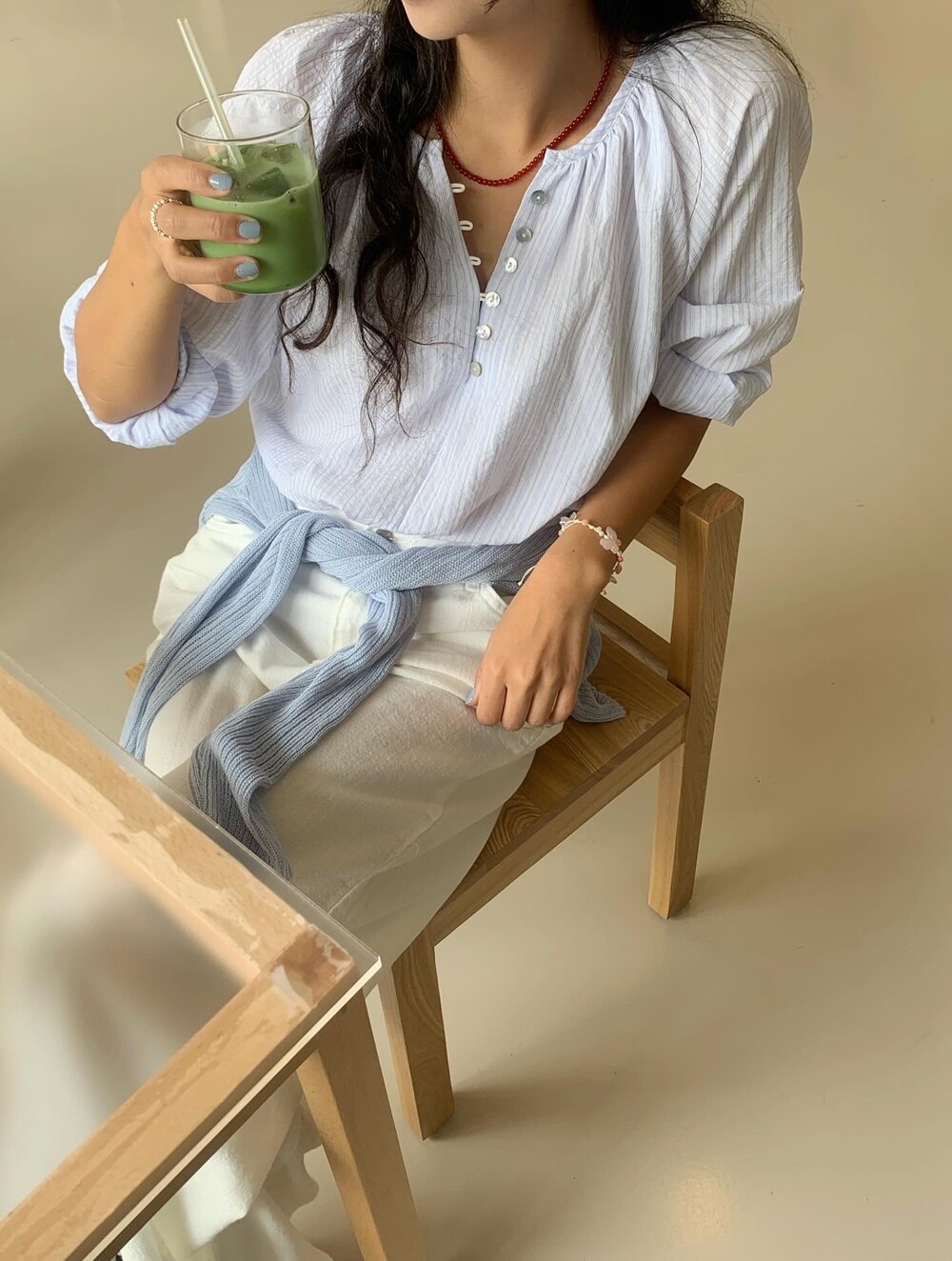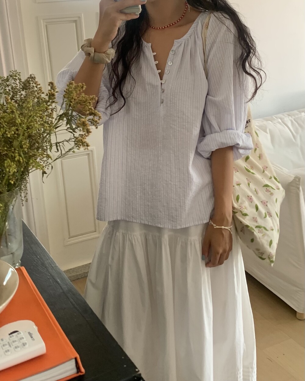 살에 닿는 순간 기분 좋은 촉감이 느껴지며, 햇빛을 막아주는 가볍고 시원한 소재로 제작되어, 봄부터 여름 내내 손이 자주 갈 블라우스랍니다.