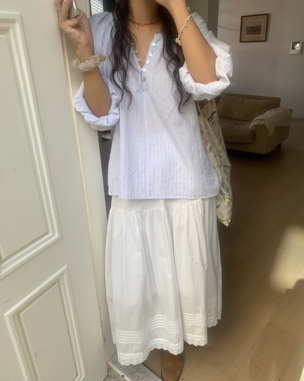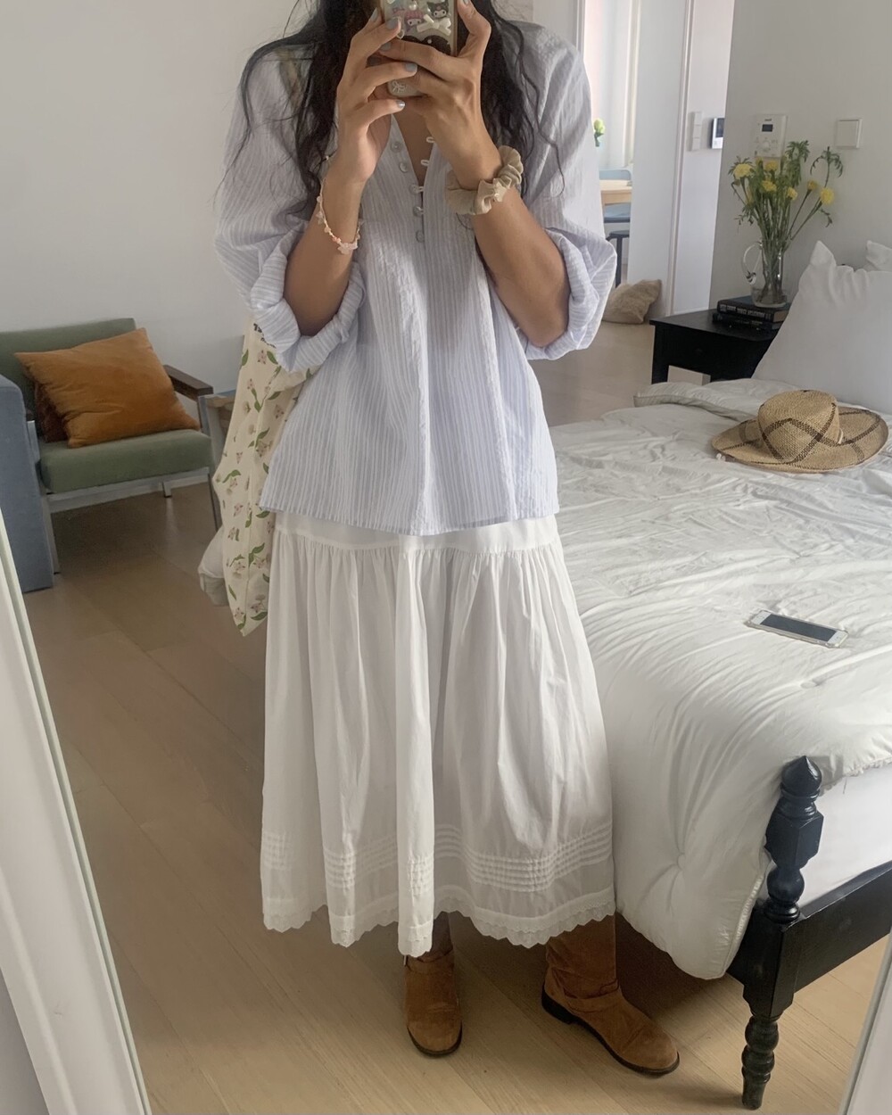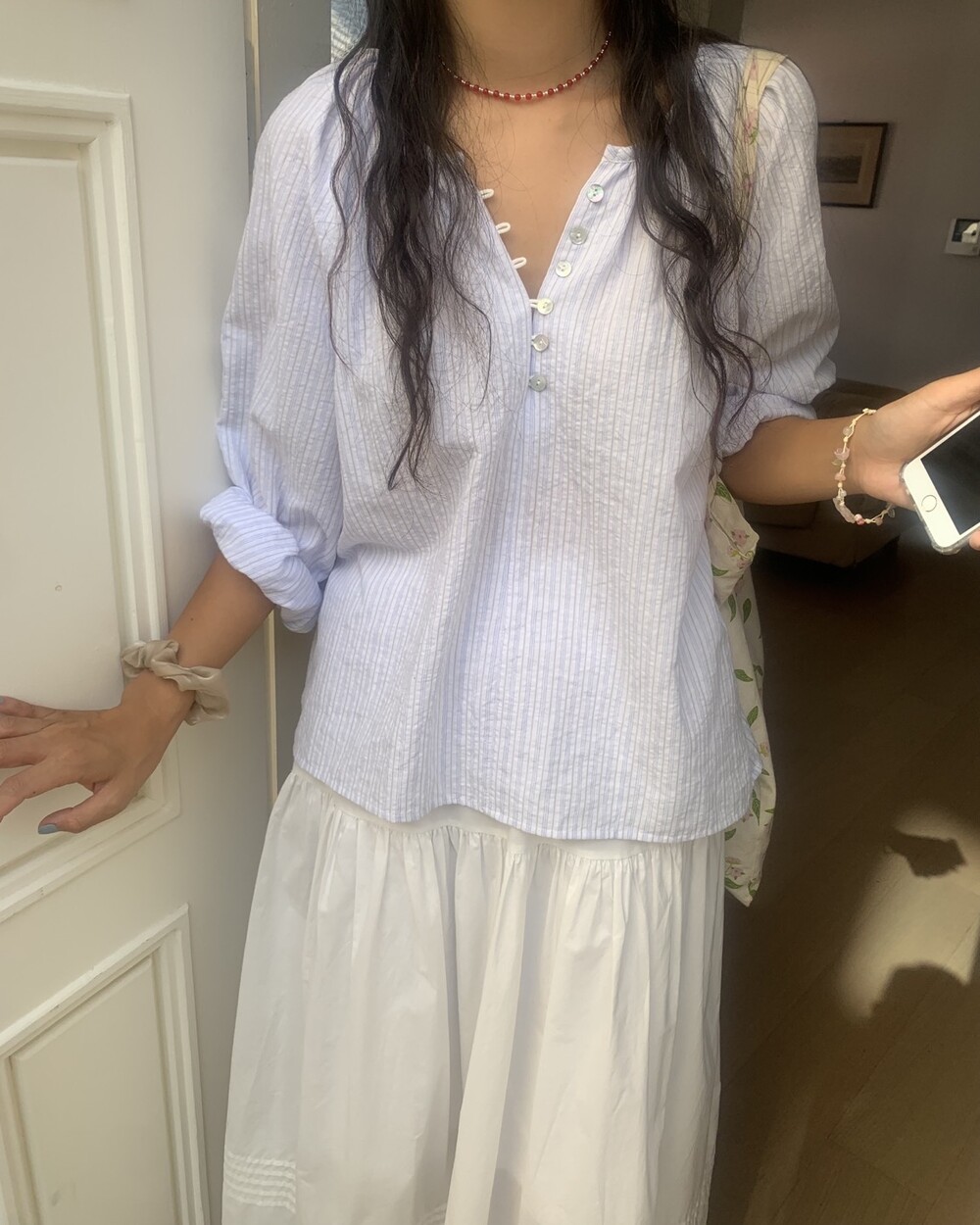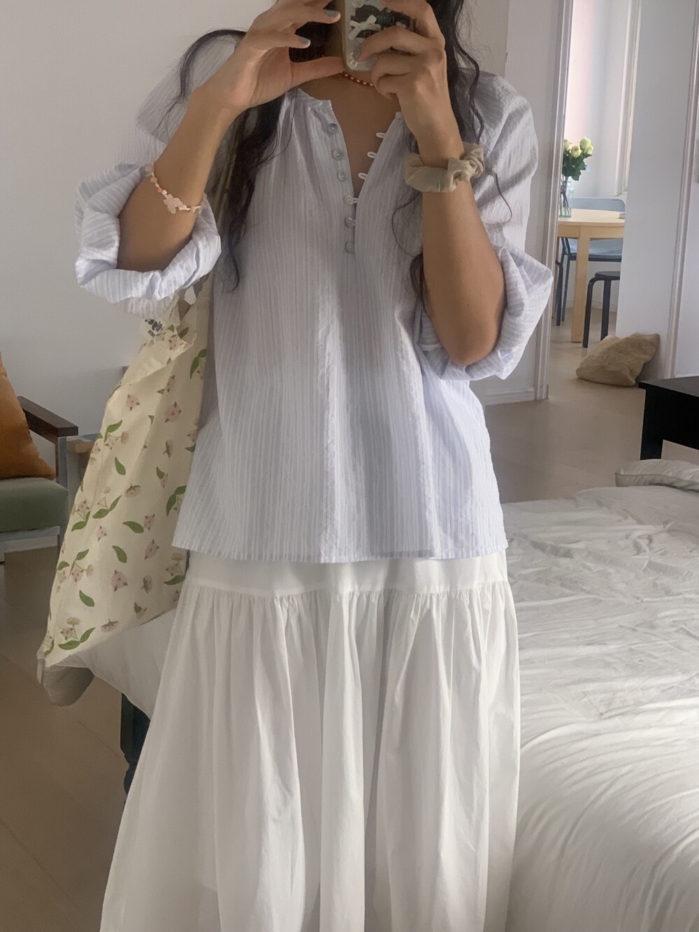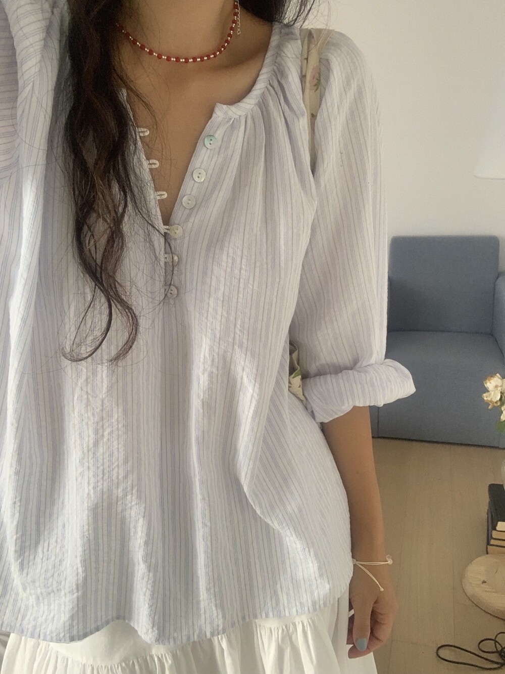 살에 닿는 순간 기분 좋은 촉감이 느껴지며, 햇빛을 막아주는 가볍고 시원한 소재로 제작되어, 봄부터 여름 내내 손이 자주 갈 블라우스랍니다.