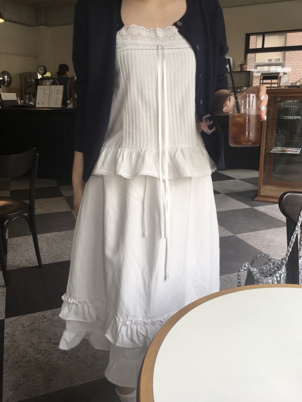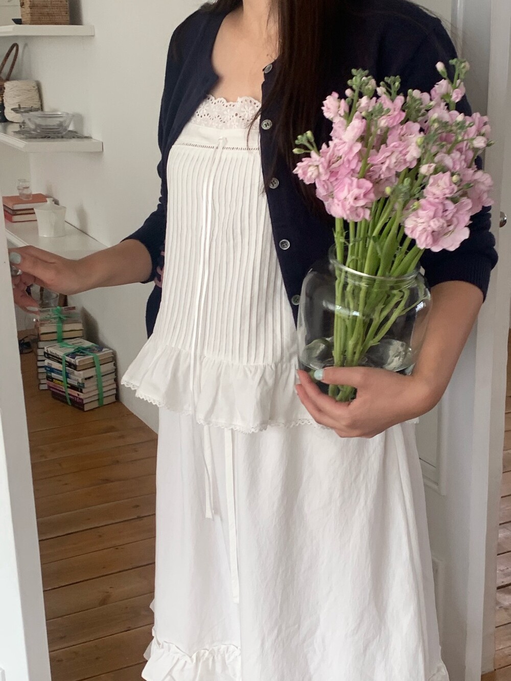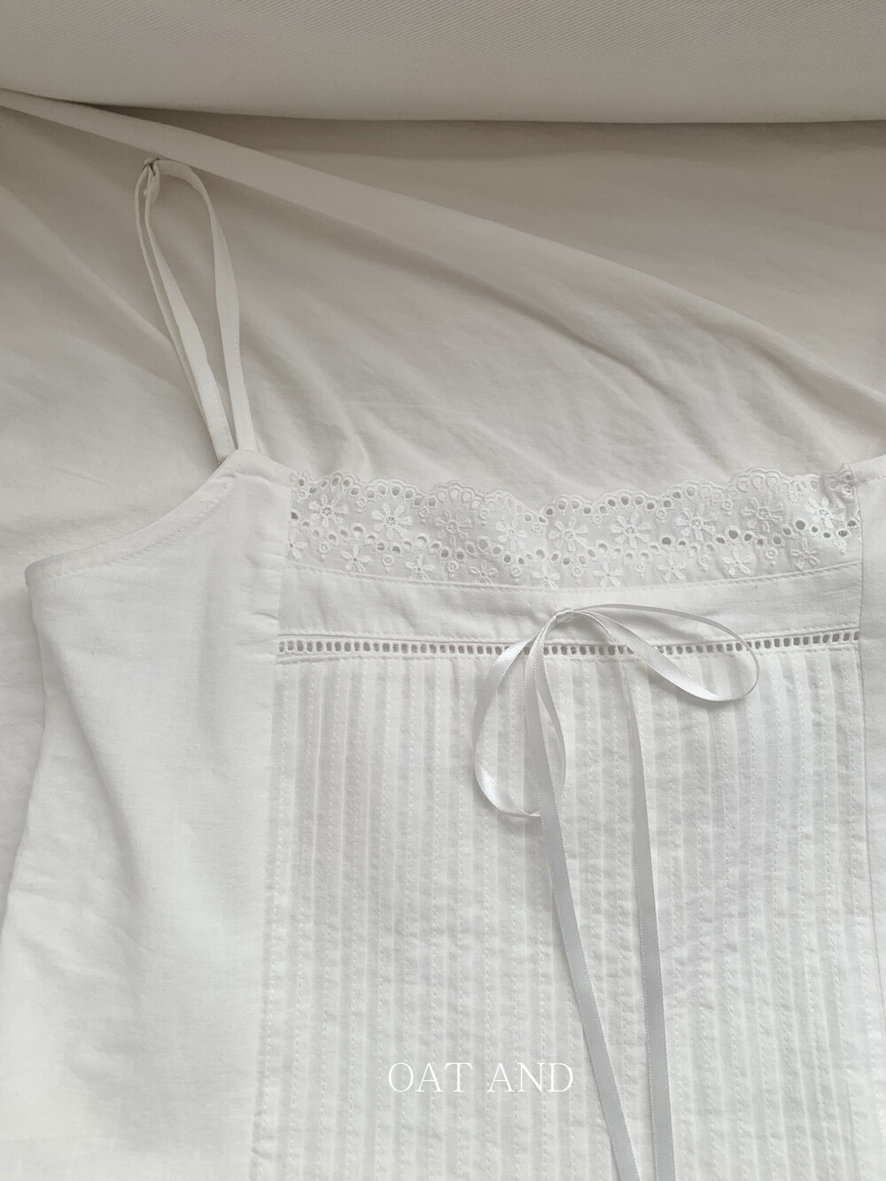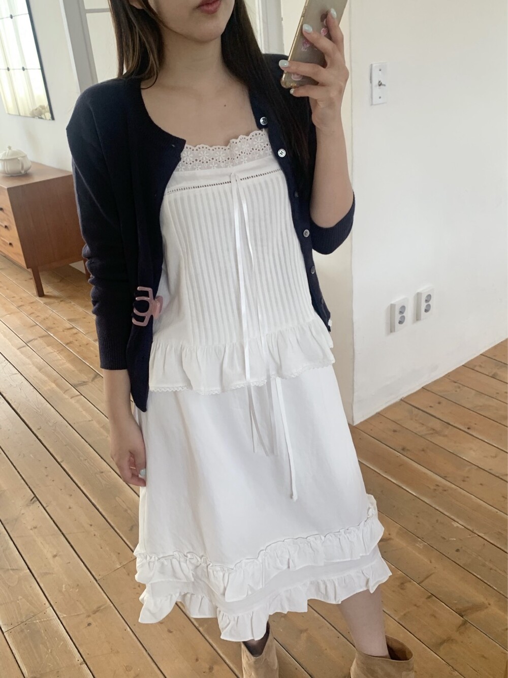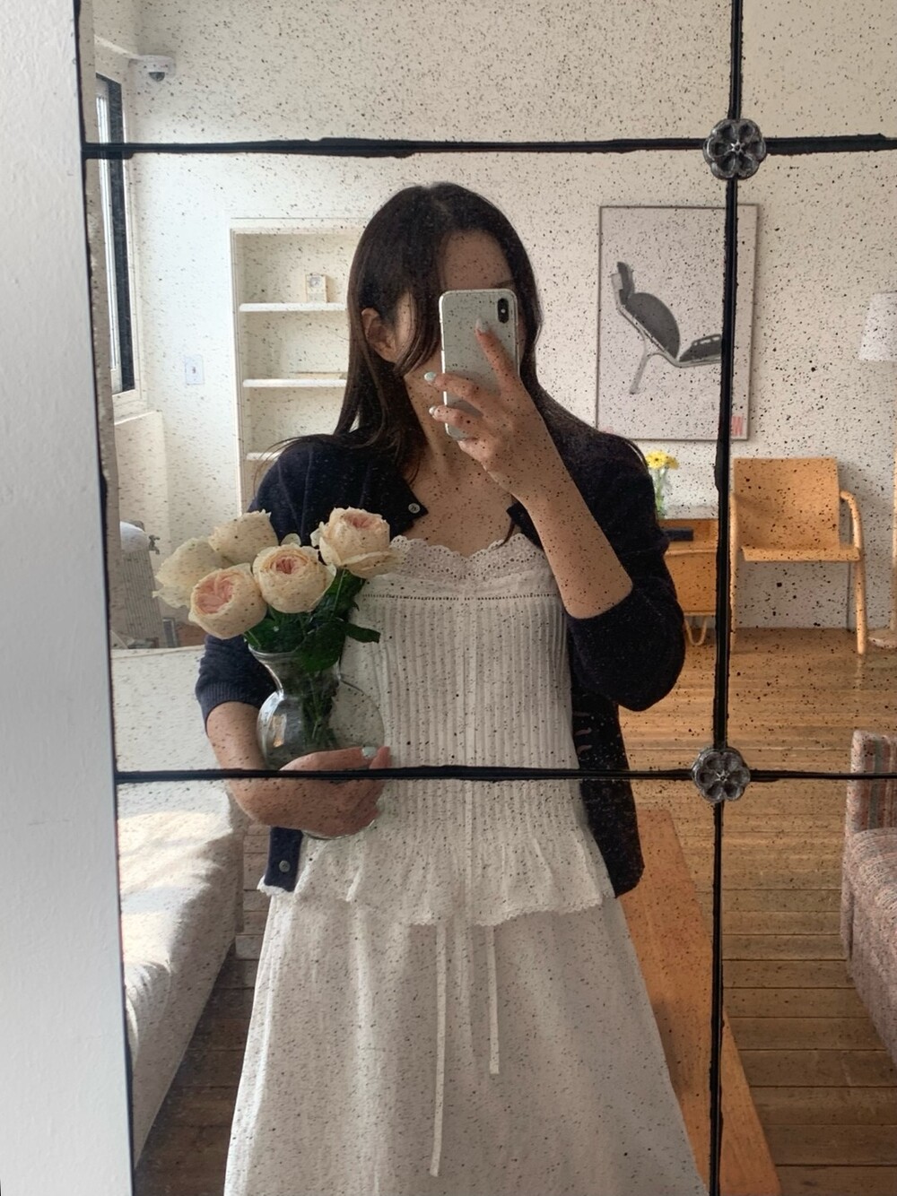 네크라인에 빈티지한 무드의 레이스 디테일이 더해지고, 그 밑으로 사다리 레이스를 더해 사랑스러움이 20000%