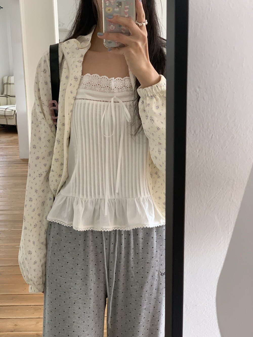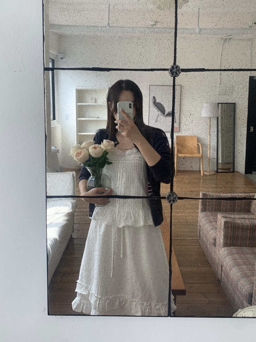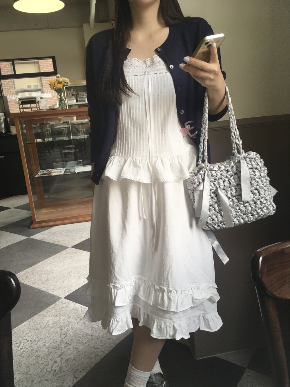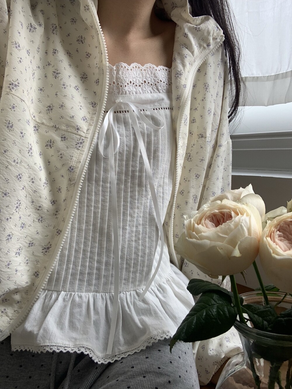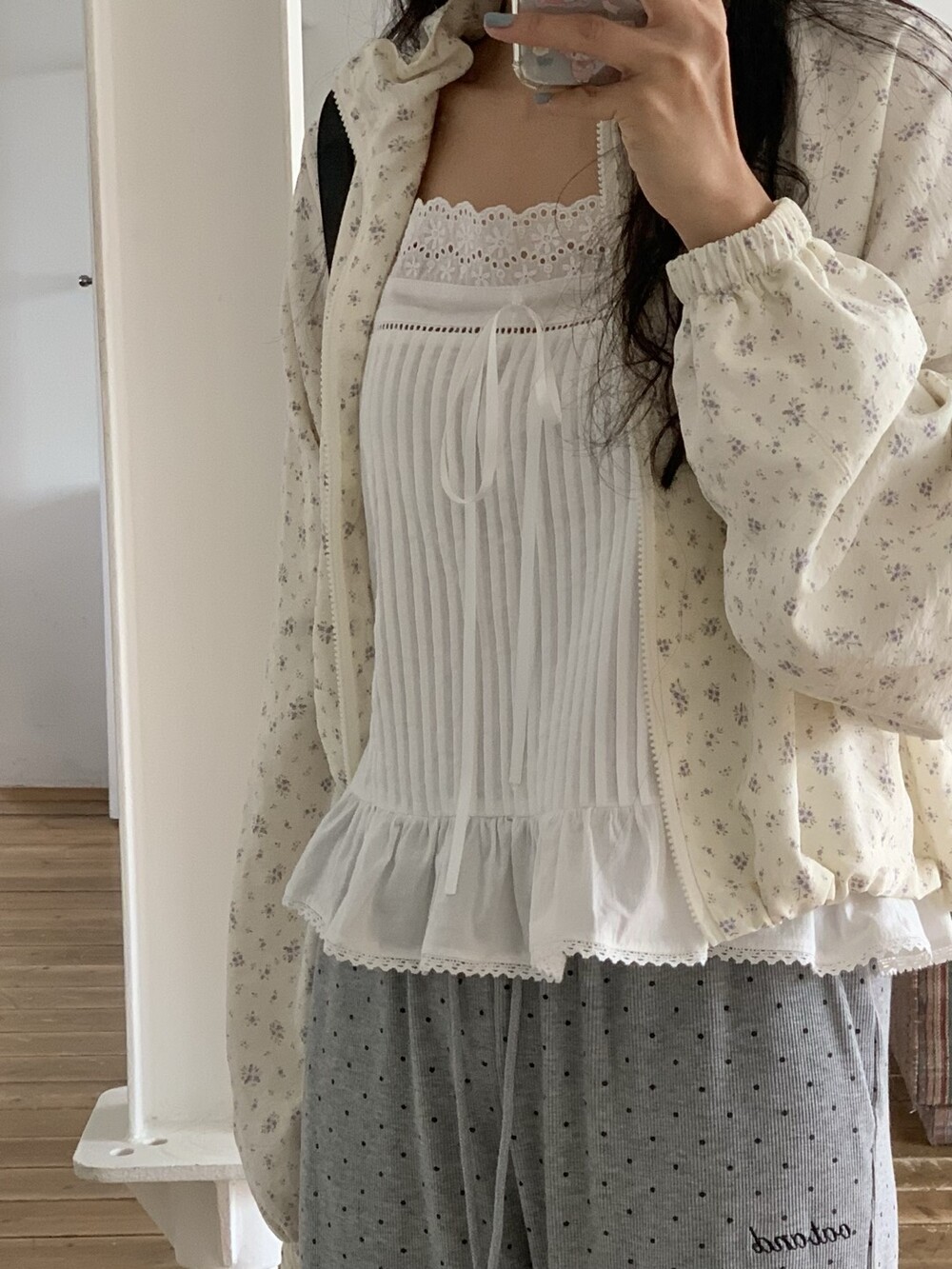 네크라인에 빈티지한 무드의 레이스 디테일이 더해지고, 그 밑으로 사다리 레이스를 더해 사랑스러움이 20000%