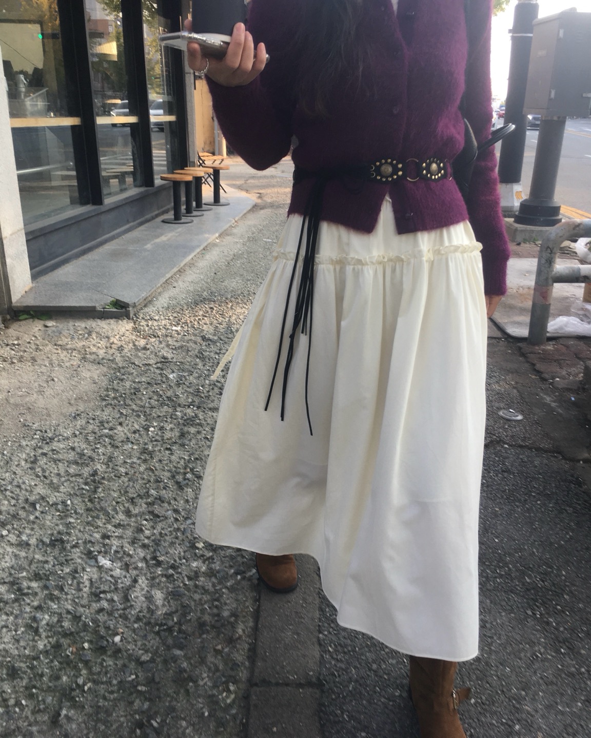 무스탕 퍼자켓, 패딩 등 다양한 코디로 활용하기 좋고, 심 티셔츠, 니트, 가디건 등 어디에나 잘어울리는 스커트랍니다.