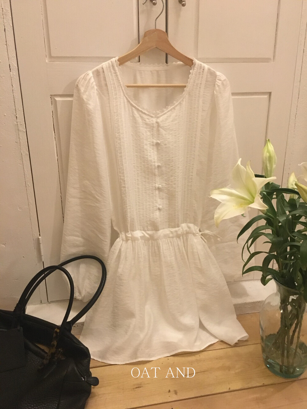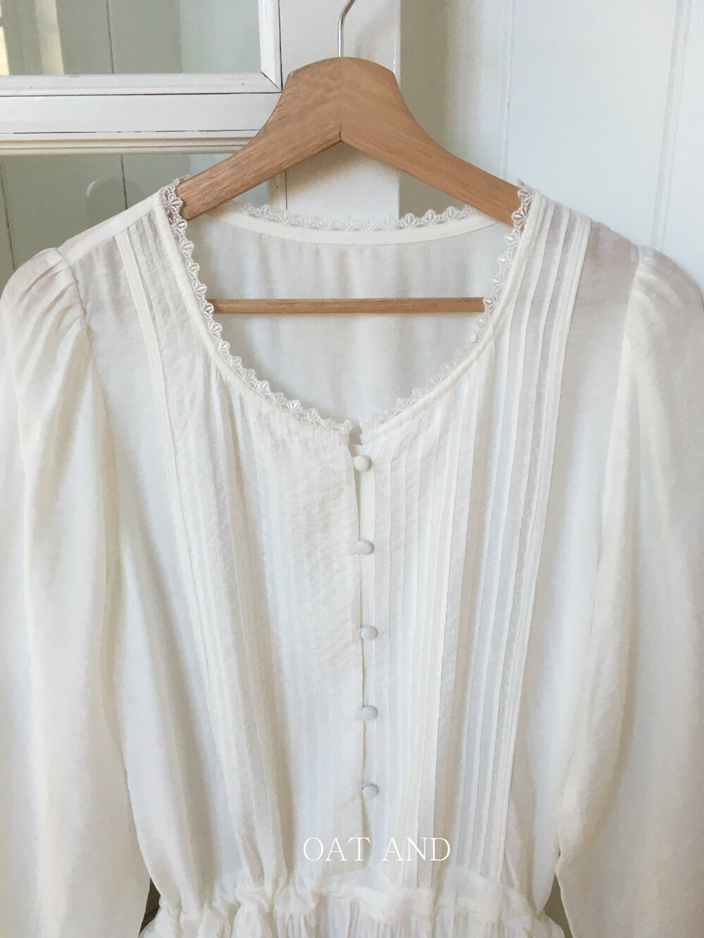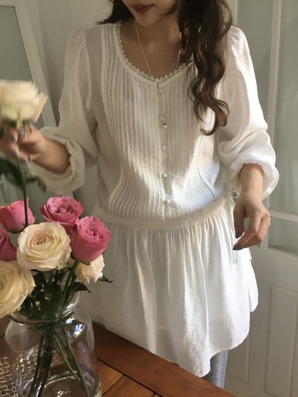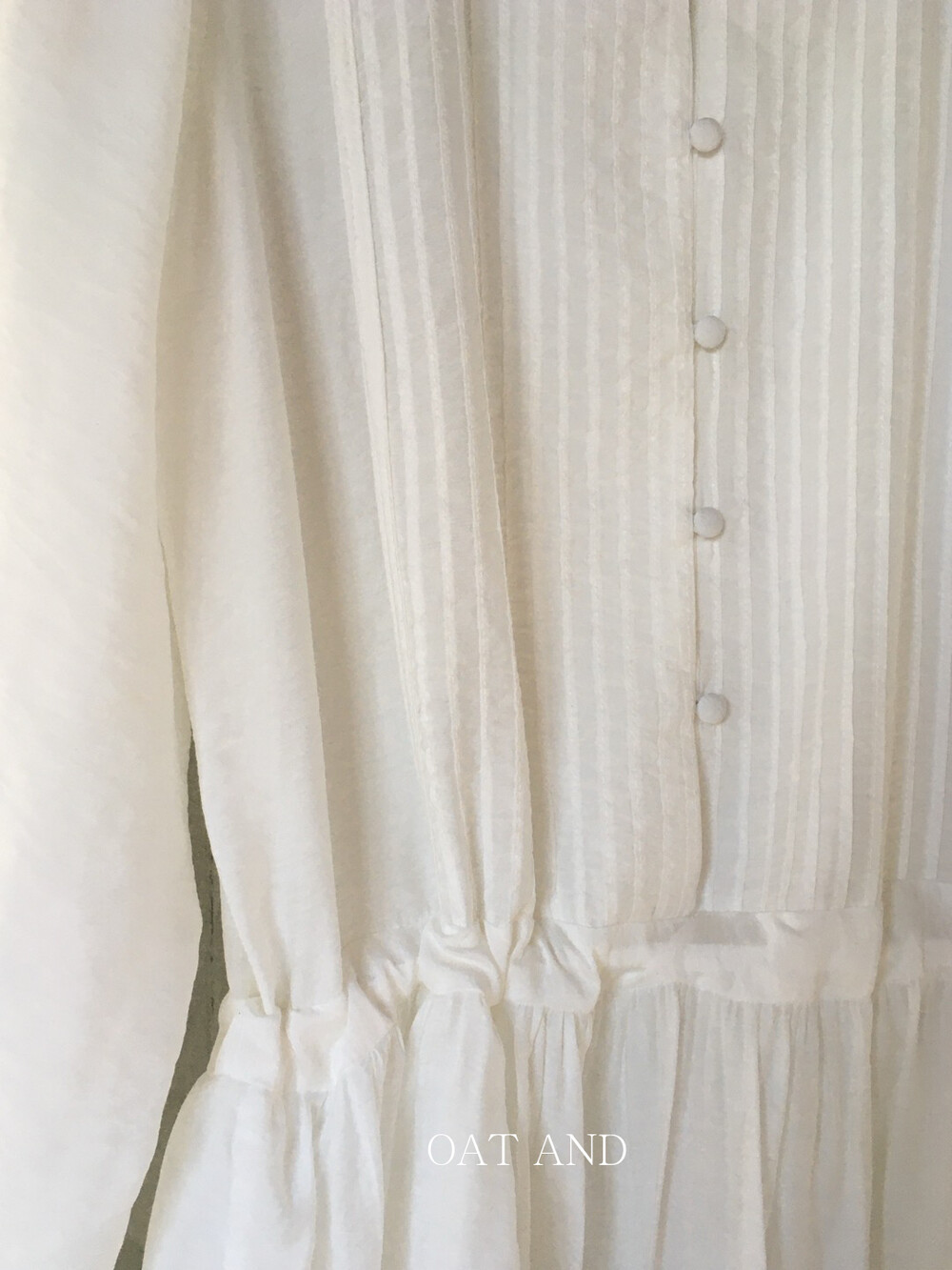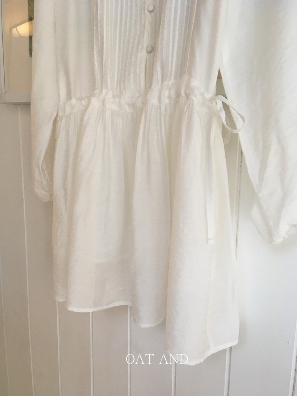 상의부분 전체로 들어간 핀턱디테일과 버튼 디테일이 포인트가 되며,