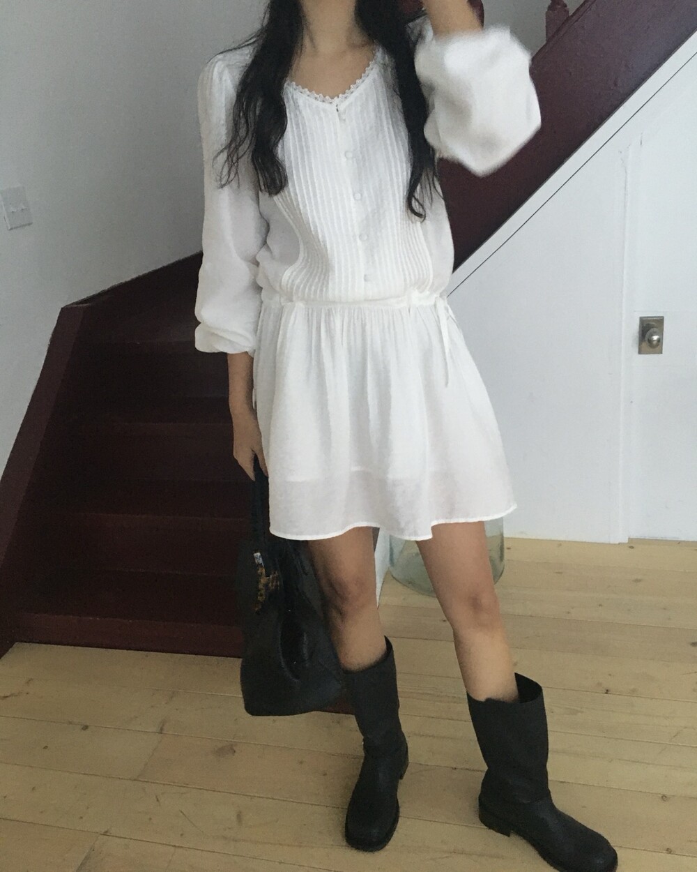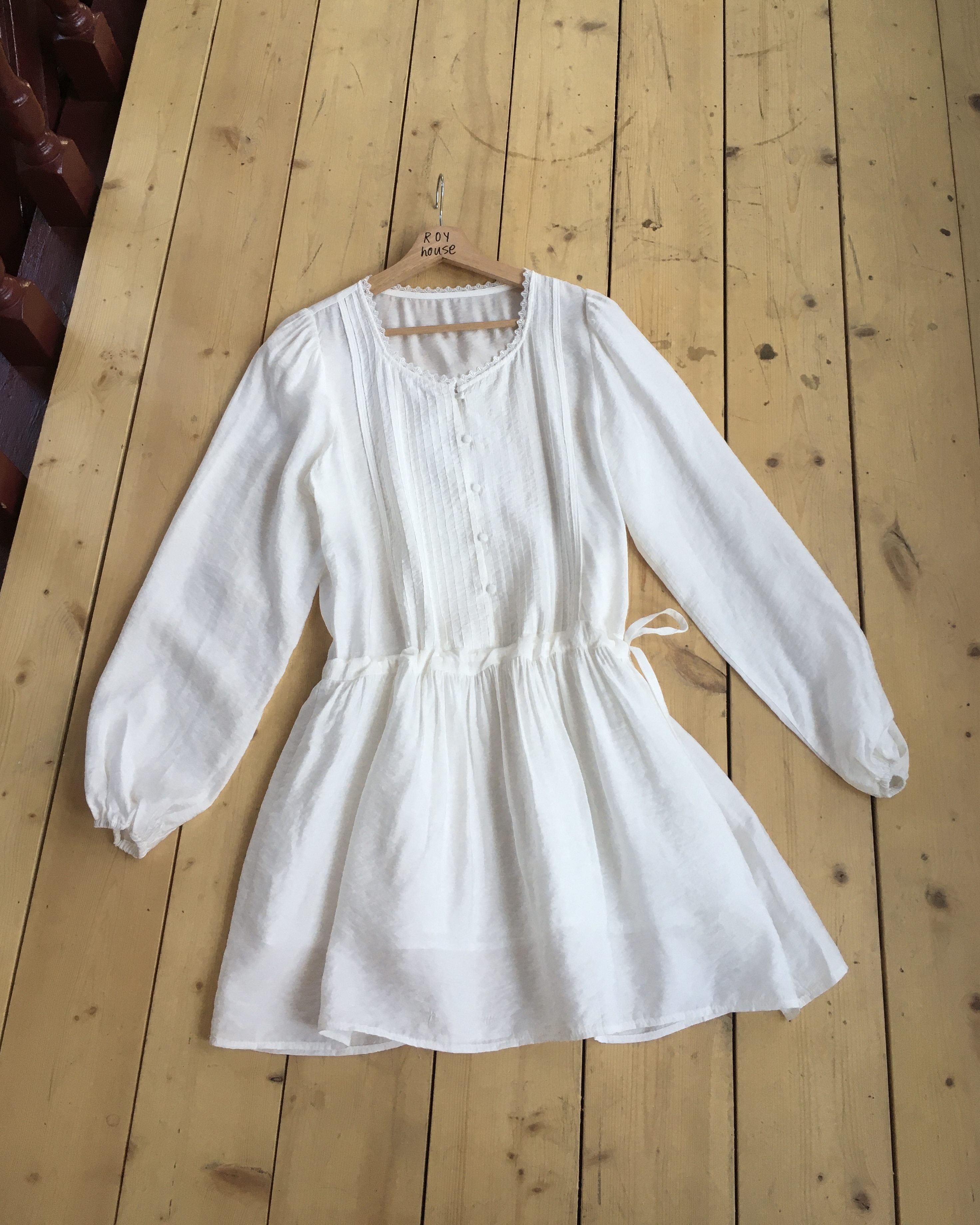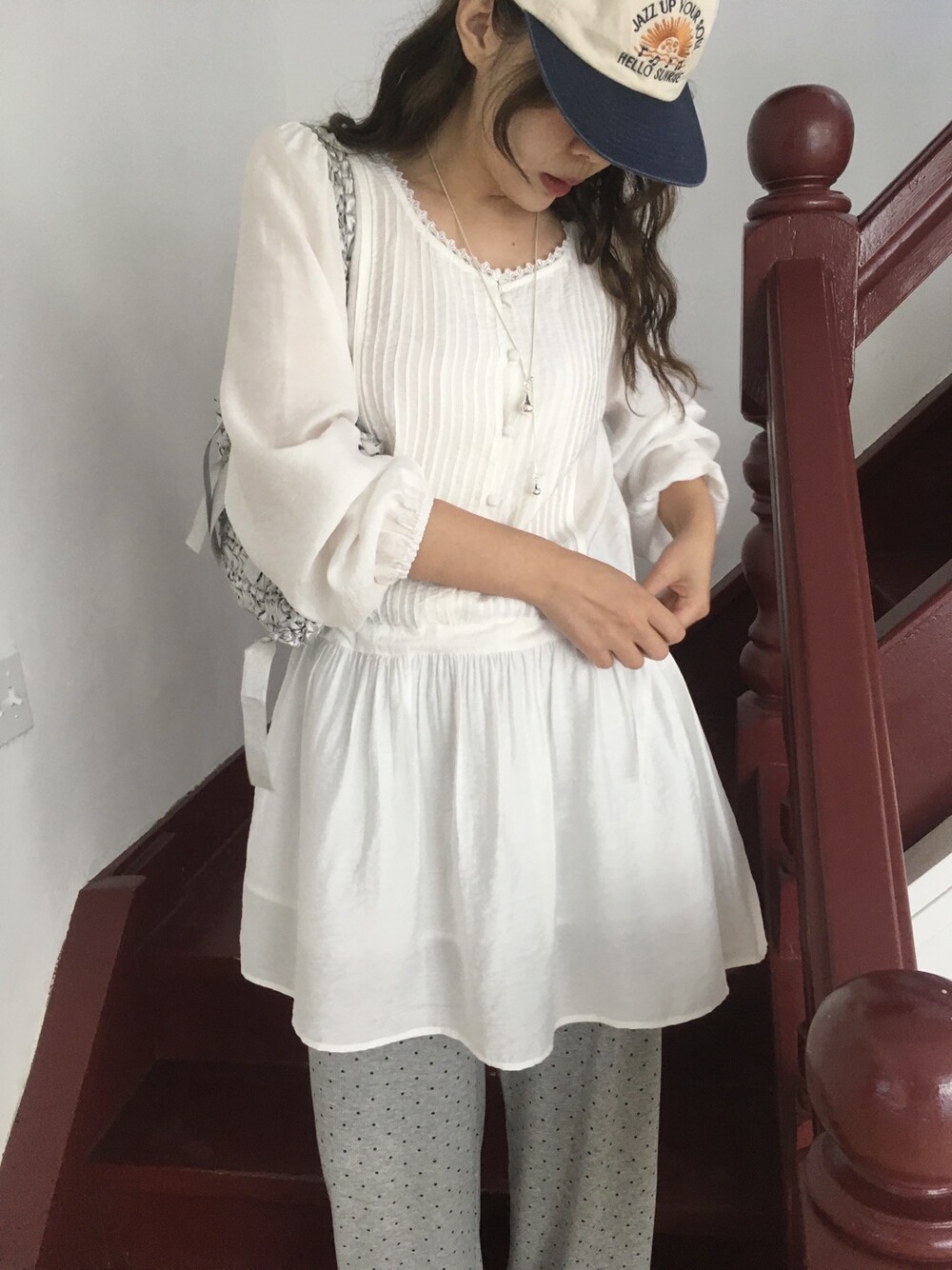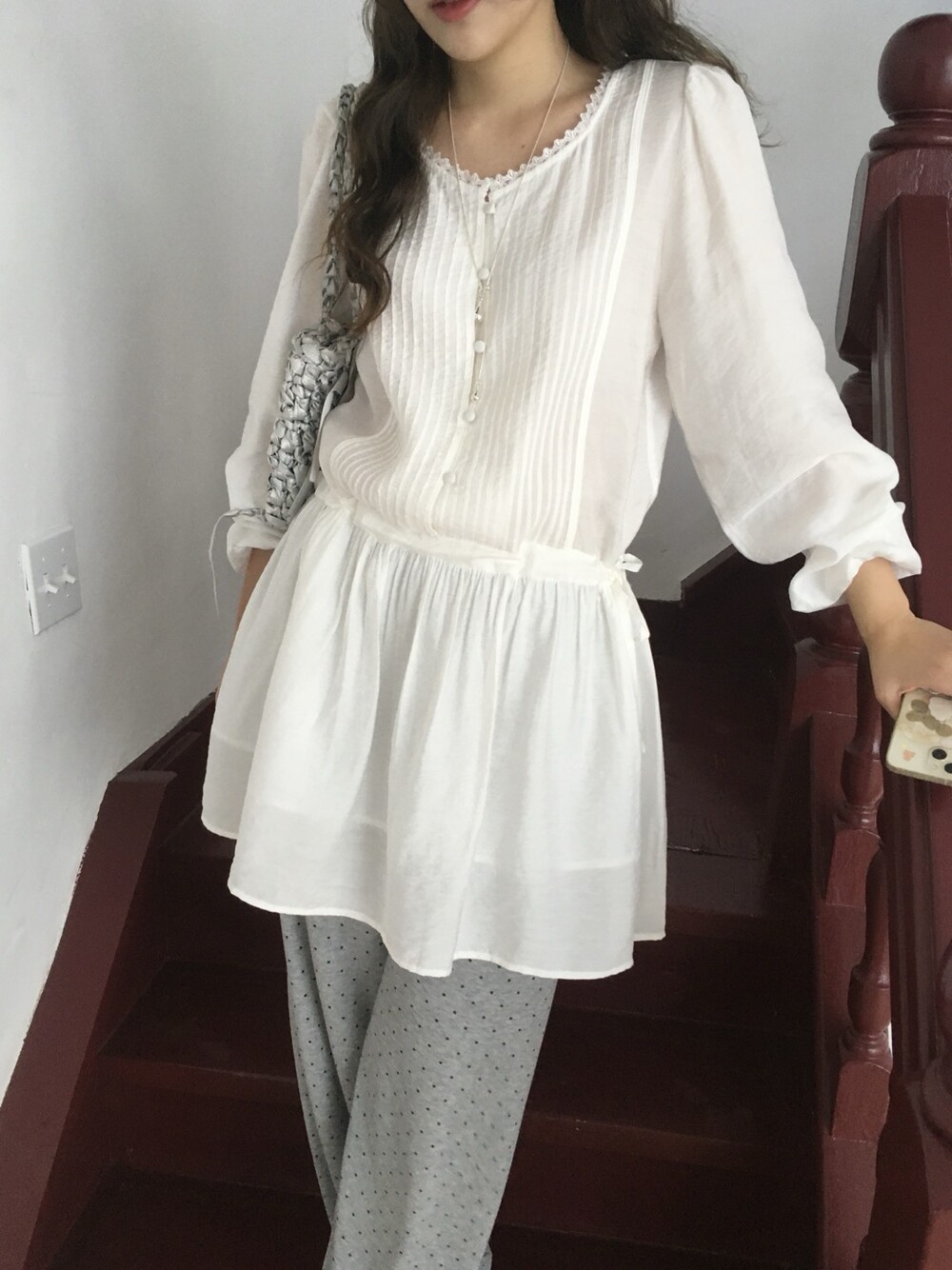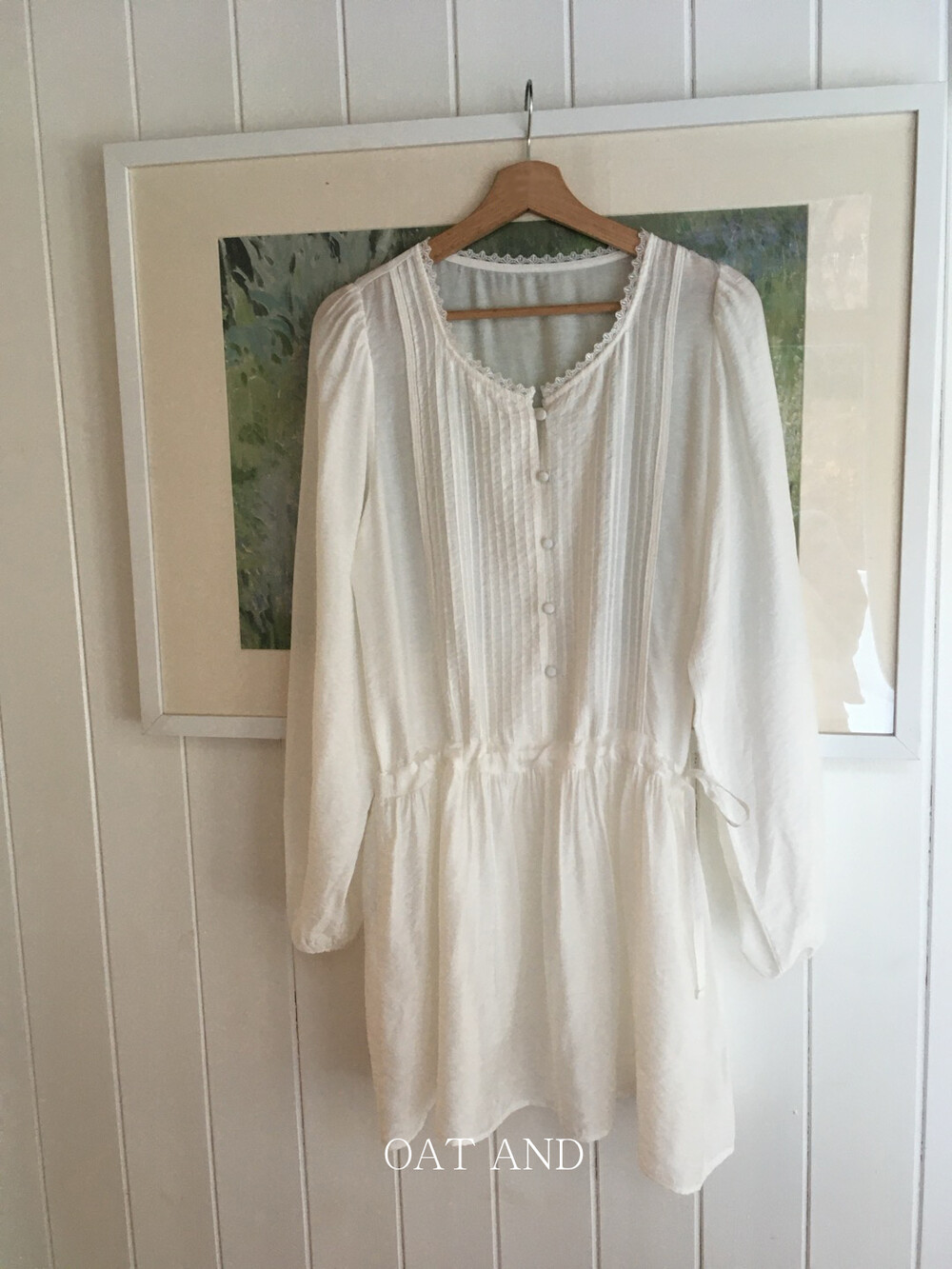 상의부분 전체로 들어간 핀턱디테일과 버튼 디테일이 포인트가 되며,
