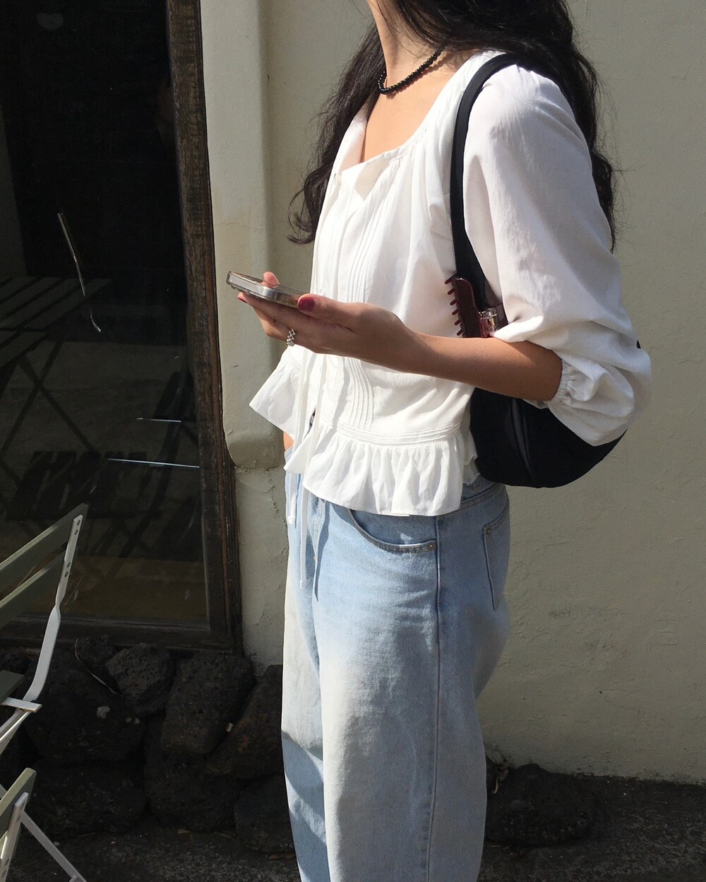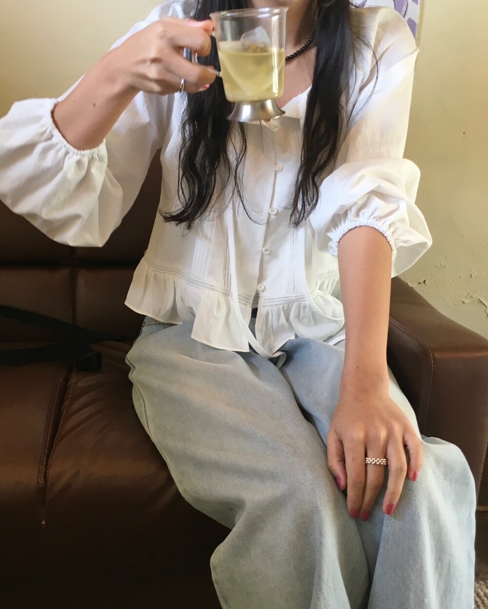 소매 끝은 밴딩 처리되어 자연스러운 볼륨감을 살려주고, 손목 라인을 여리하게 보여주는 효과가 있어요.