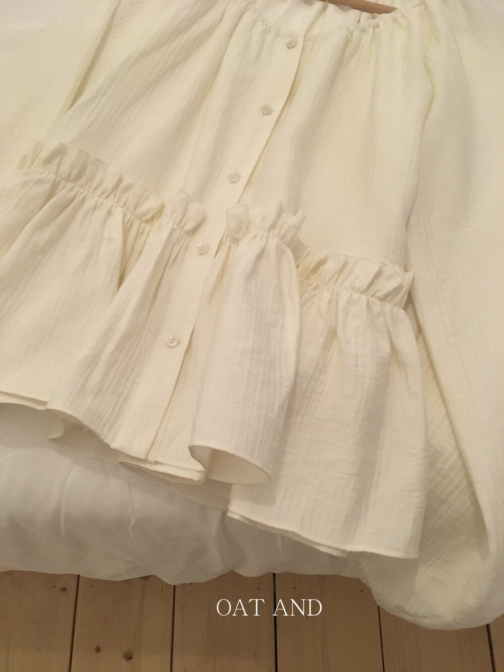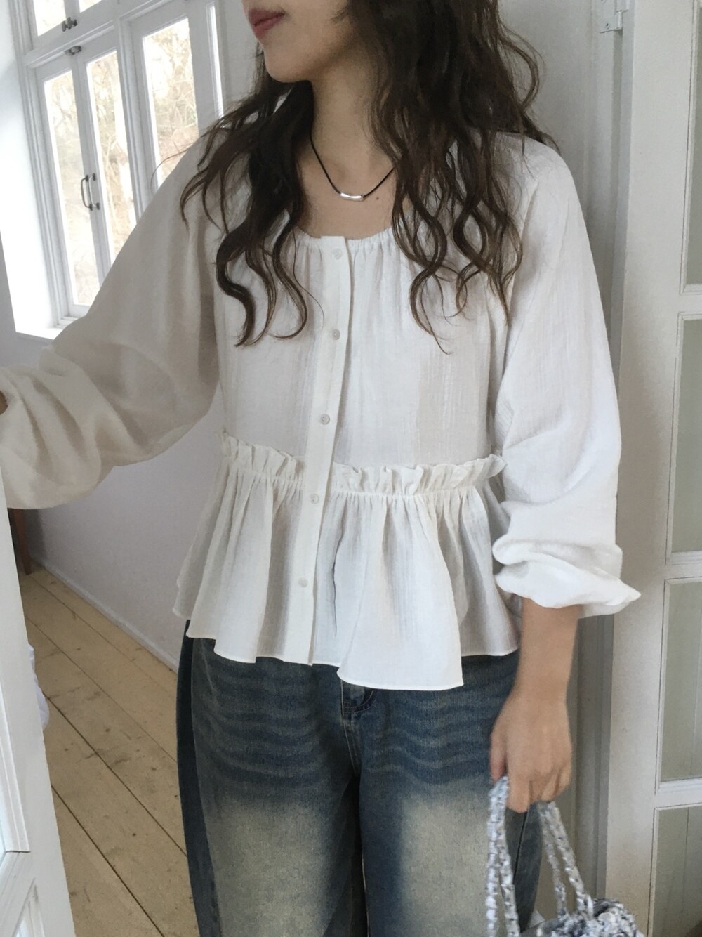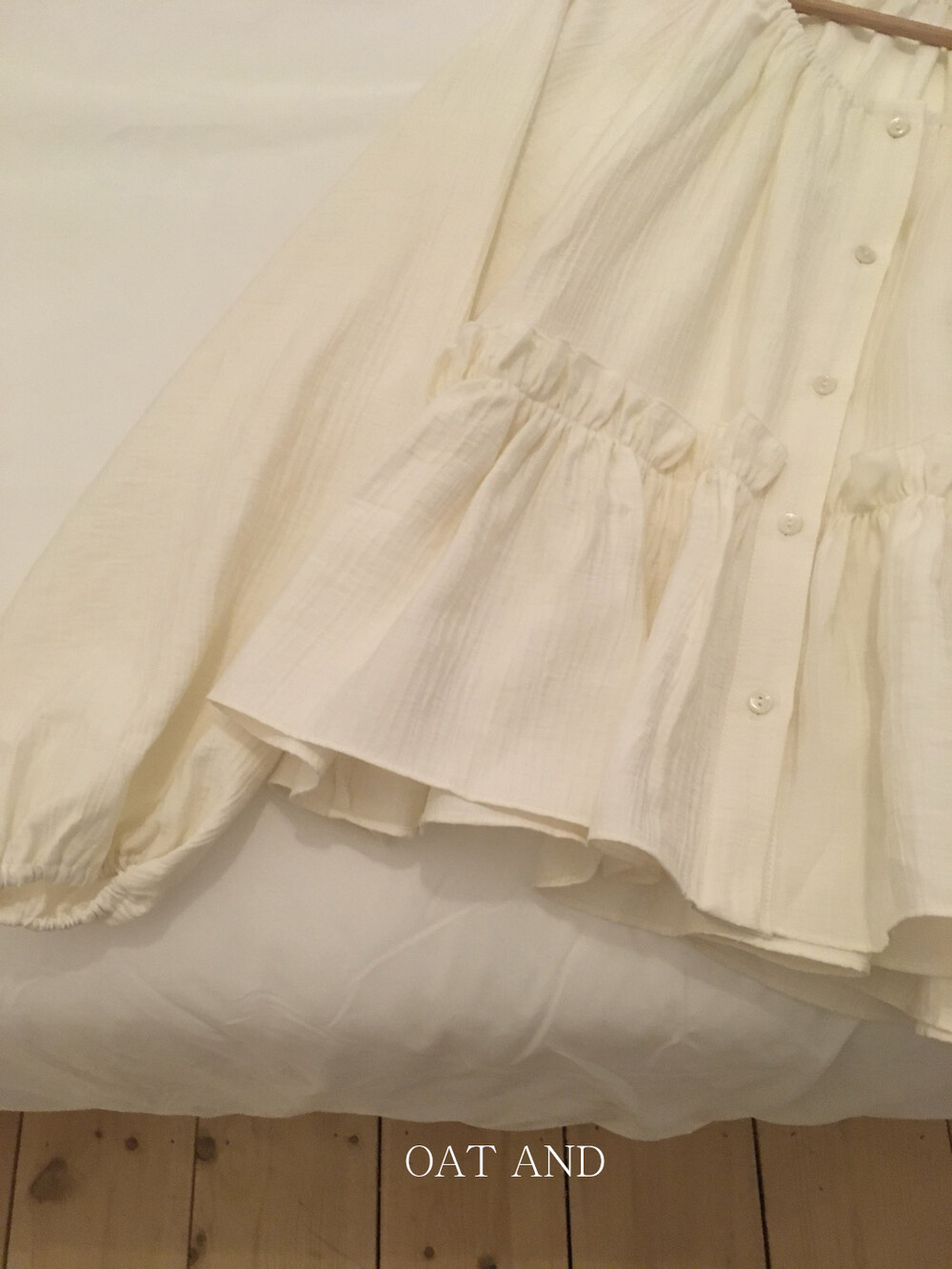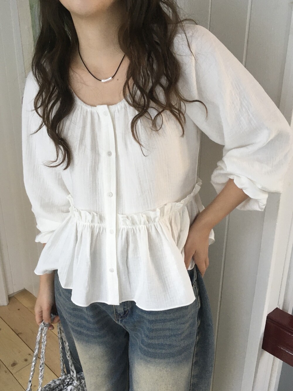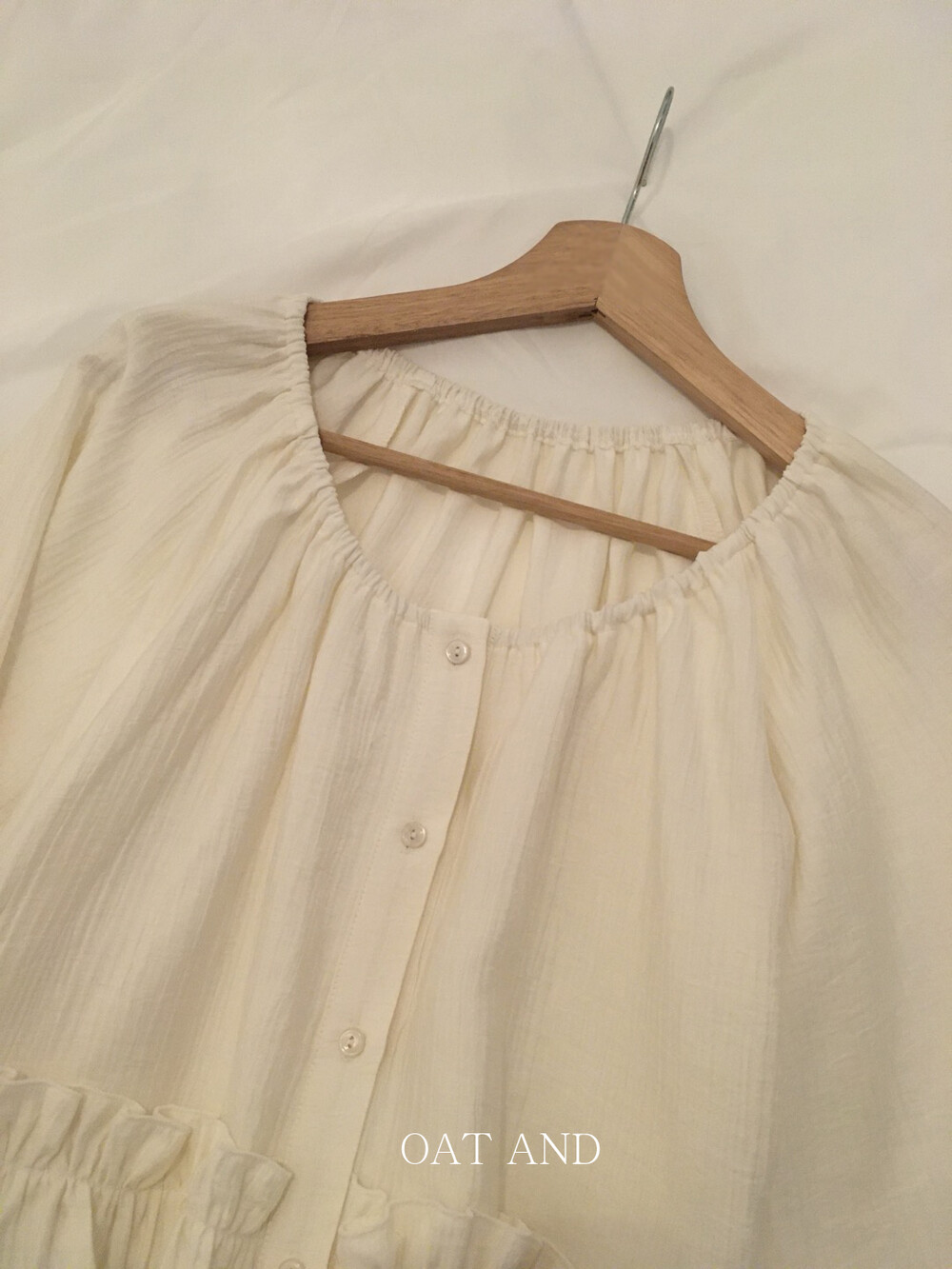 내추럴한 텍스쳐가 매력적이고, 허리라인에 잔잔한 셔링 디테일이 더해져 여성스러운 무드가 느껴집니다