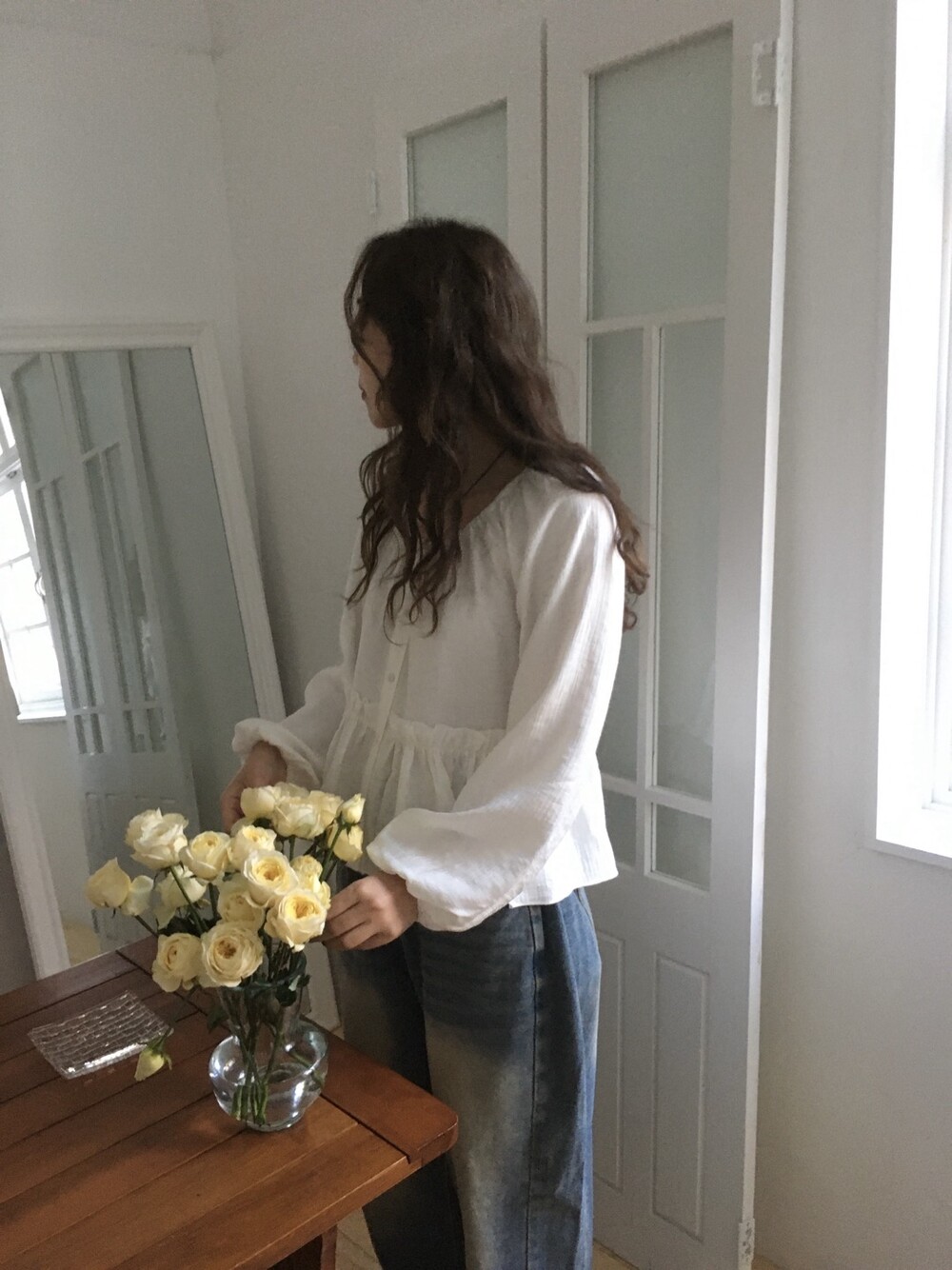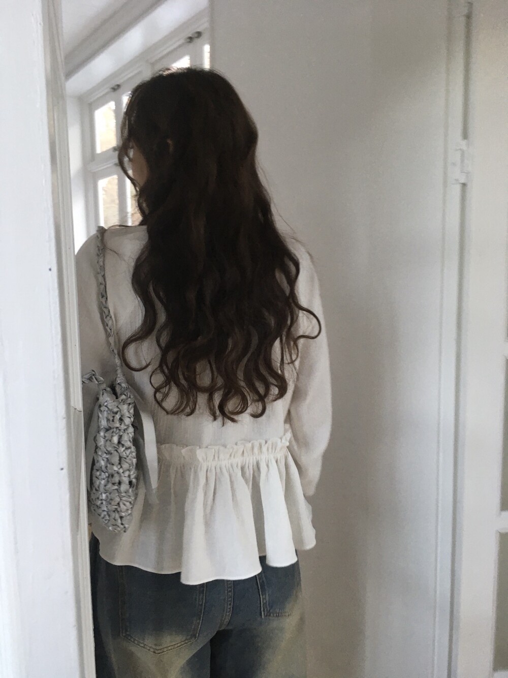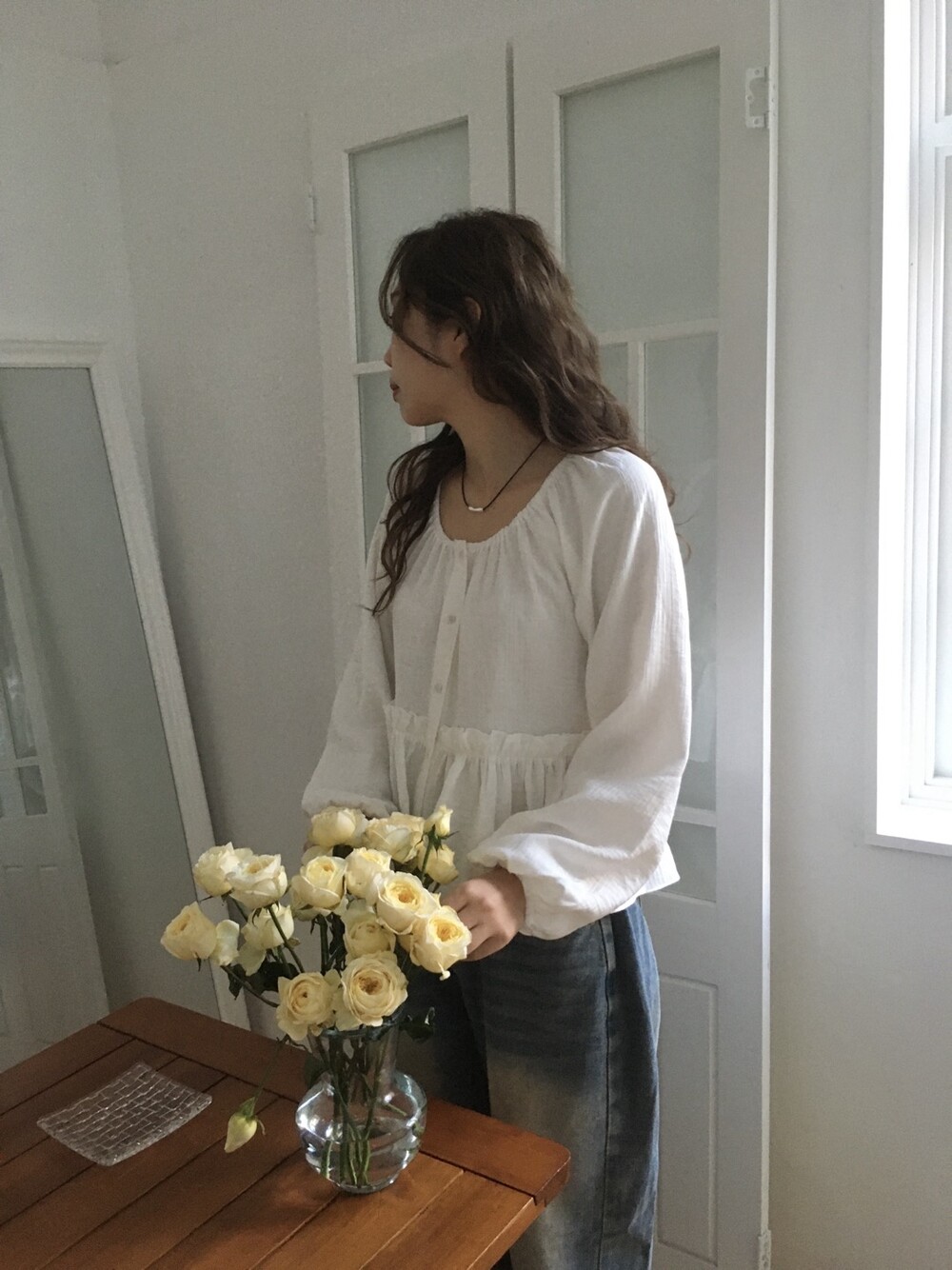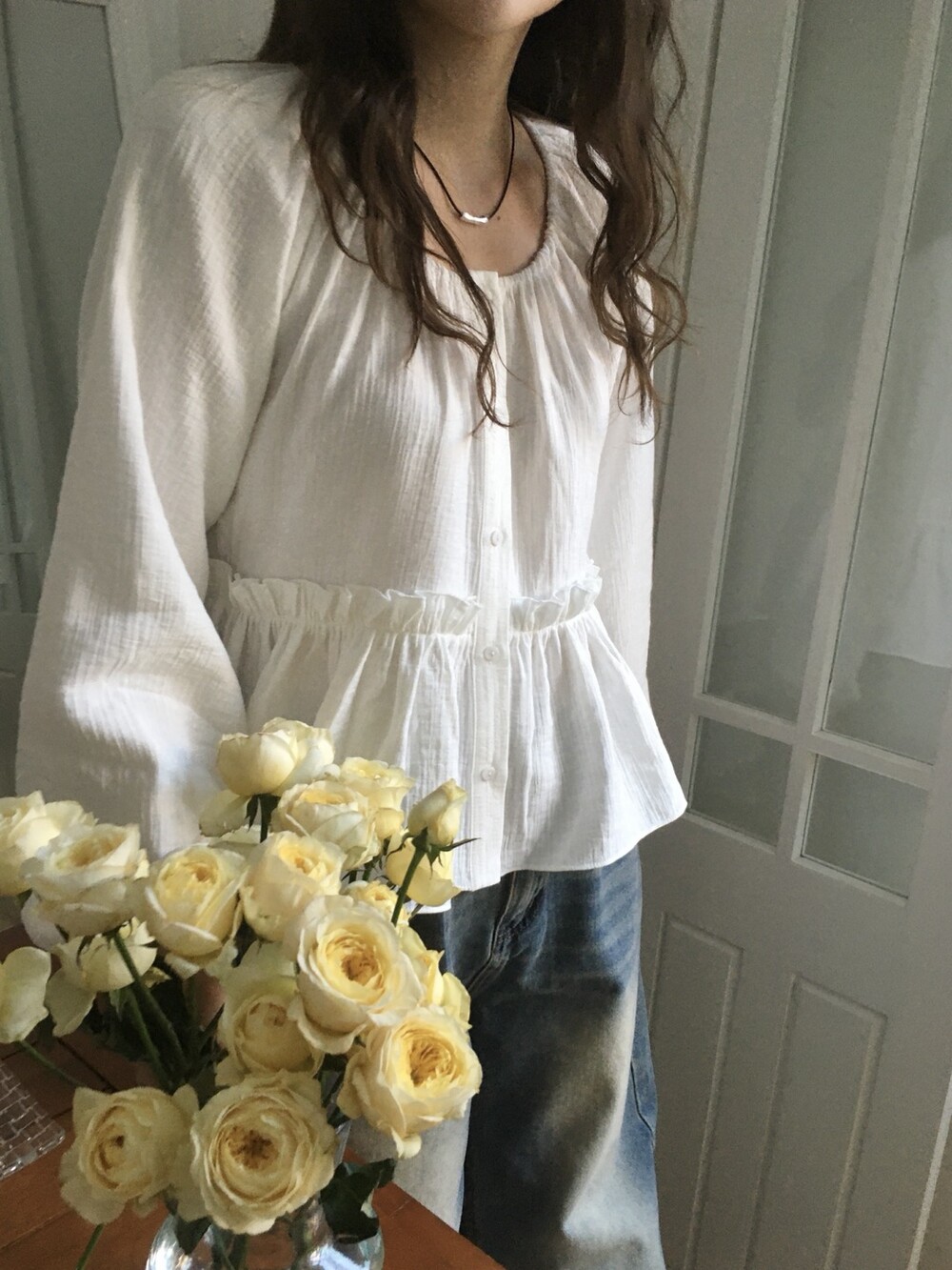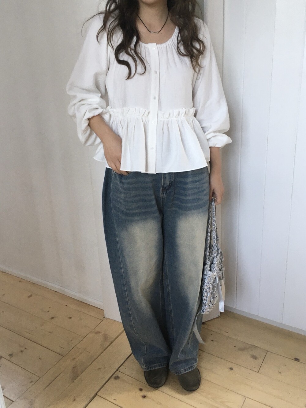 내추럴한 텍스쳐가 매력적이고, 허리라인에 잔잔한 셔링 디테일이 더해져 여성스러운 무드가 느껴집니다