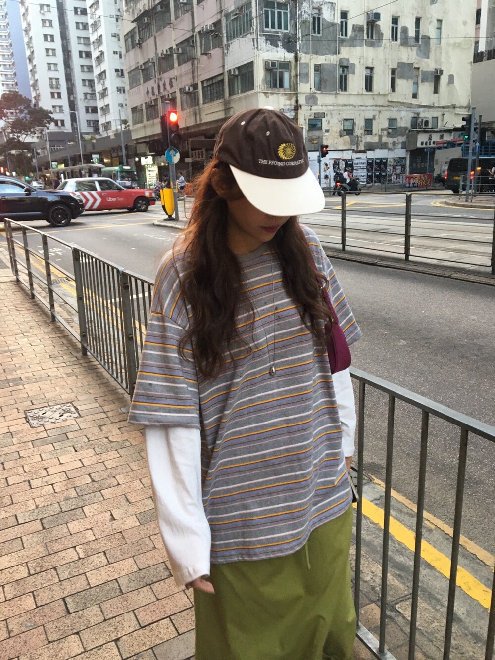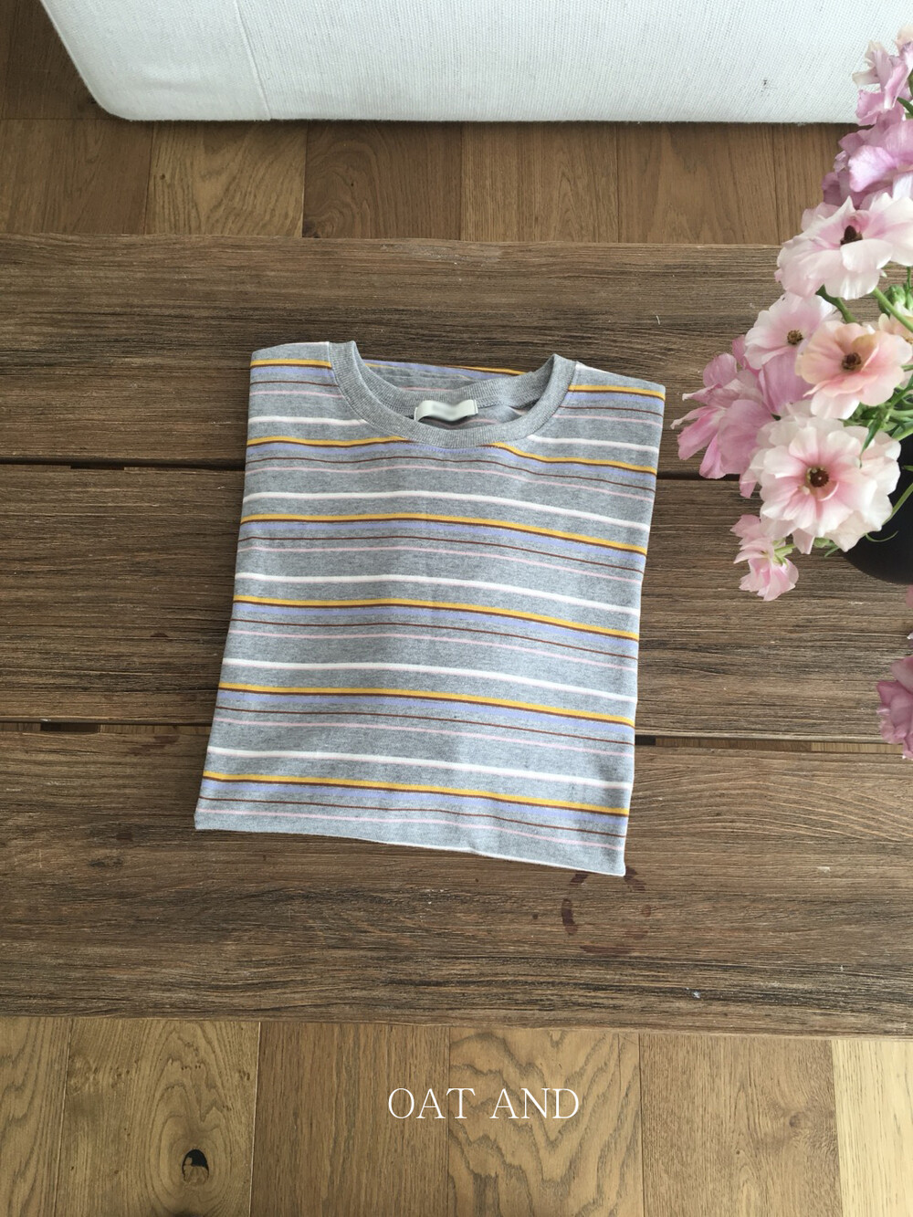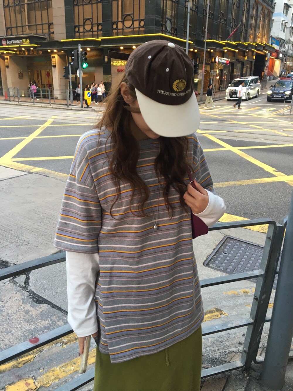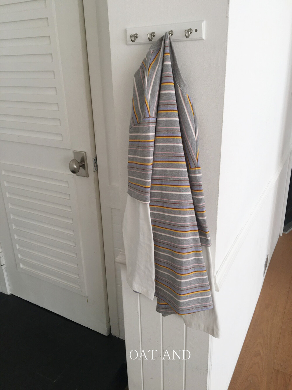그레이 베이스에 옐로우와 퍼플 컬러 배색이 믹스된 스트라이프 패턴으로, 흔하지 않은 빈티지하면서도 캐주얼한 무드를 선사하는 아이템이에요.