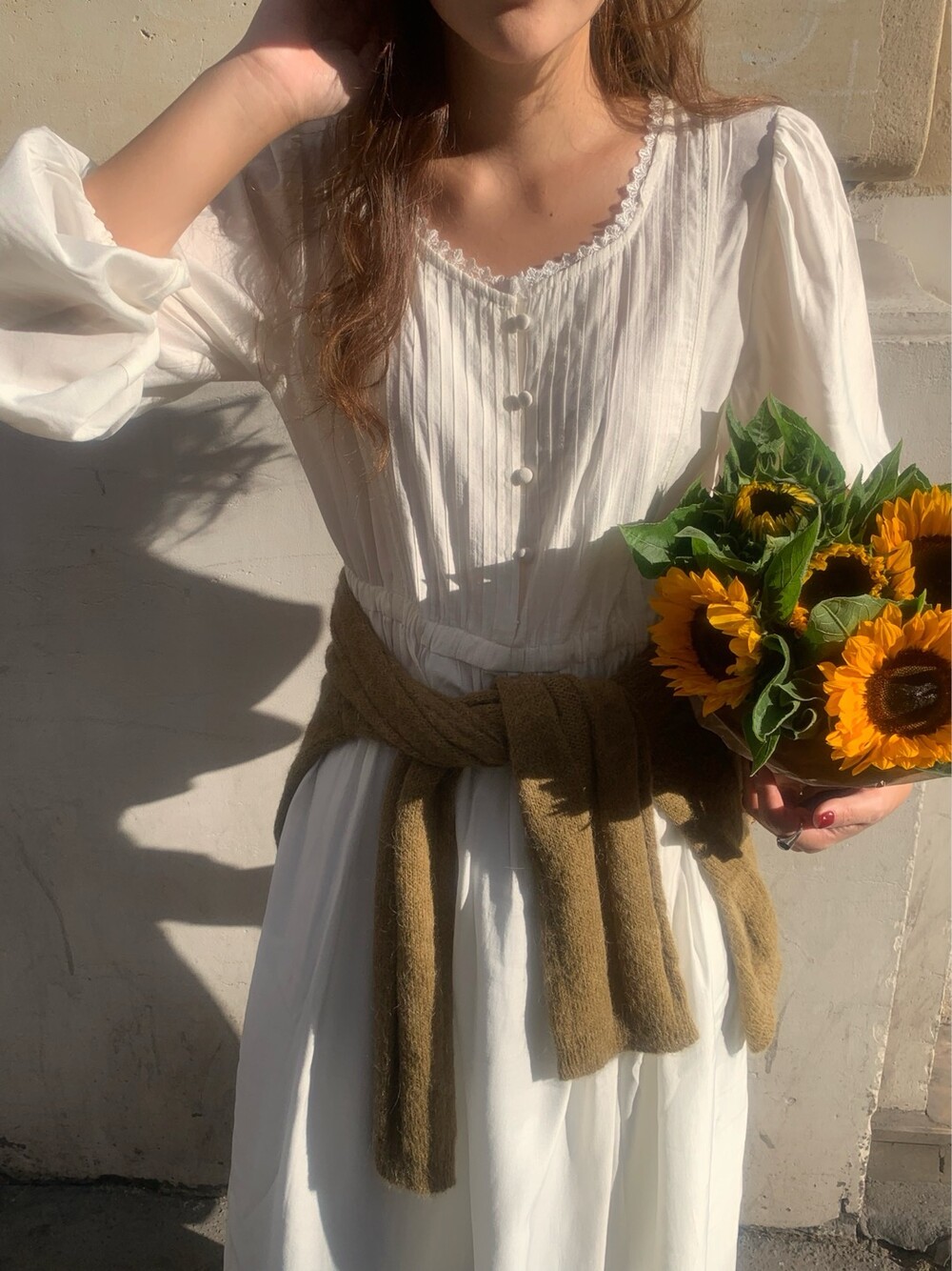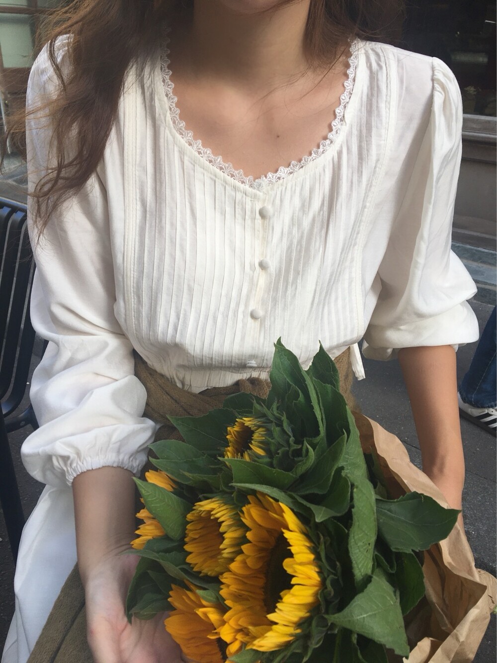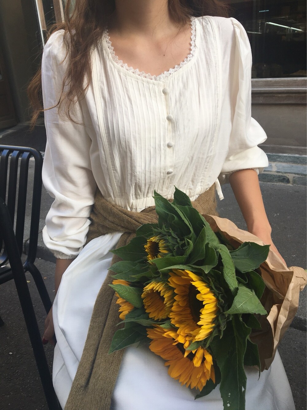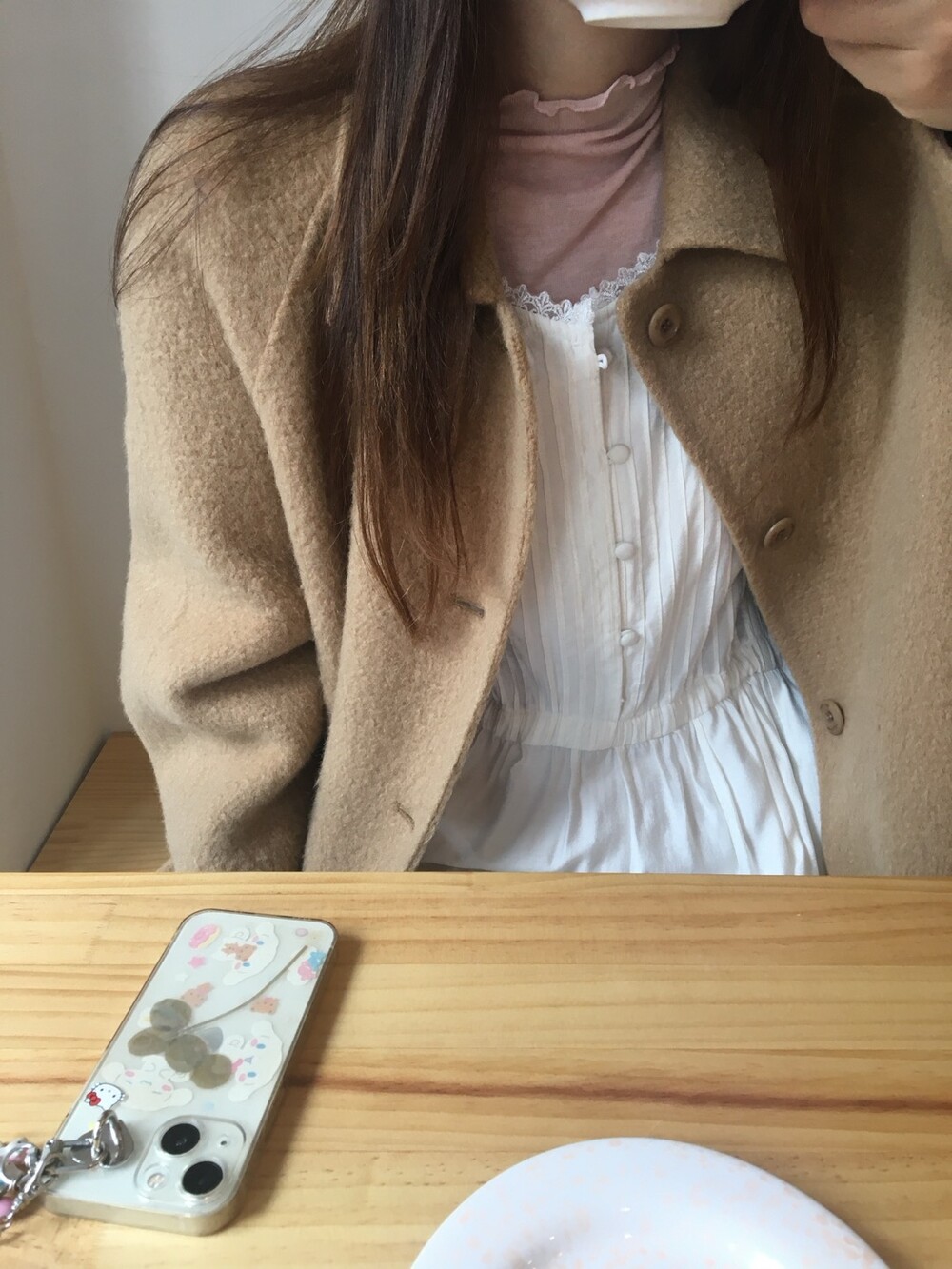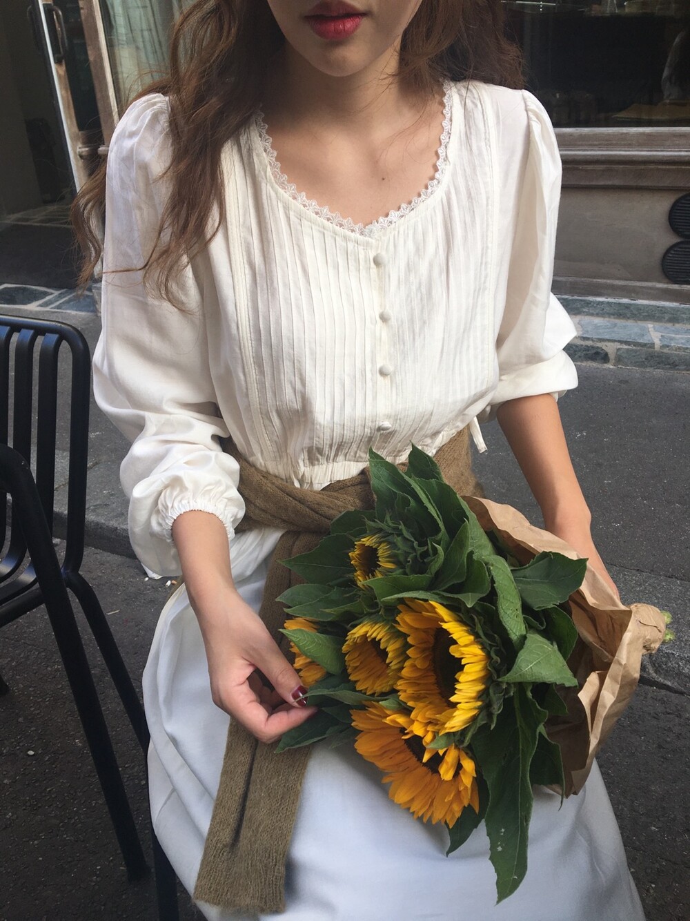 크리미한 아이보리 컬러로 따뜻해보이고, 하트넥라인으로 단독으로도 예쁘고 울폴라탑과 함께 하기에도 넥라인이 너무 예쁘답니다. 프론트 부분에 잘게 잡힌 핀턱 주름과, 싸개 단추 버튼으로 깔끔하게 처리했어요.