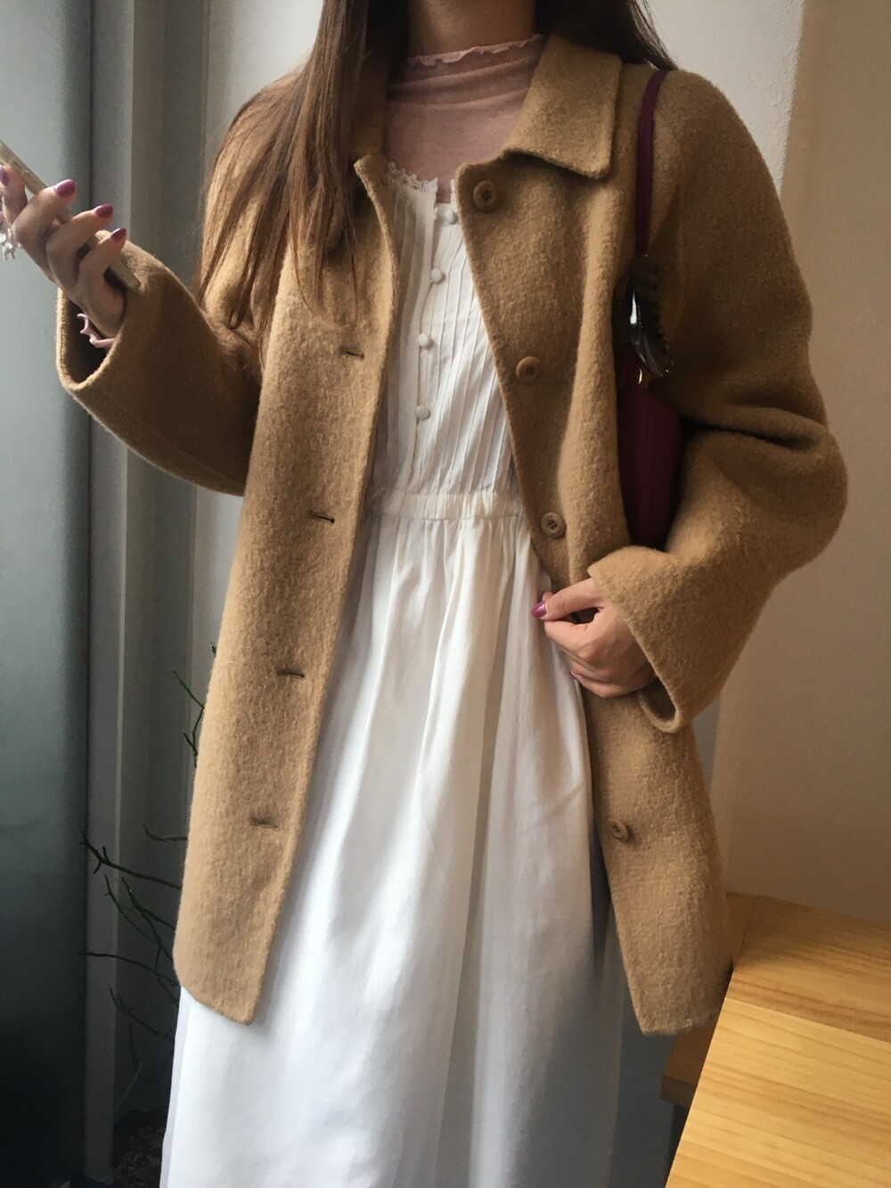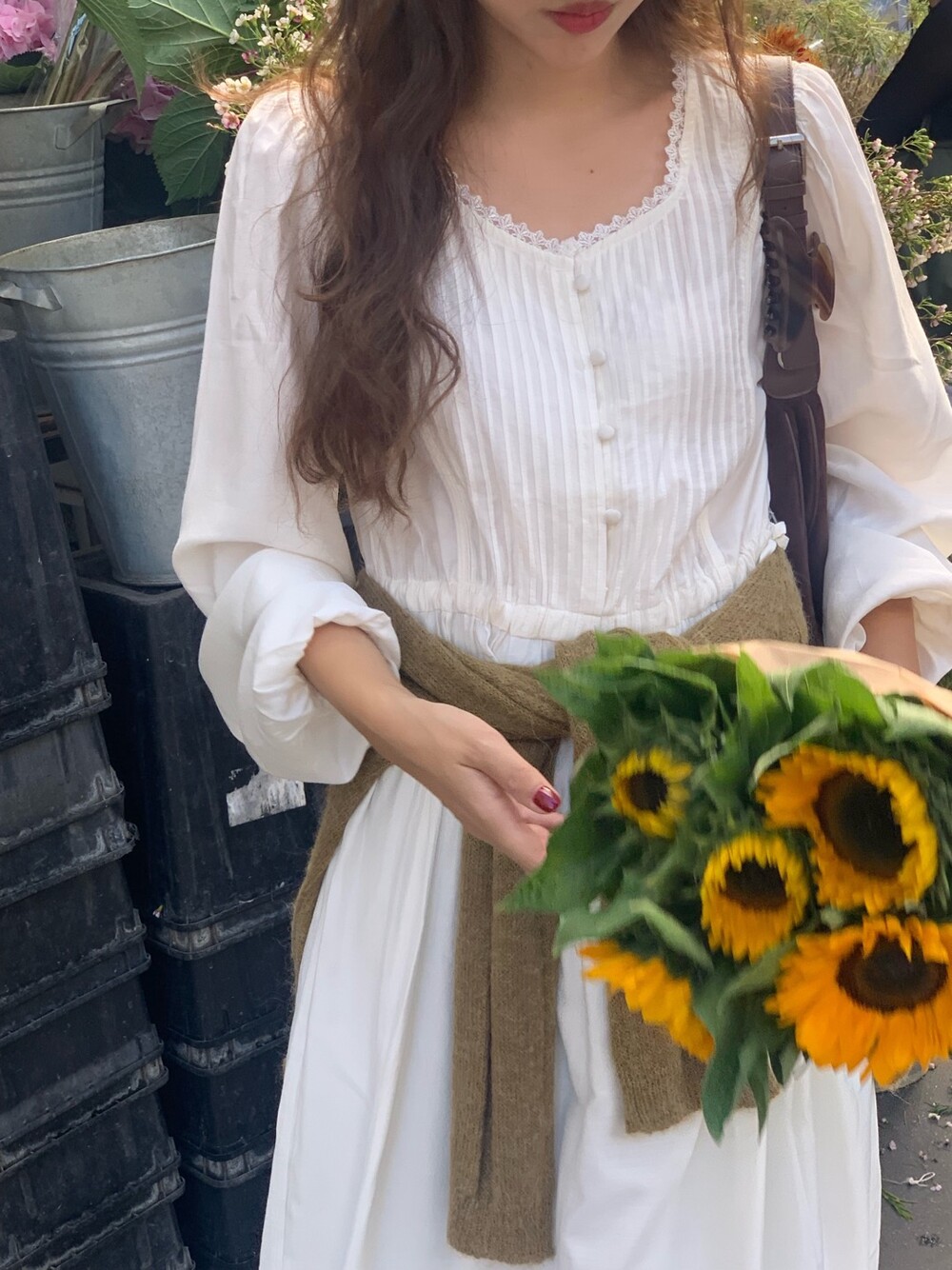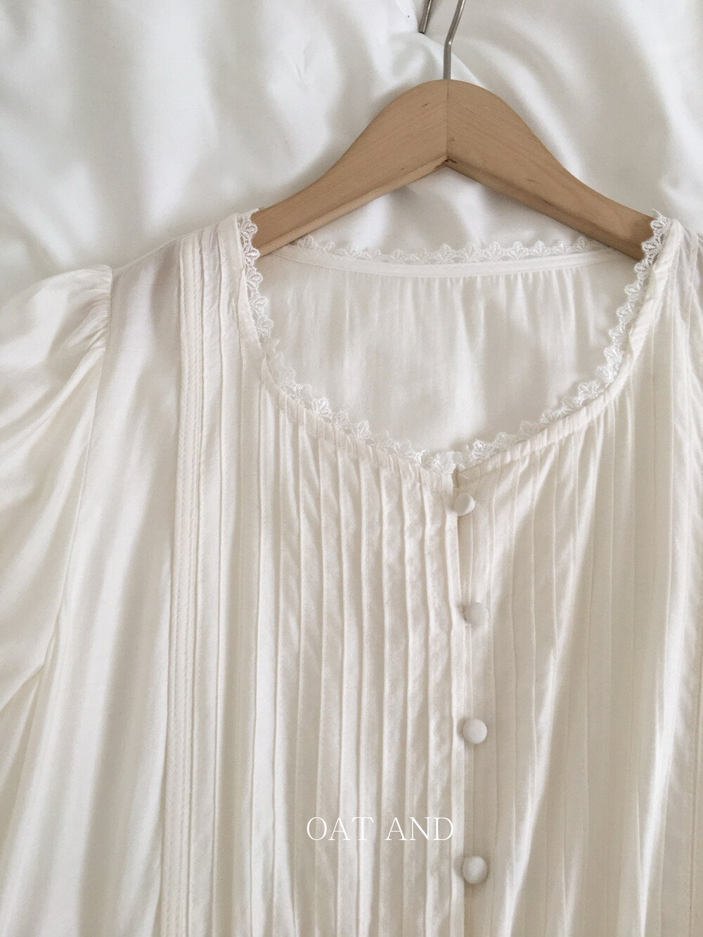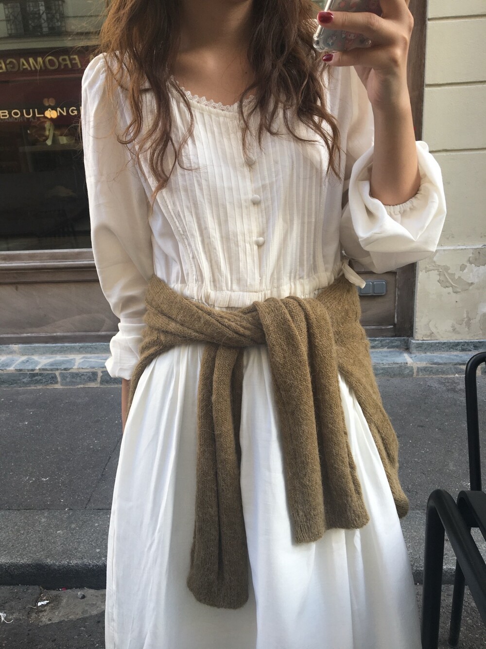 크리미한 아이보리 컬러로 따뜻해보이고, 하트넥라인으로 단독으로도 예쁘고 울폴라탑과 함께 하기에도 넥라인이 너무 예쁘답니다. 프론트 부분에 잘게 잡힌 핀턱 주름과, 싸개 단추 버튼으로 깔끔하게 처리했어요.
