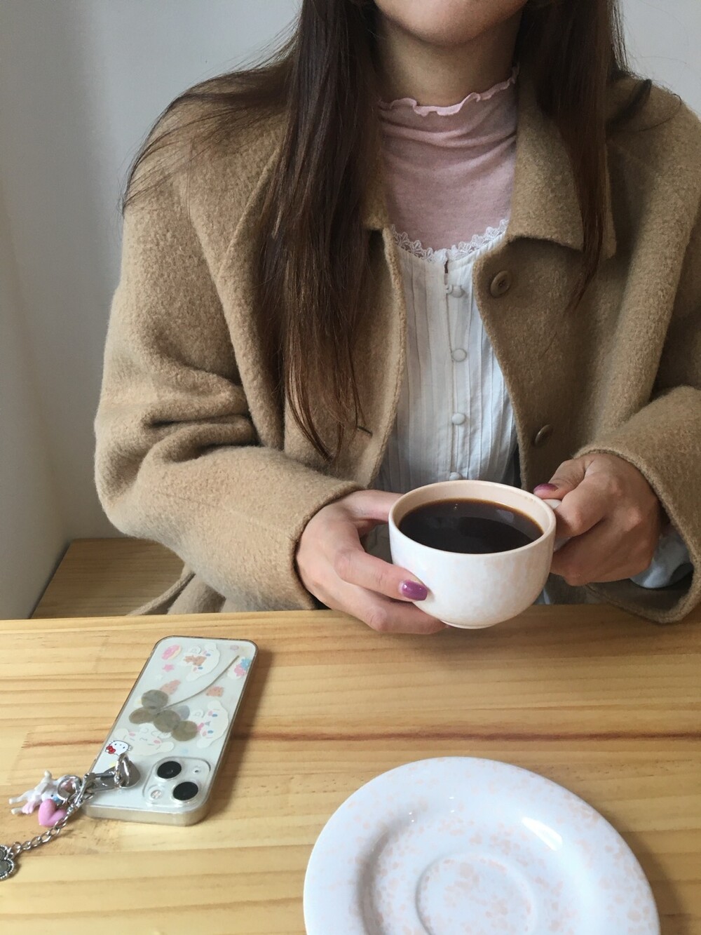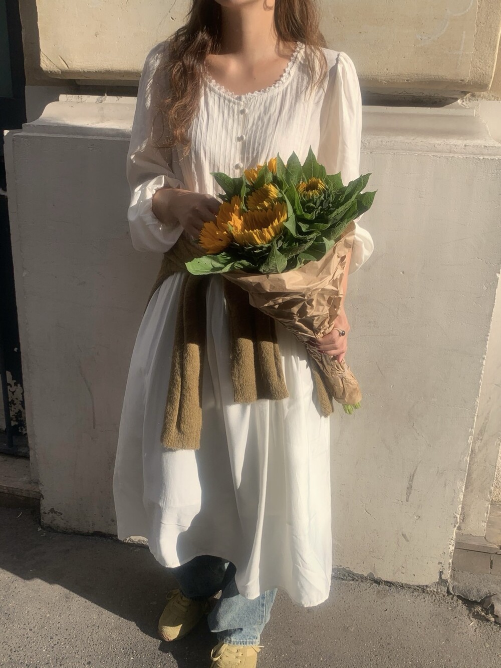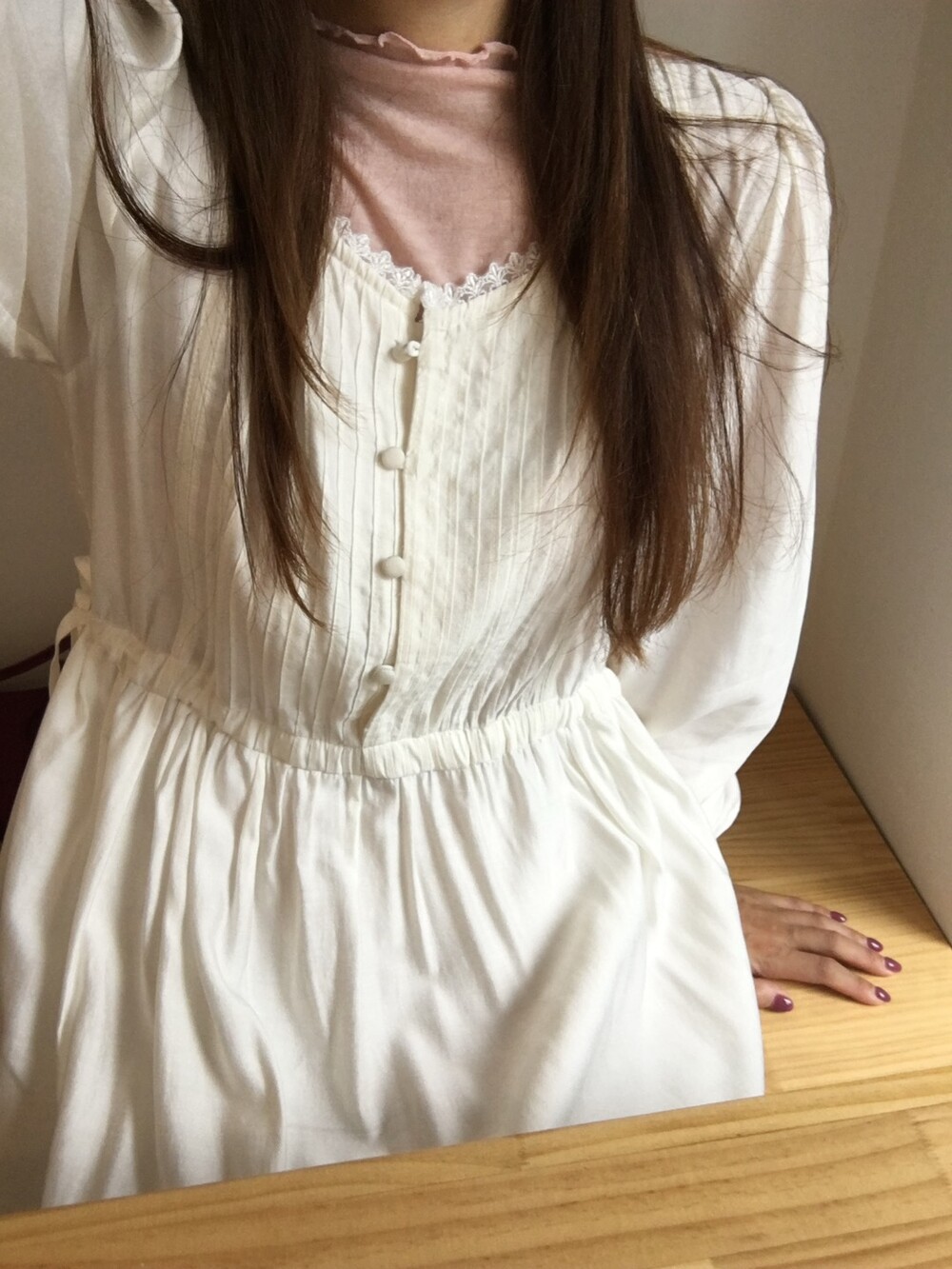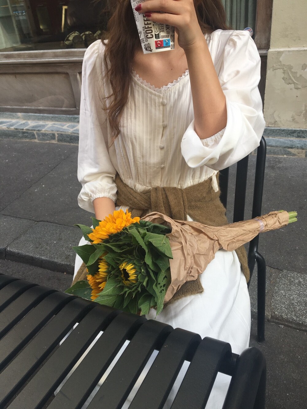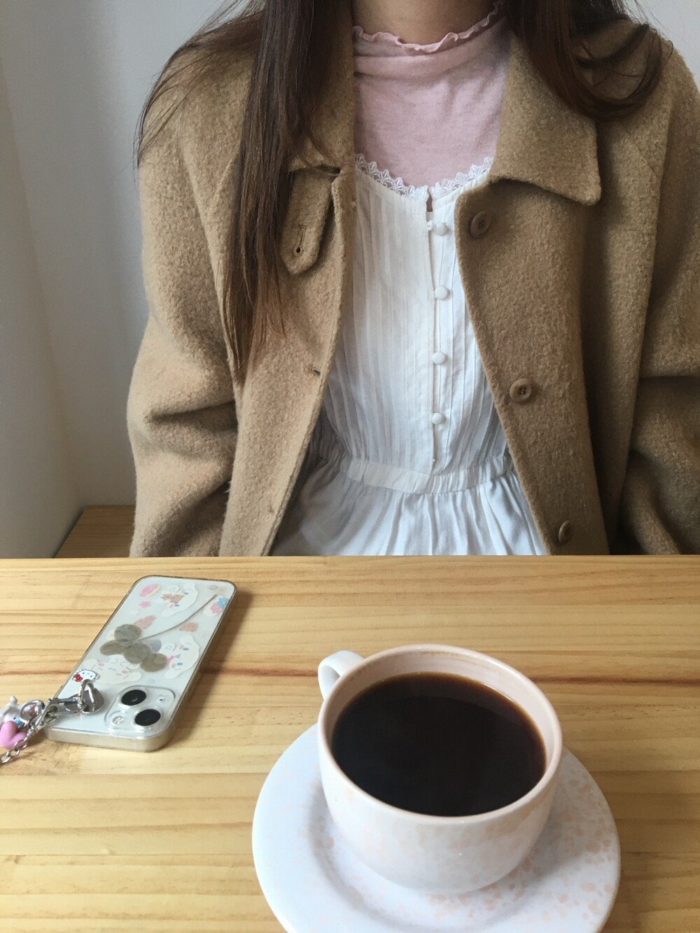 크리미한 아이보리 컬러로 따뜻해보이고, 하트넥라인으로 단독으로도 예쁘고 울폴라탑과 함께 하기에도 넥라인이 너무 예쁘답니다. 프론트 부분에 잘게 잡힌 핀턱 주름과, 싸개 단추 버튼으로 깔끔하게 처리했어요.