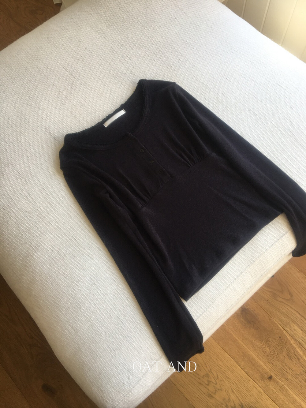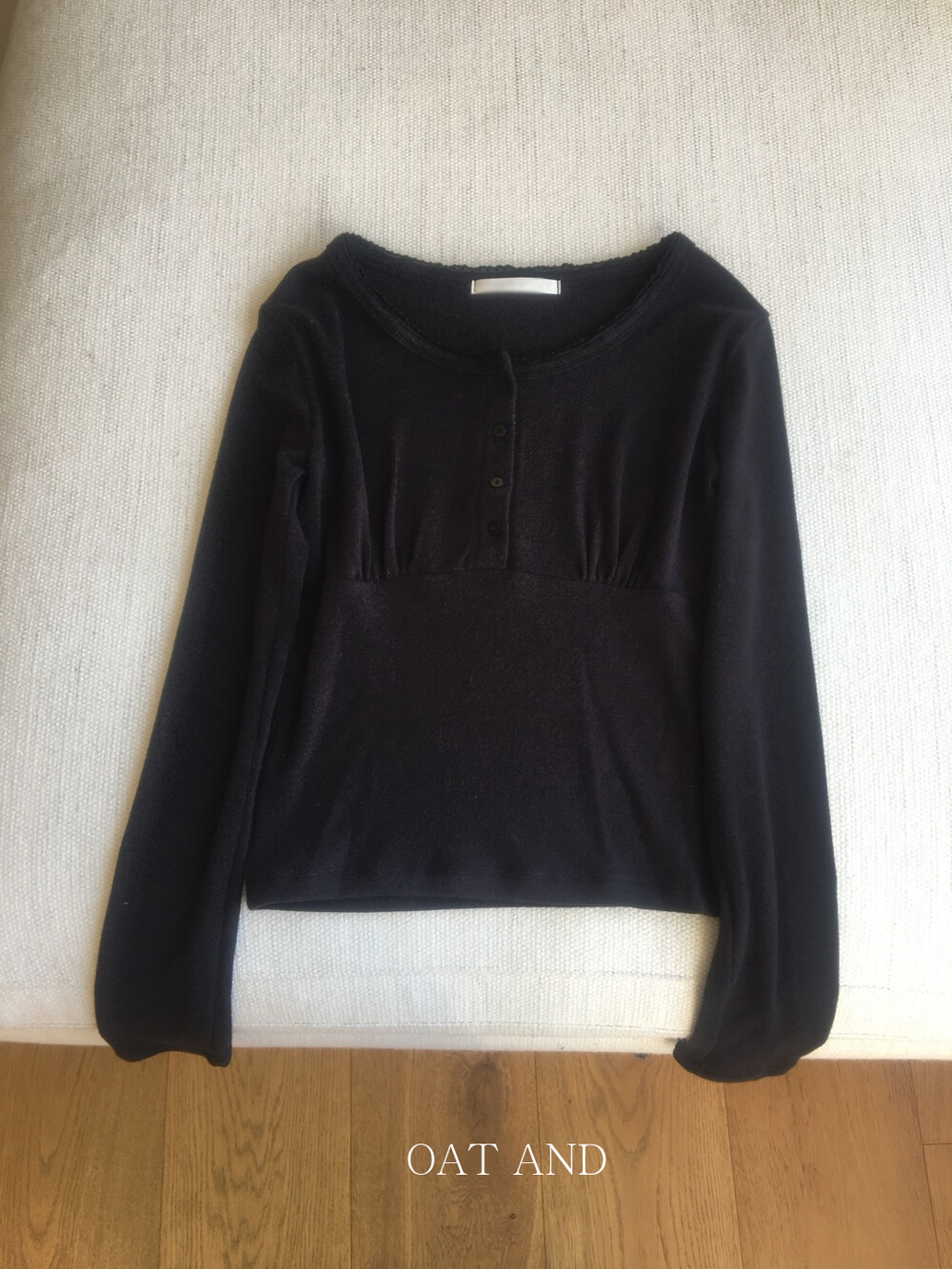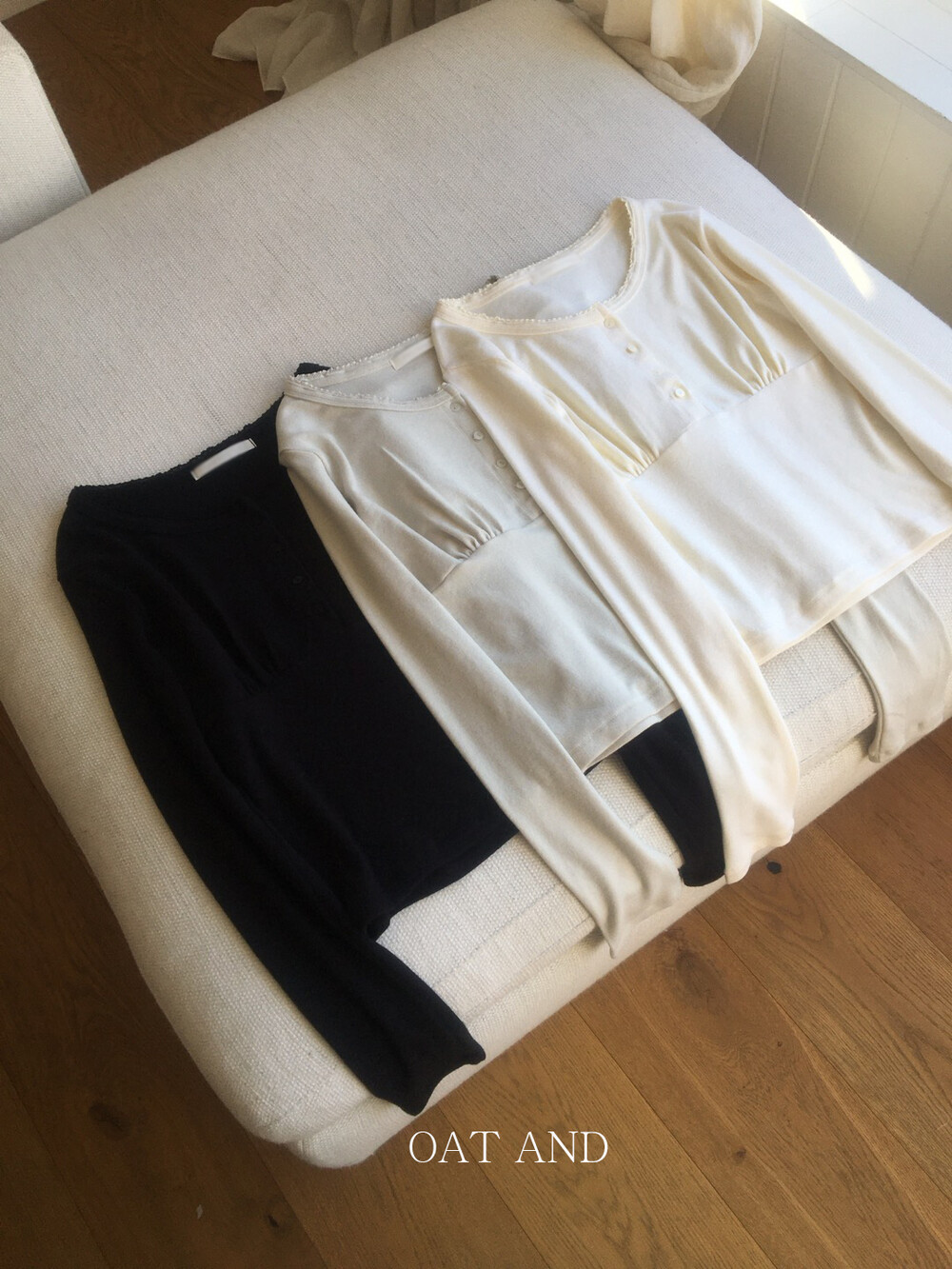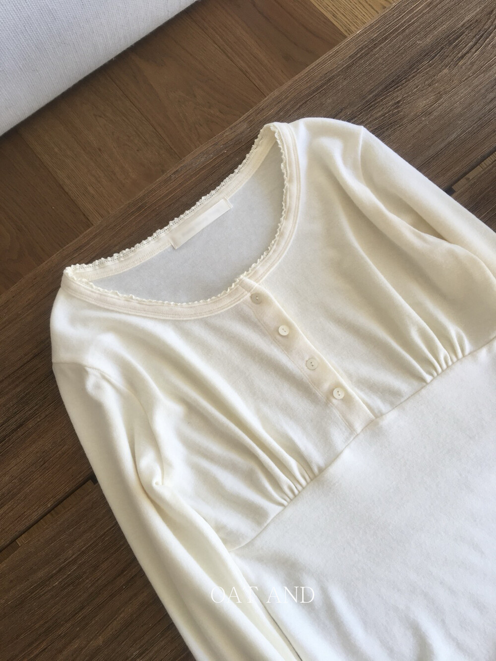 넓은 라운드 넥 라인이 쇄골을 자연스럽게 드러내 답답함 없이 여성스러운 분위기를 연출해주고,