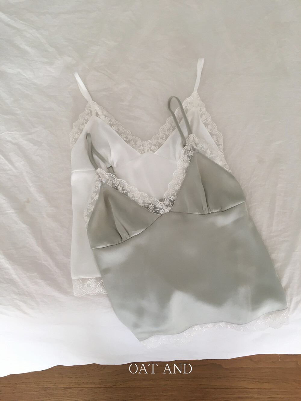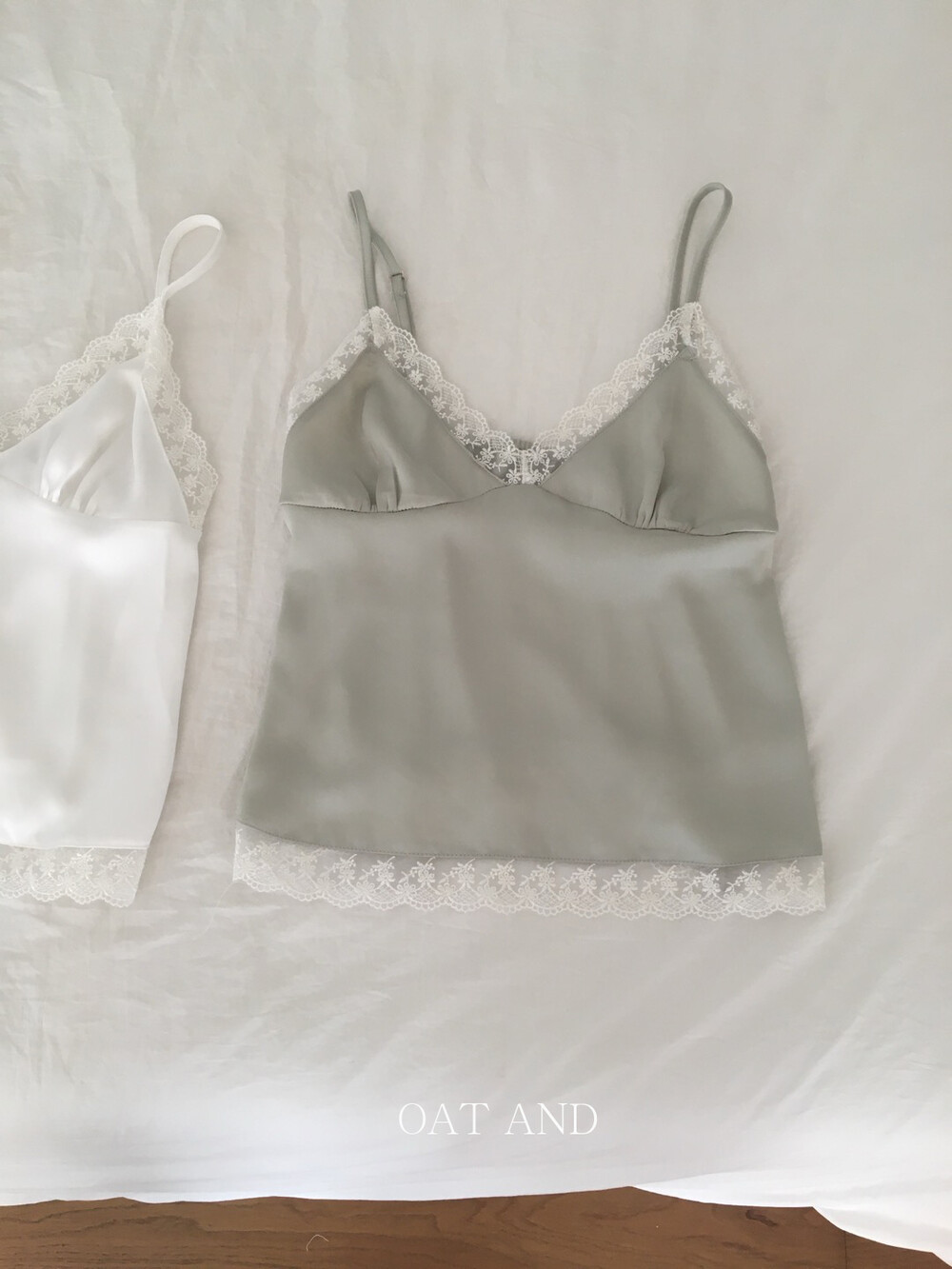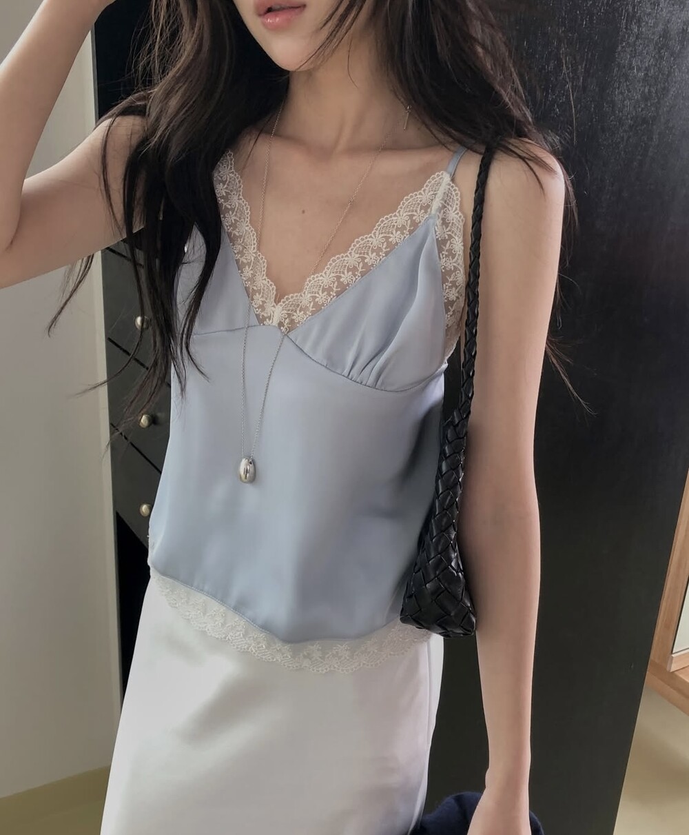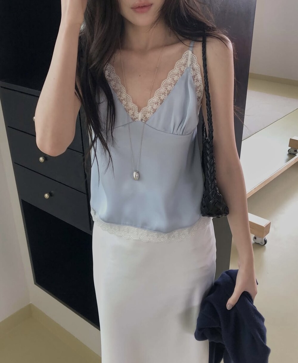 은은한 광택감이 느껴지는 실키한 소재와 정교한 레이스가 조화를 이루어 청순하면서도 빈티지한 무드를 자아내는 뷔스티에입니다. 넥라인과 밑단을 따라 흐르는 레이스 디테일이 확실한 포인트가 되어줍니다.