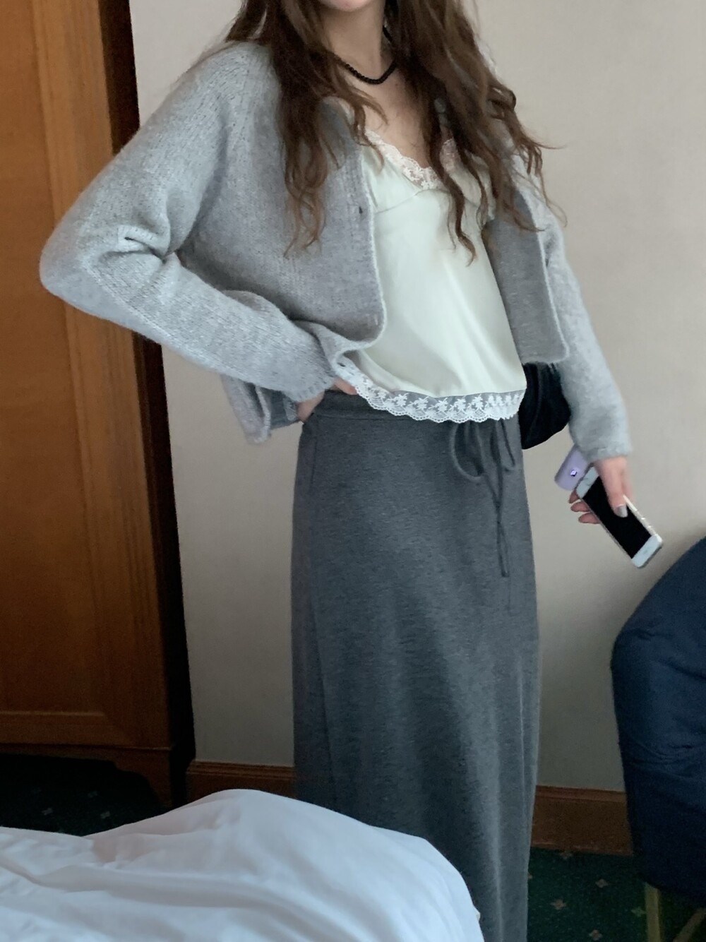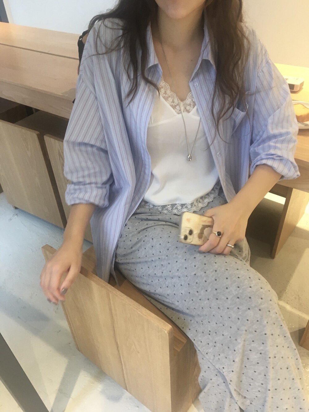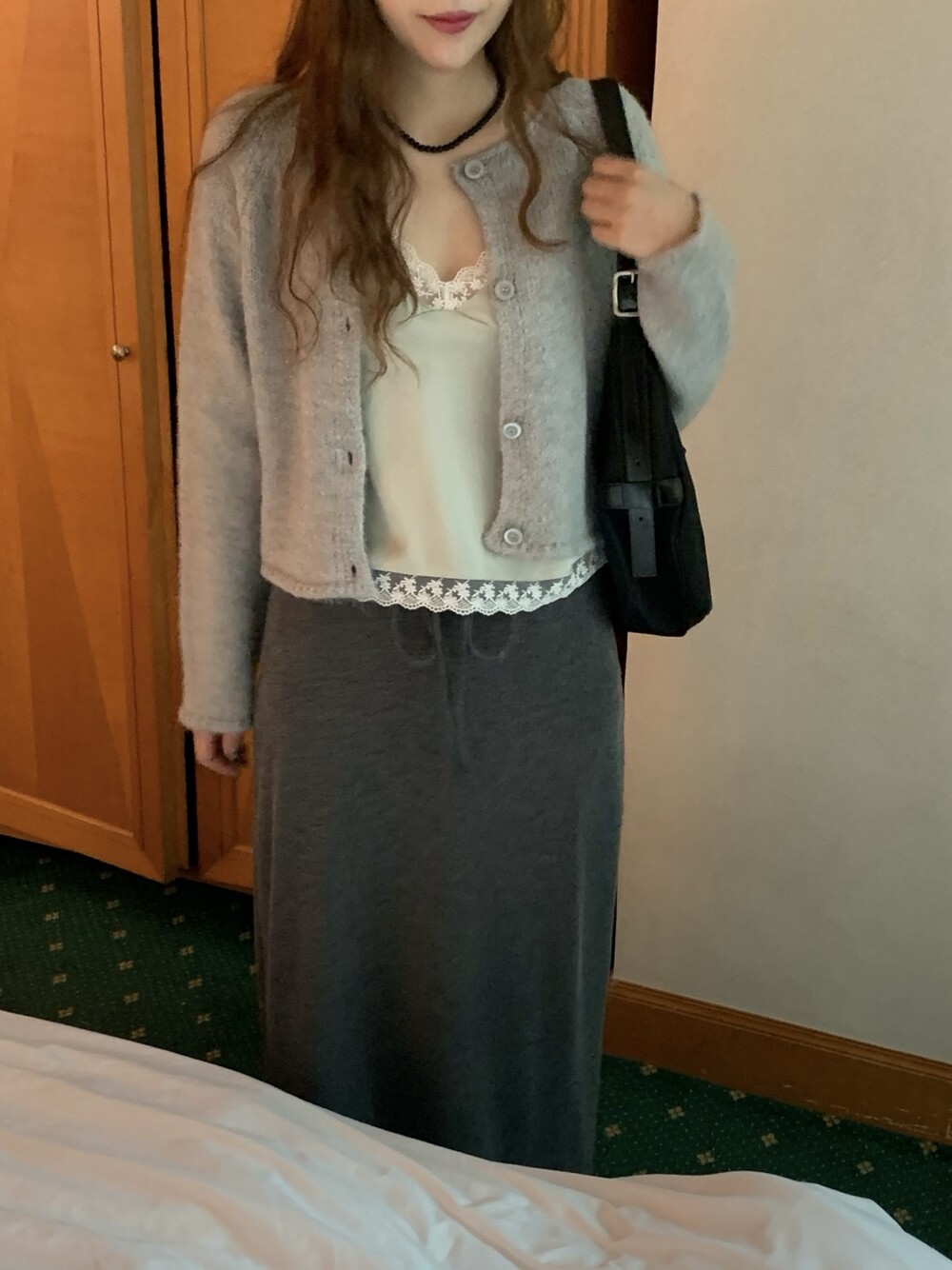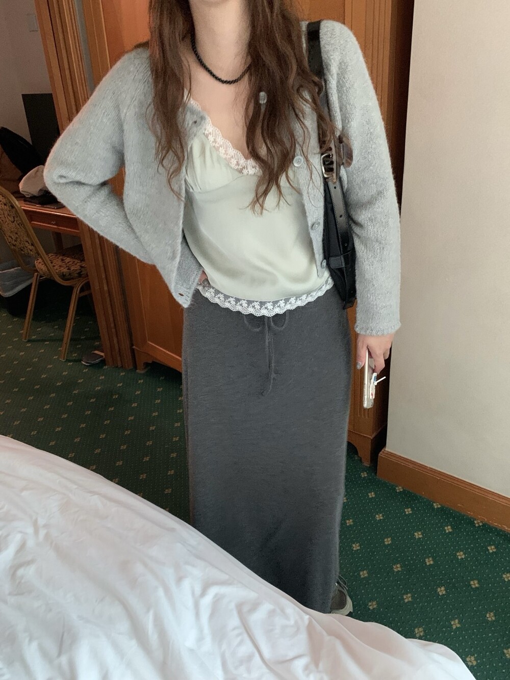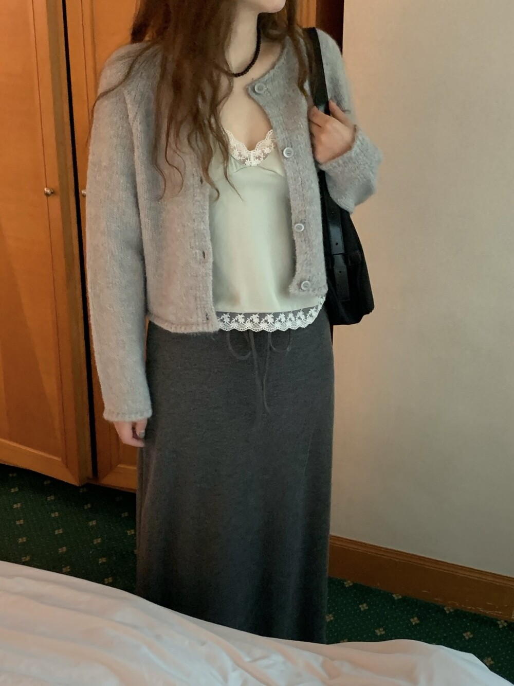 은은한 광택감이 느껴지는 실키한 소재와 정교한 레이스가 조화를 이루어 청순하면서도 빈티지한 무드를 자아내는 뷔스티에입니다. 넥라인과 밑단을 따라 흐르는 레이스 디테일이 확실한 포인트가 되어줍니다.