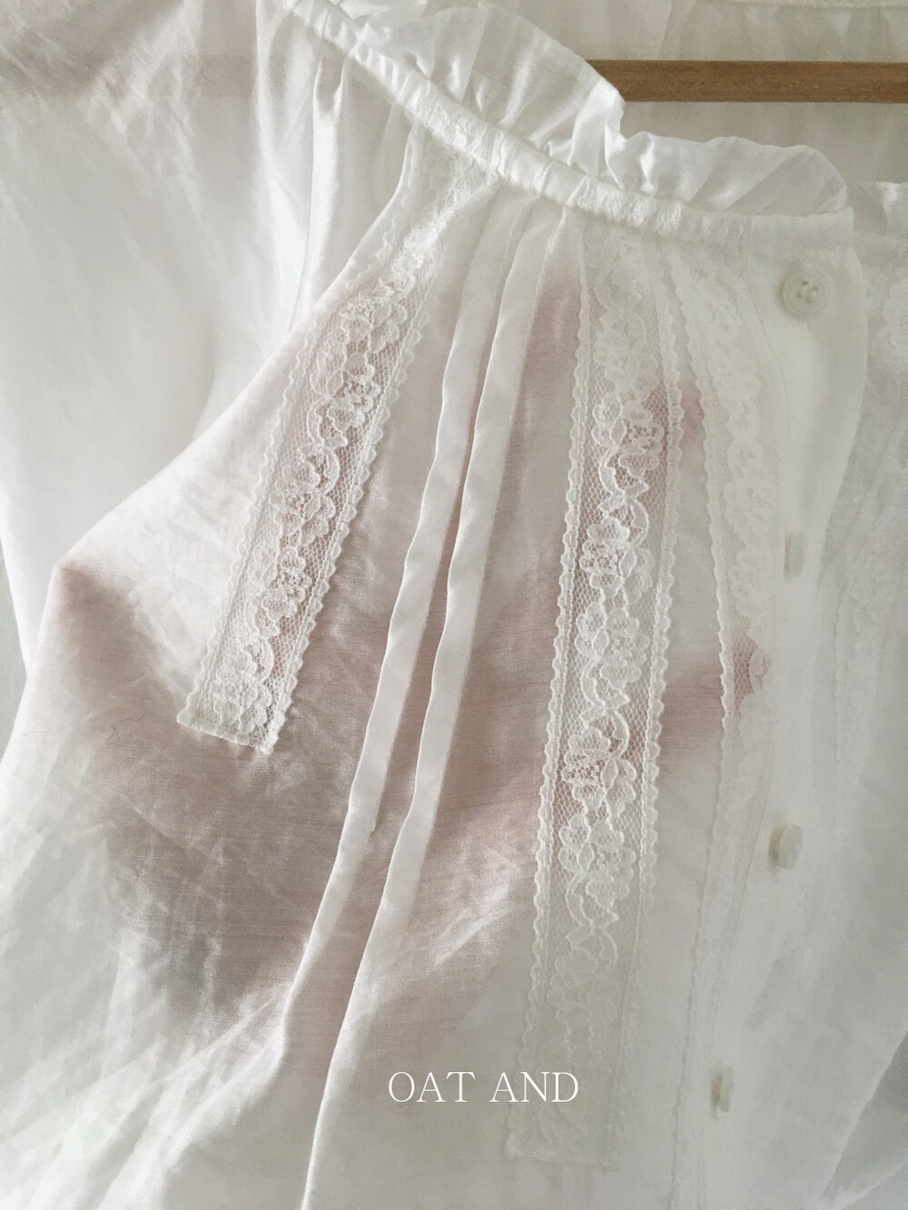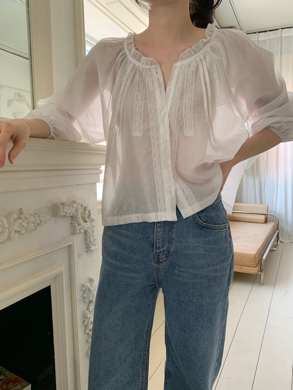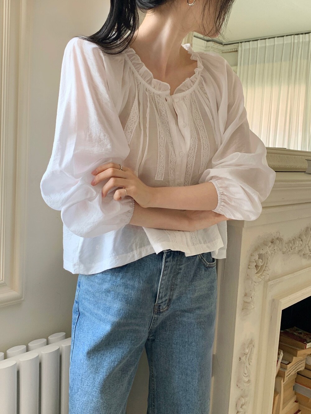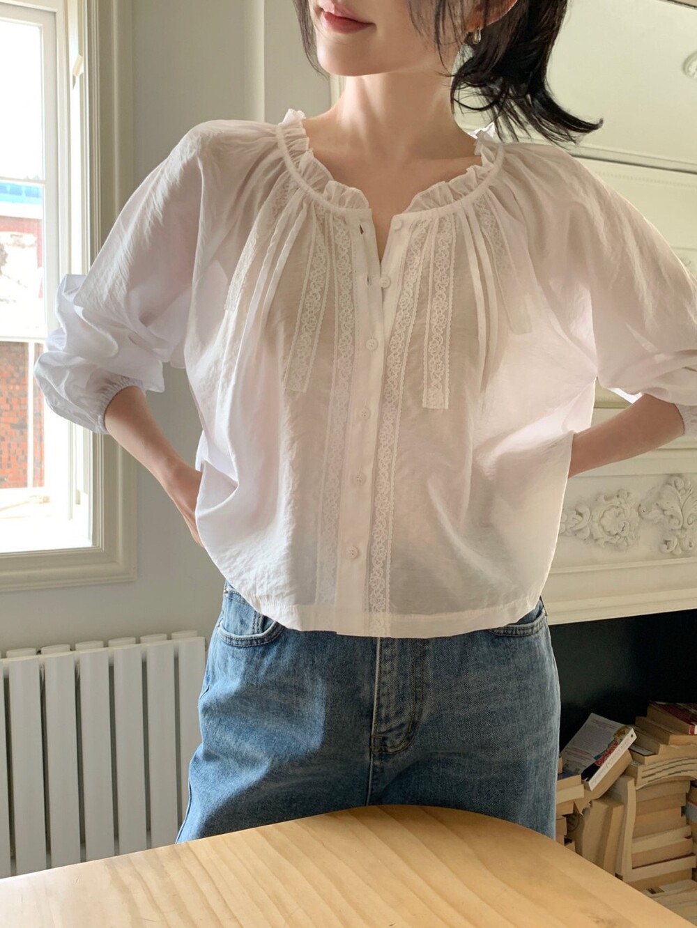 섬세한 레이스 디테일이 돋보이는 블라우스예요. 앞면의 레이스 배합과 핀턱 라인입니다.