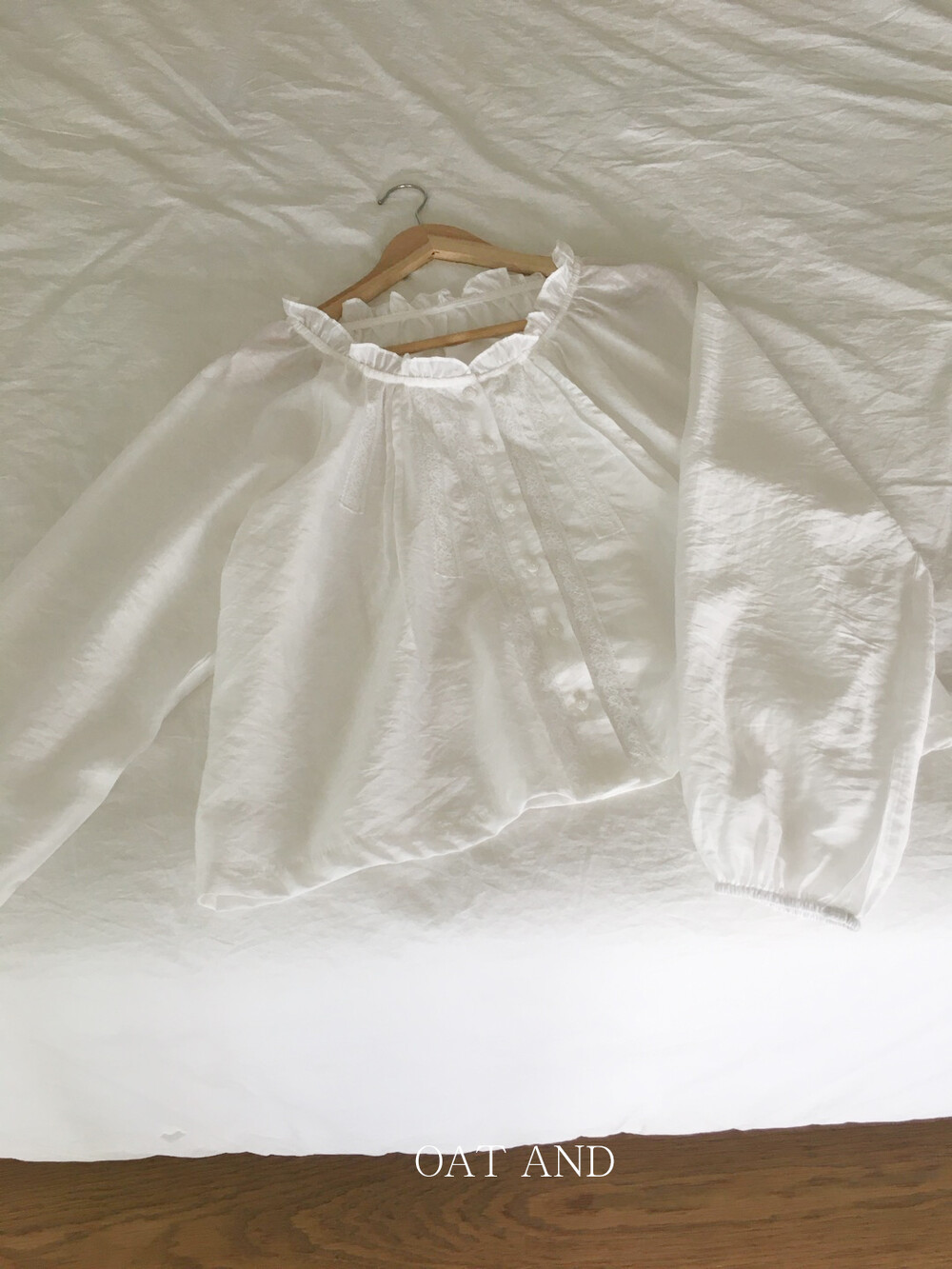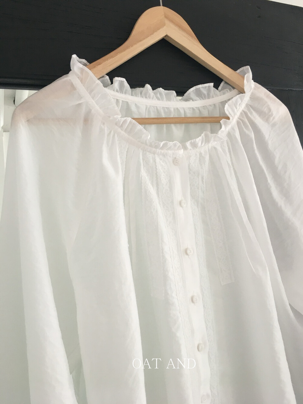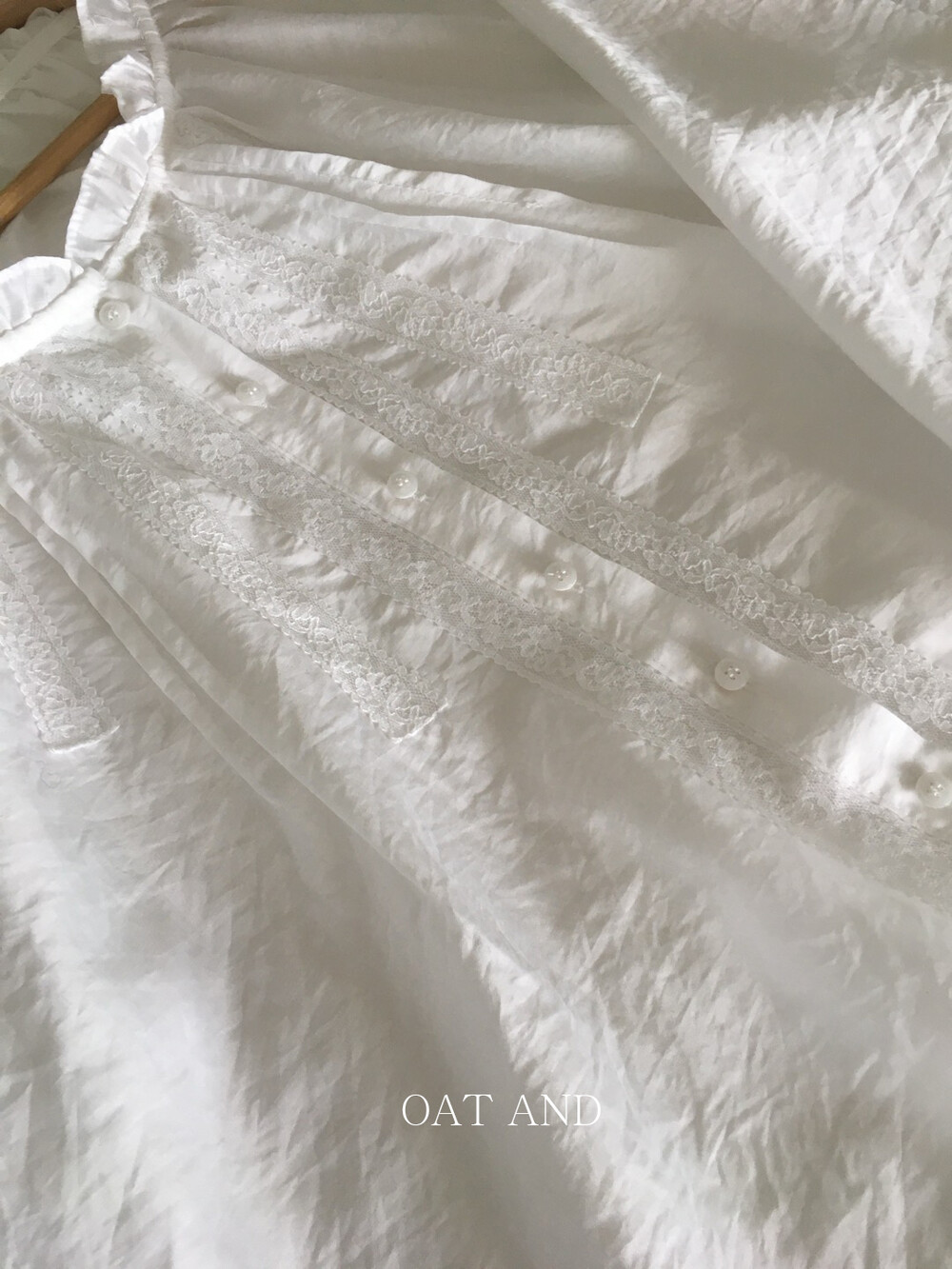 섬세한 레이스 디테일이 돋보이는 블라우스예요. 앞면의 레이스 배합과 핀턱 라인입니다.
