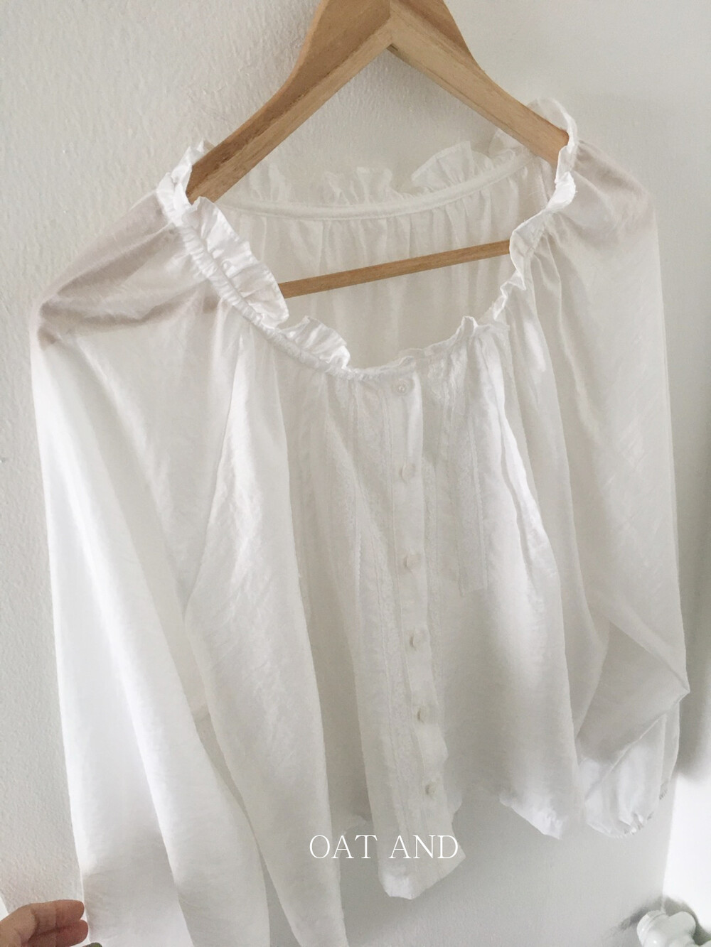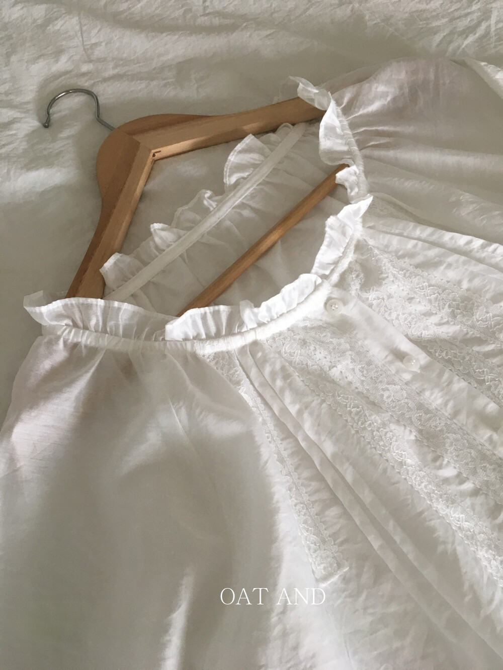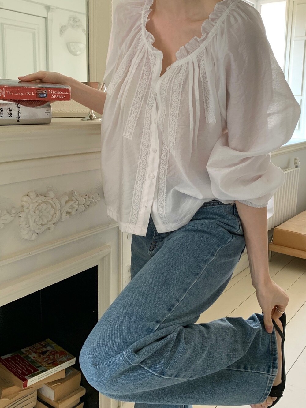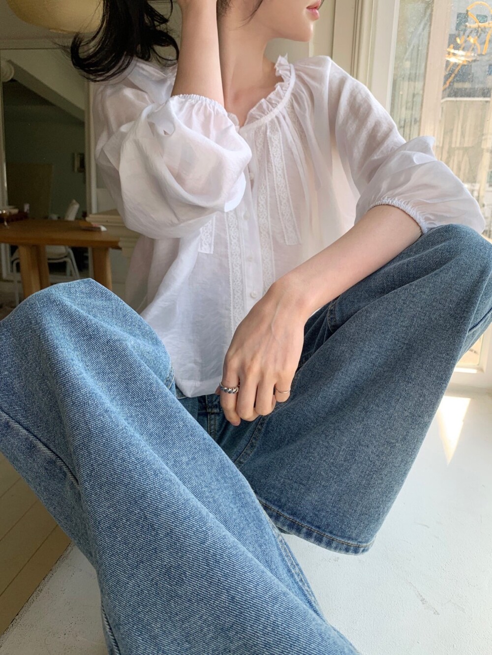 섬세한 레이스 디테일이 돋보이는 블라우스예요. 앞면의 레이스 배합과 핀턱 라인입니다.
