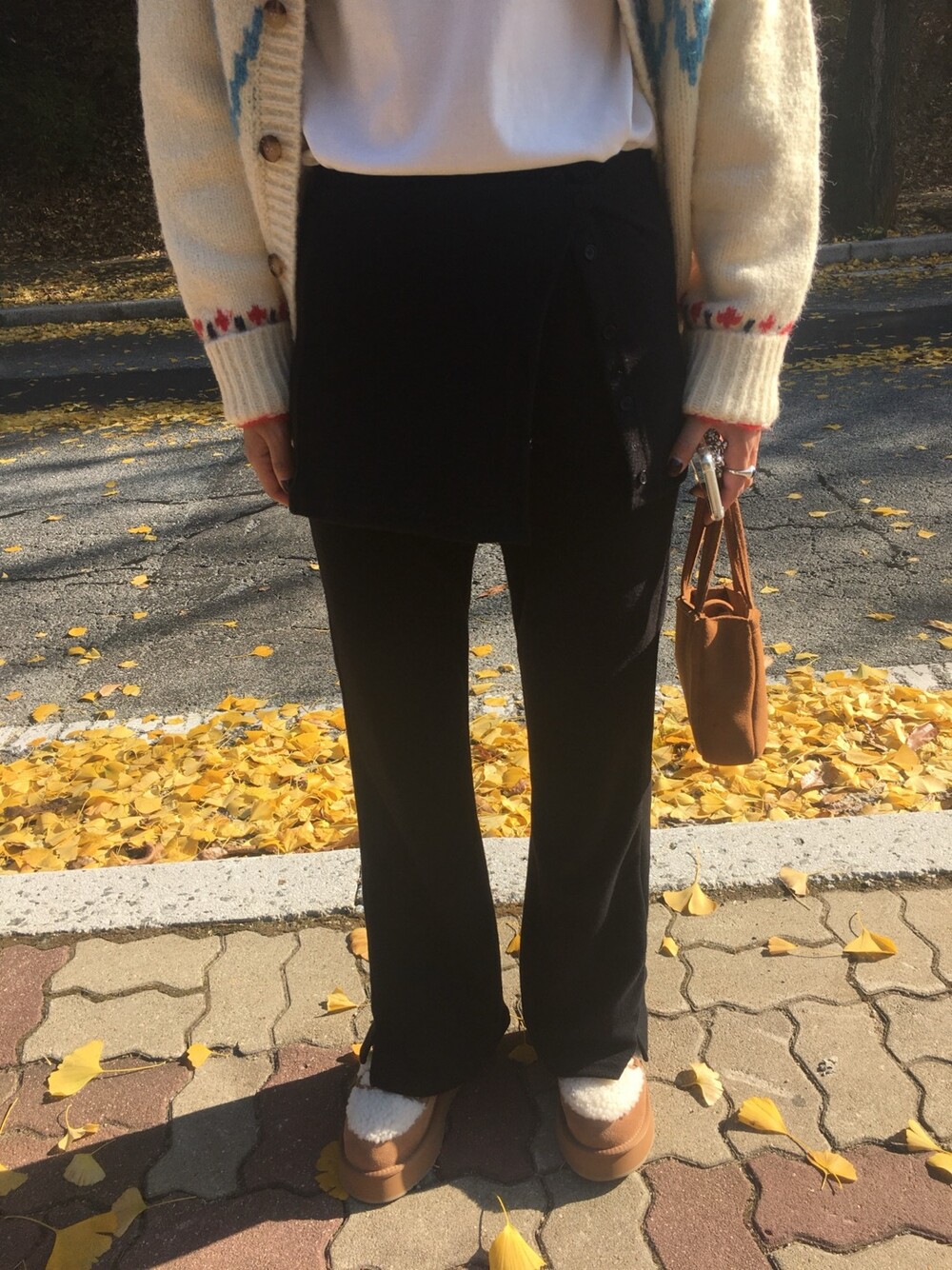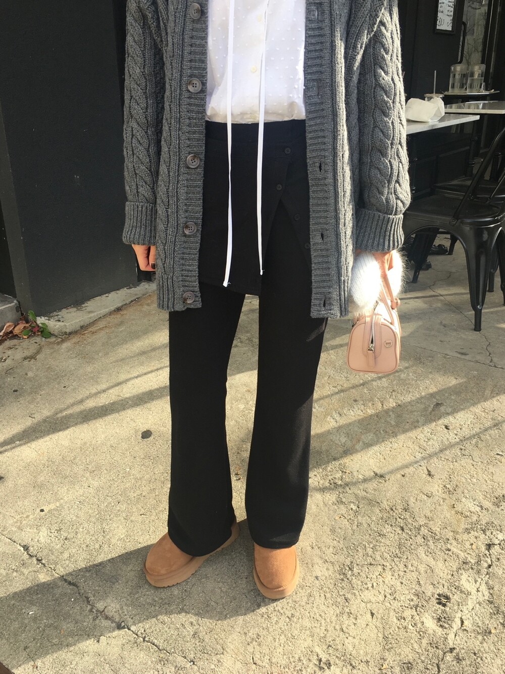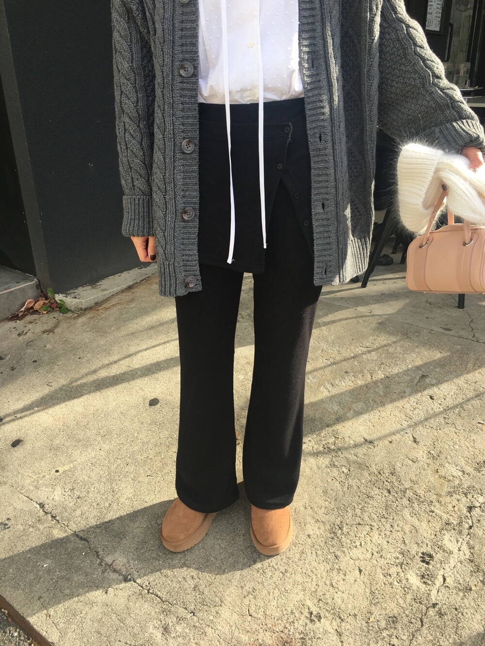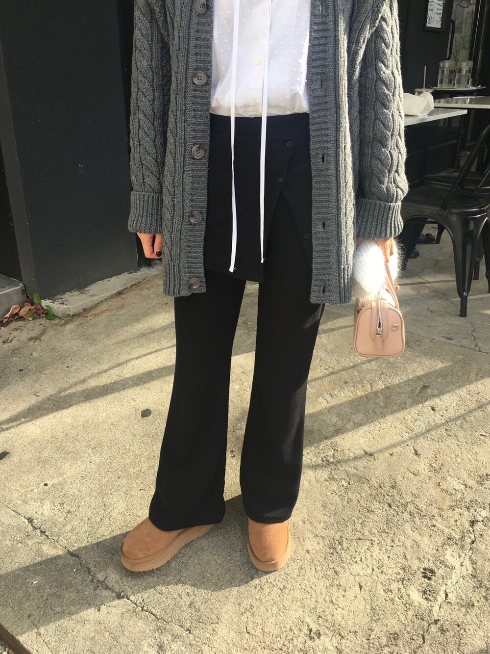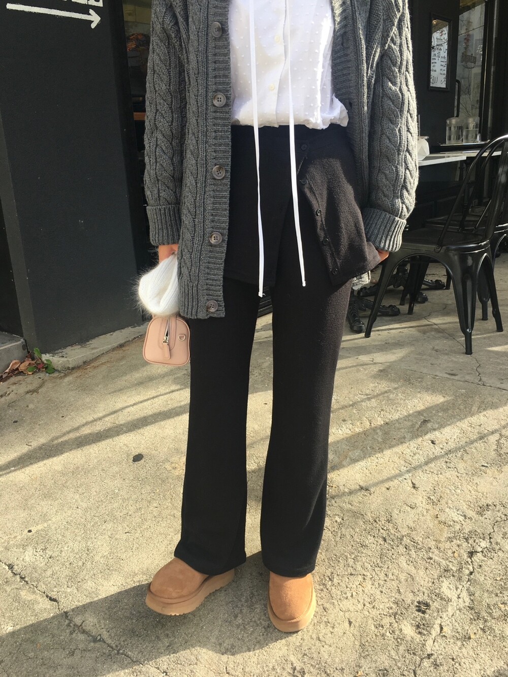 밑단이 넓은 형태의 부츠컷라인으로 다리가 정말 길고 날씬해보이는 효과가 아주 큰 제품이에요.