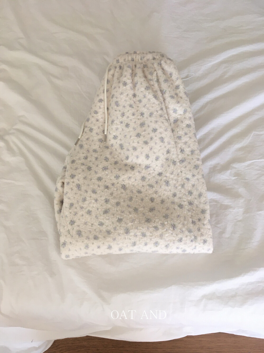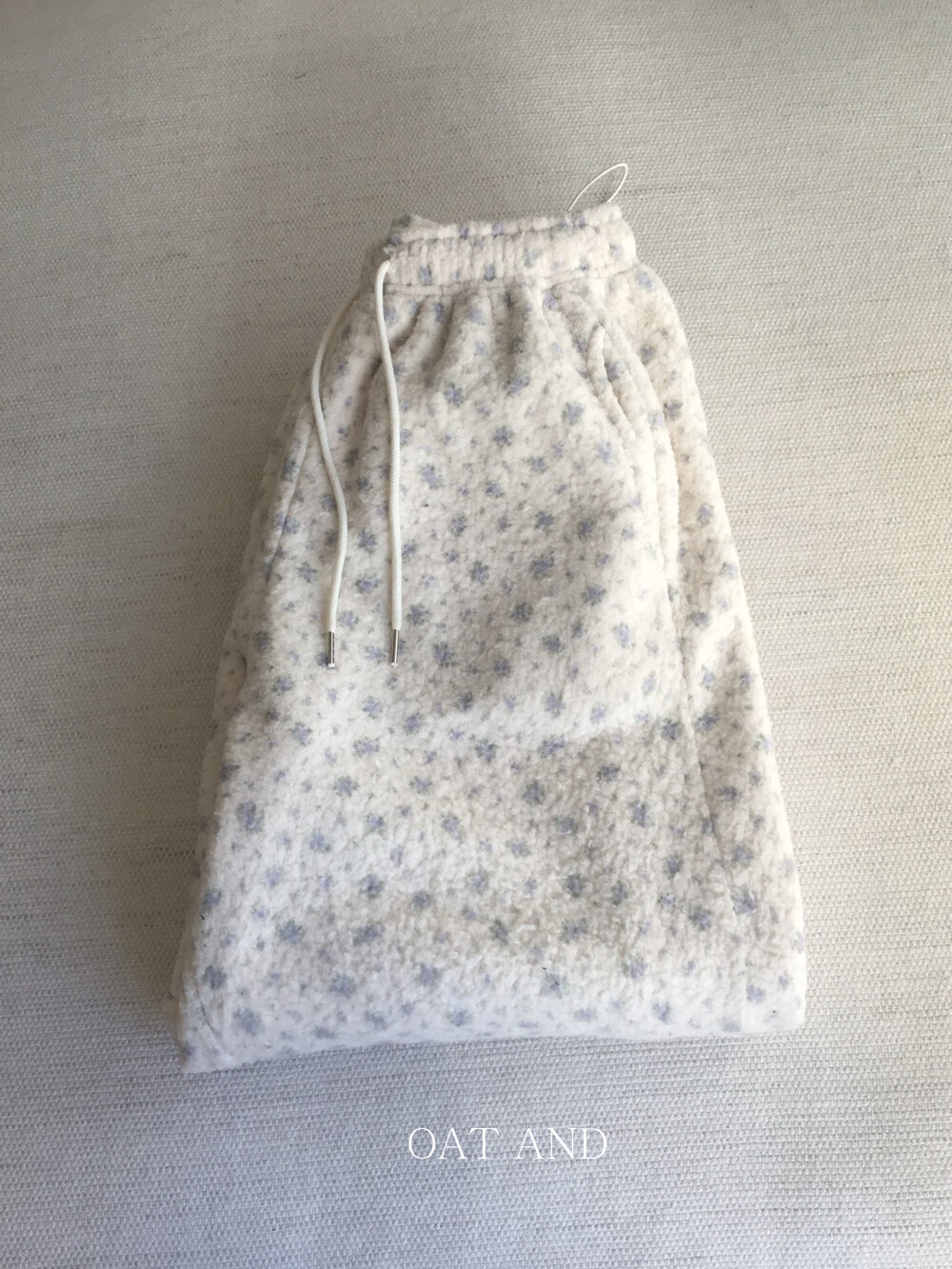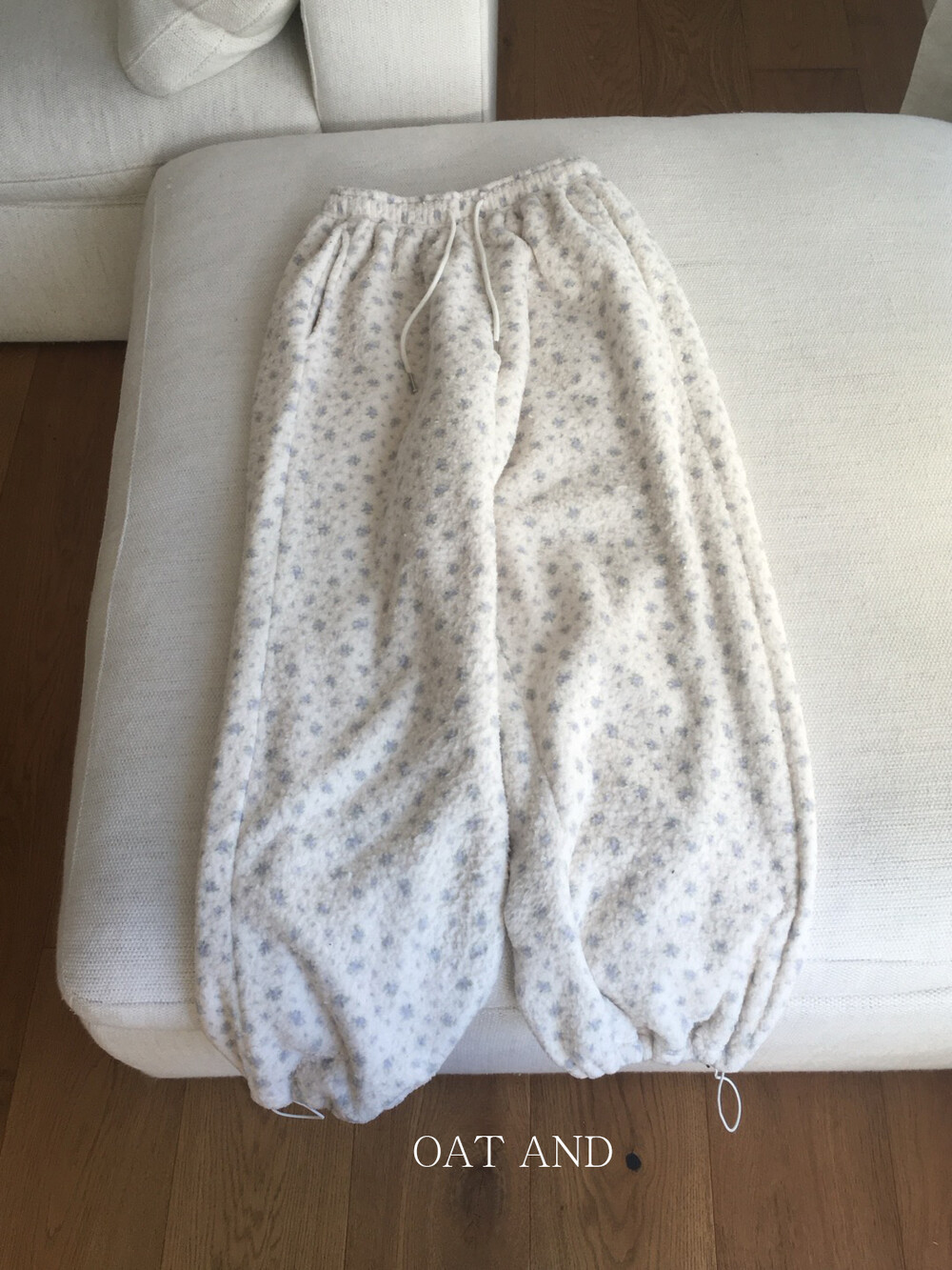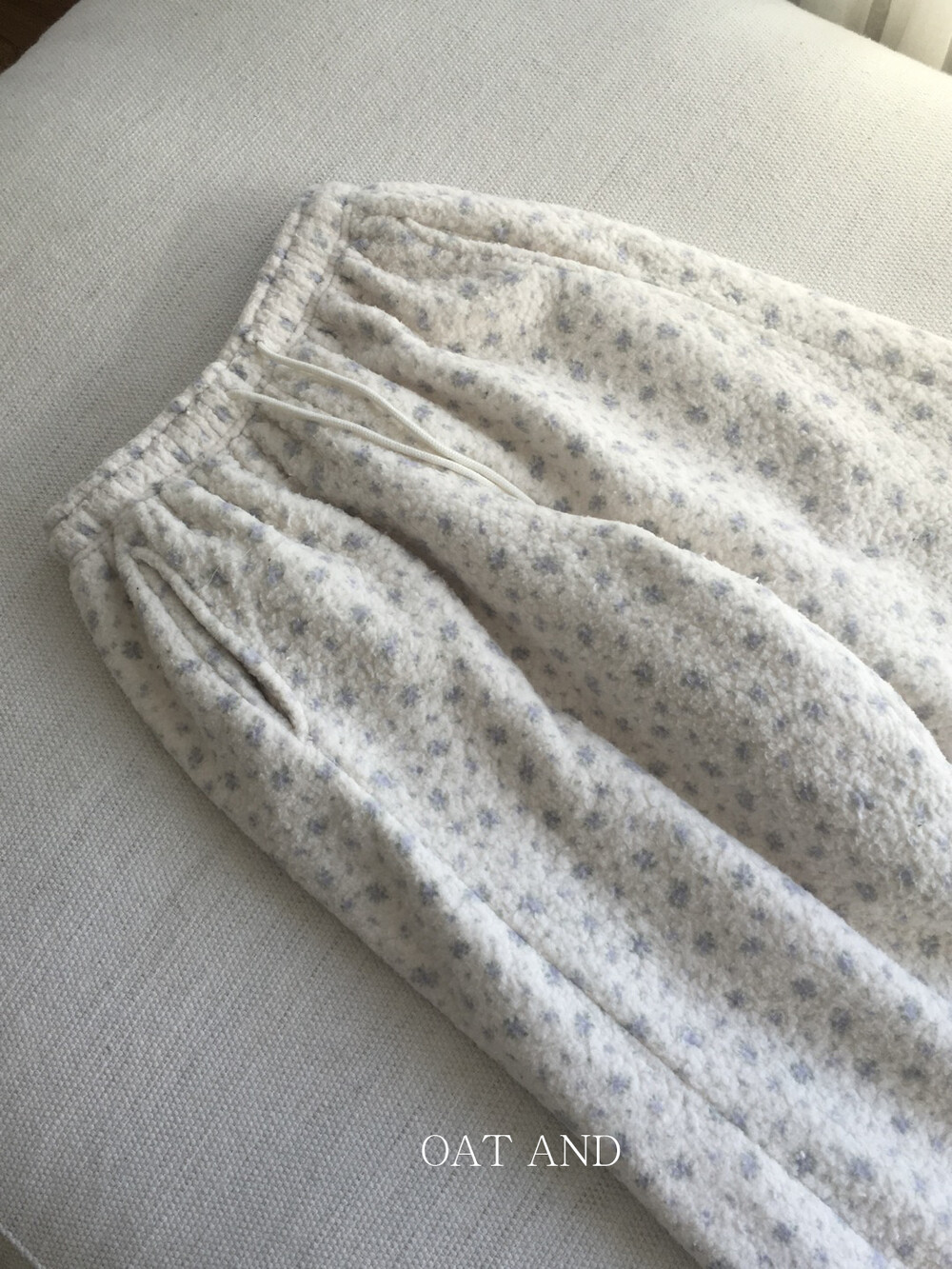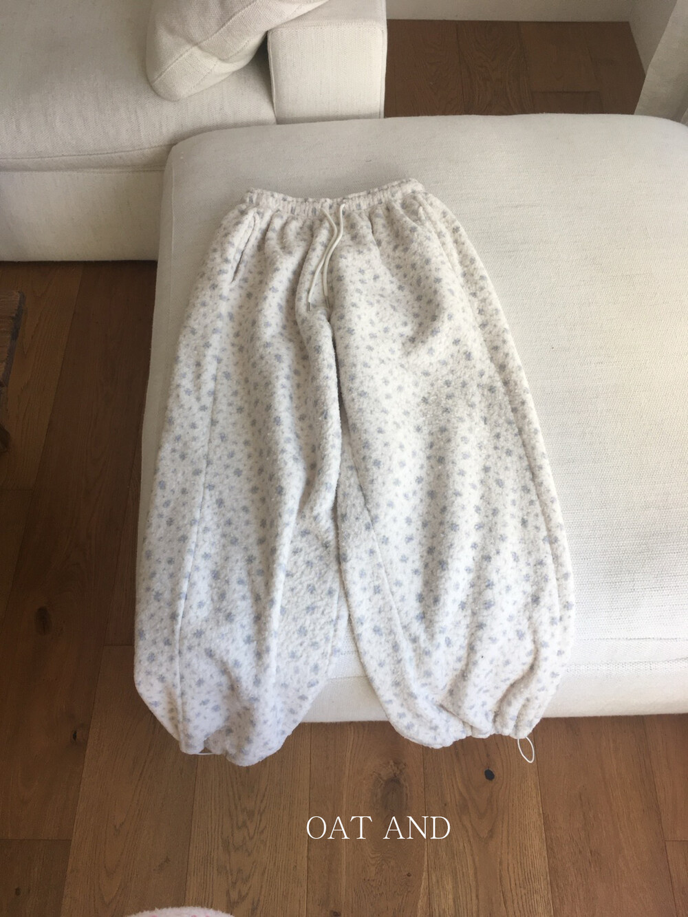 라벤더톤 잔꽃 패턴이 은은하게 들어간, 겨울에 딱 좋은 포근한 보아 소재 조거 팬츠예요.