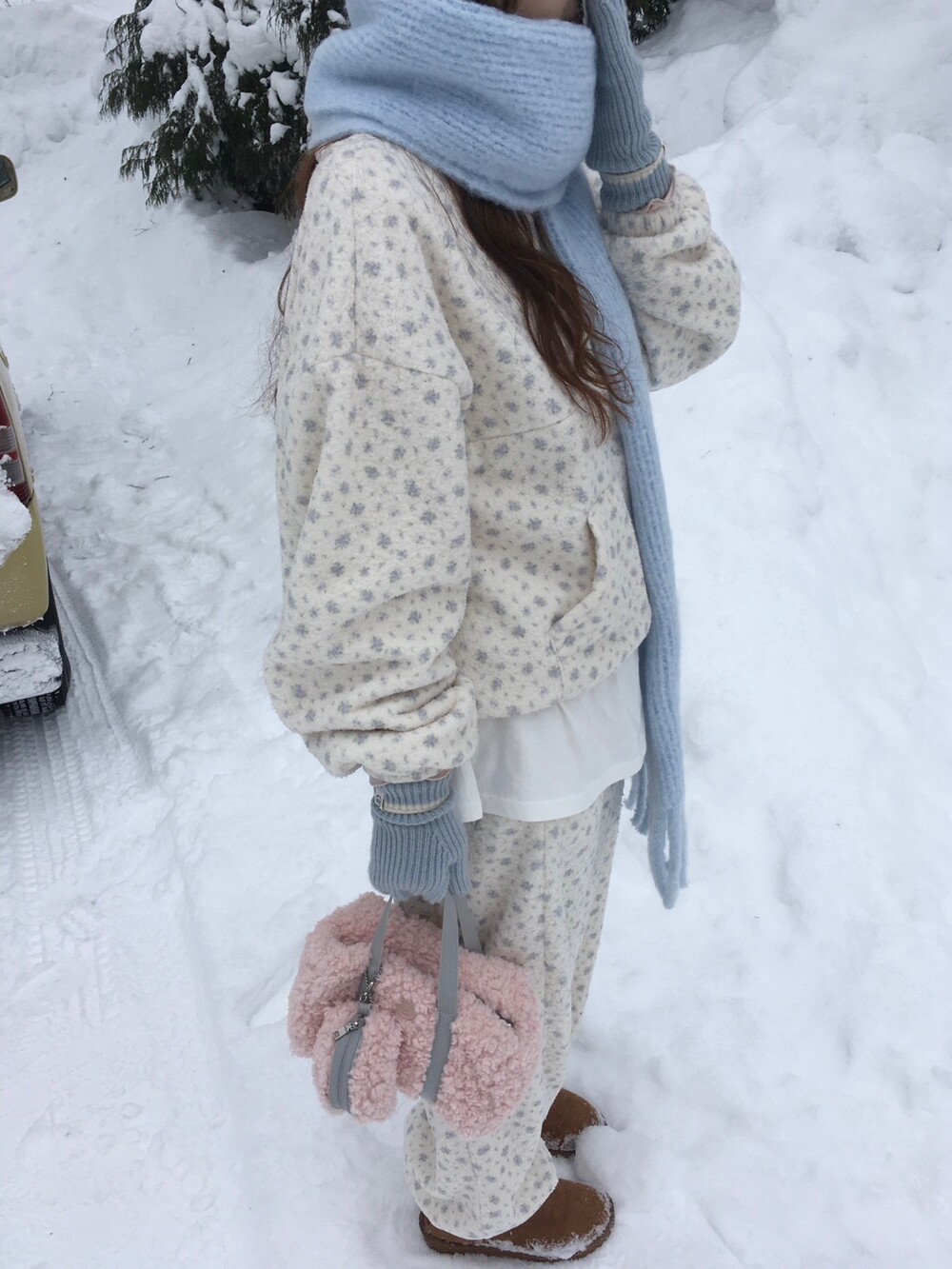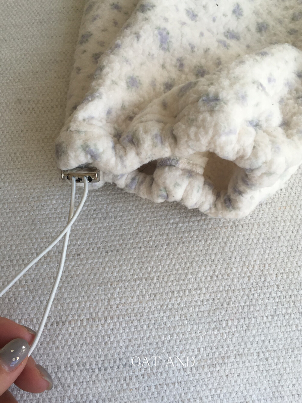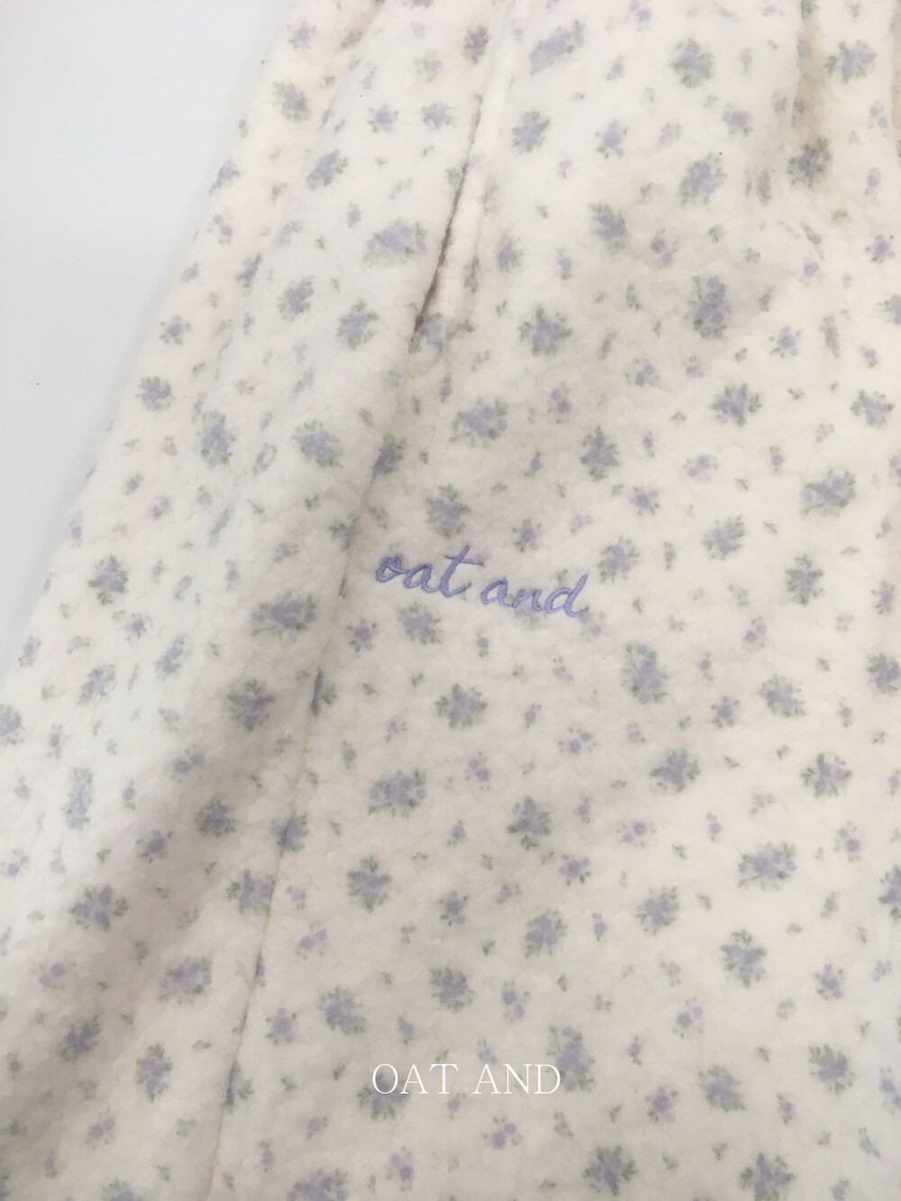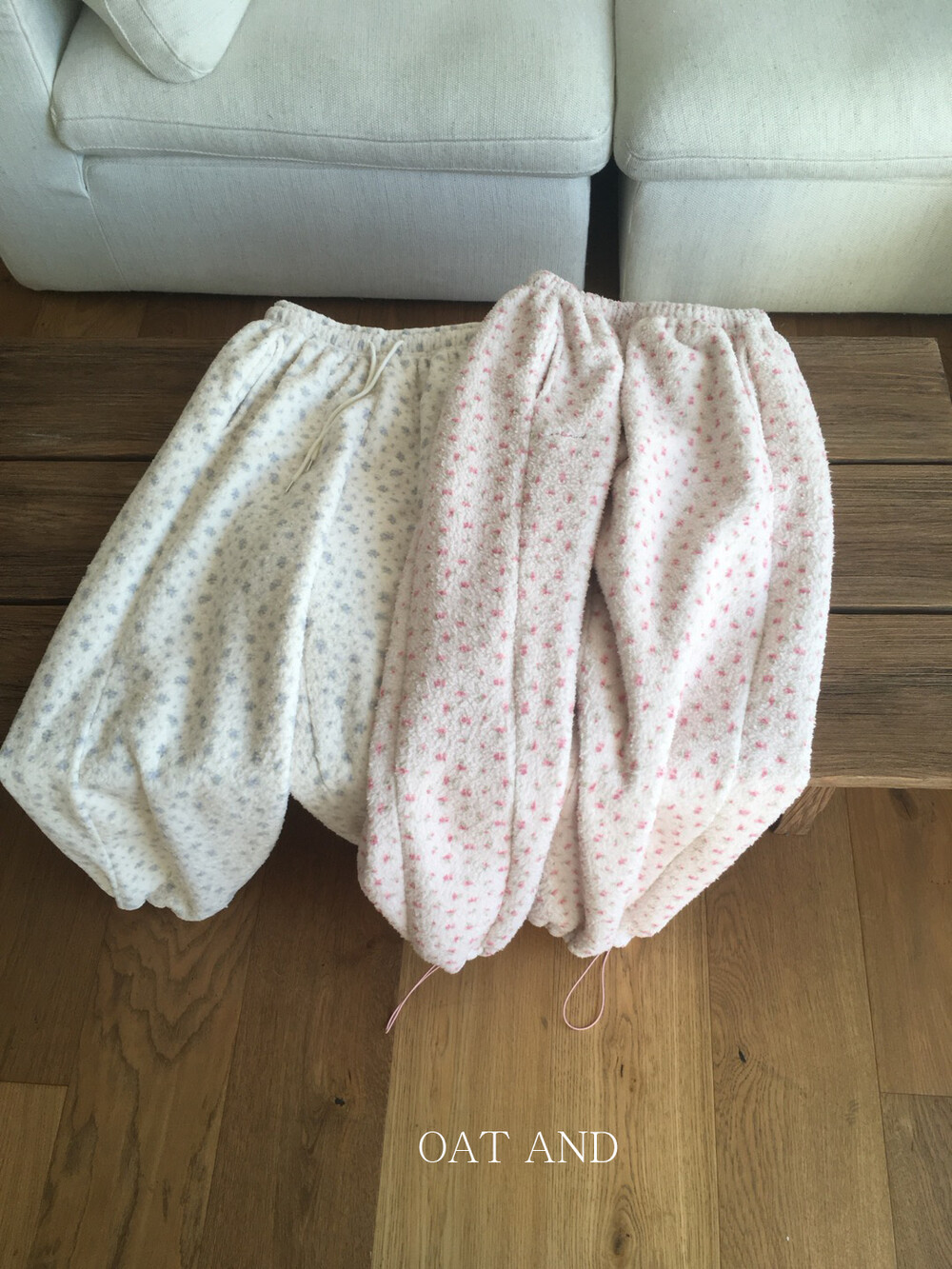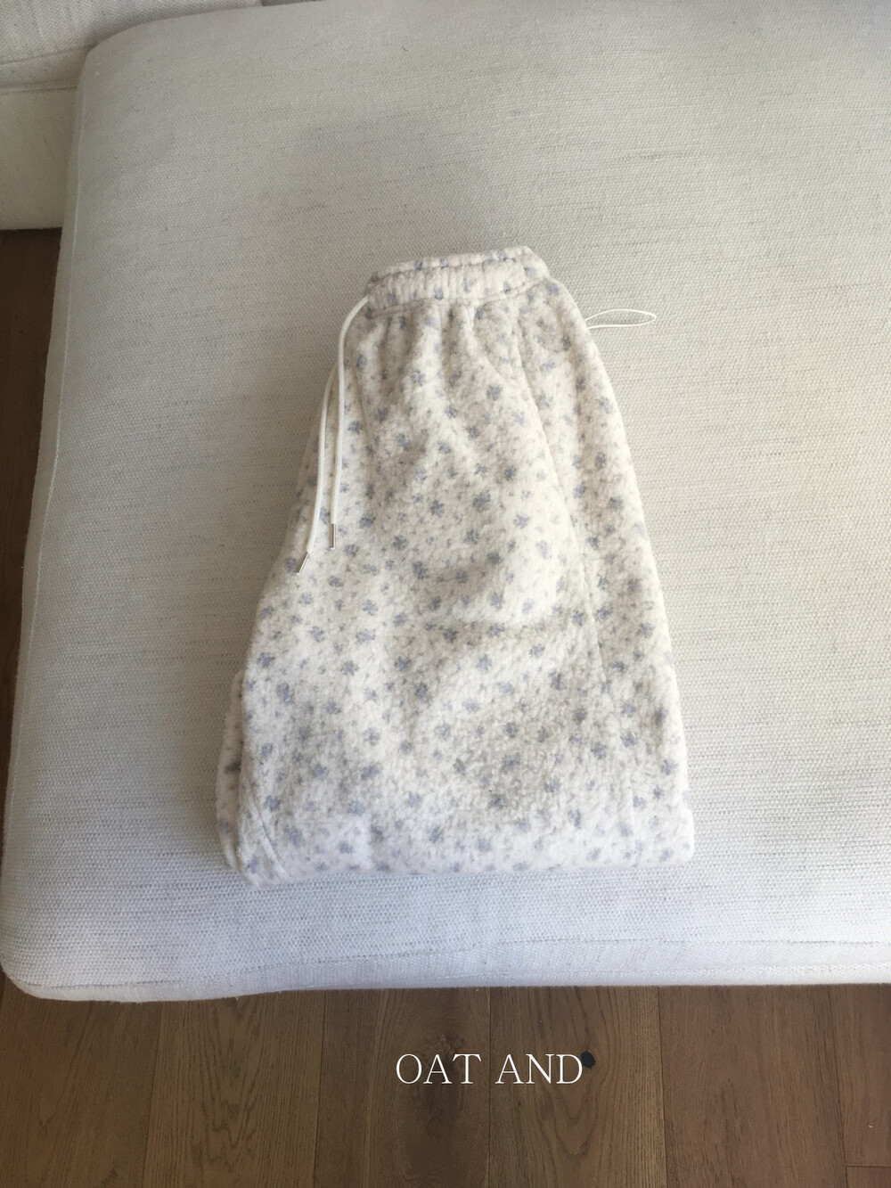 라벤더톤 잔꽃 패턴이 은은하게 들어간, 겨울에 딱 좋은 포근한 보아 소재 조거 팬츠예요.
